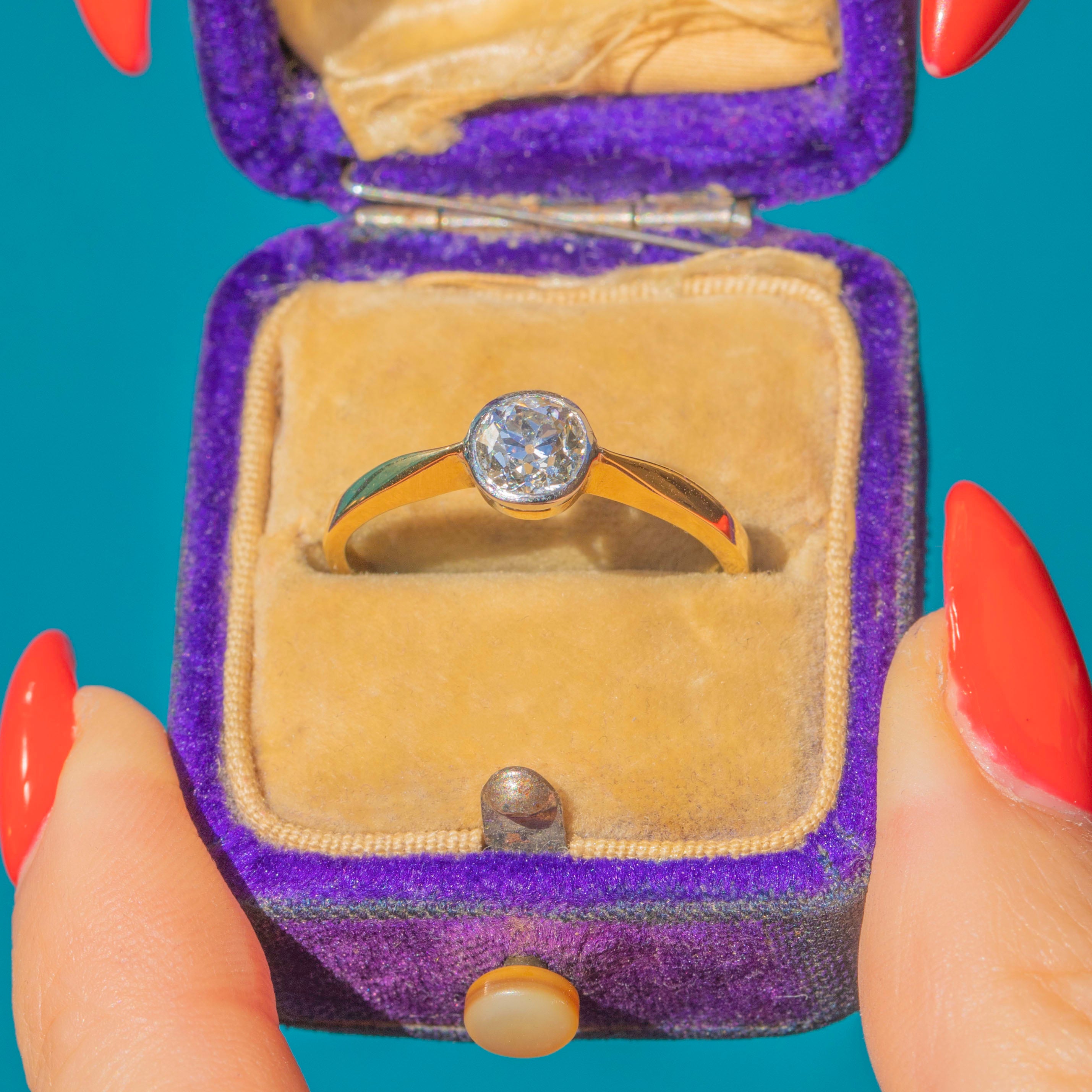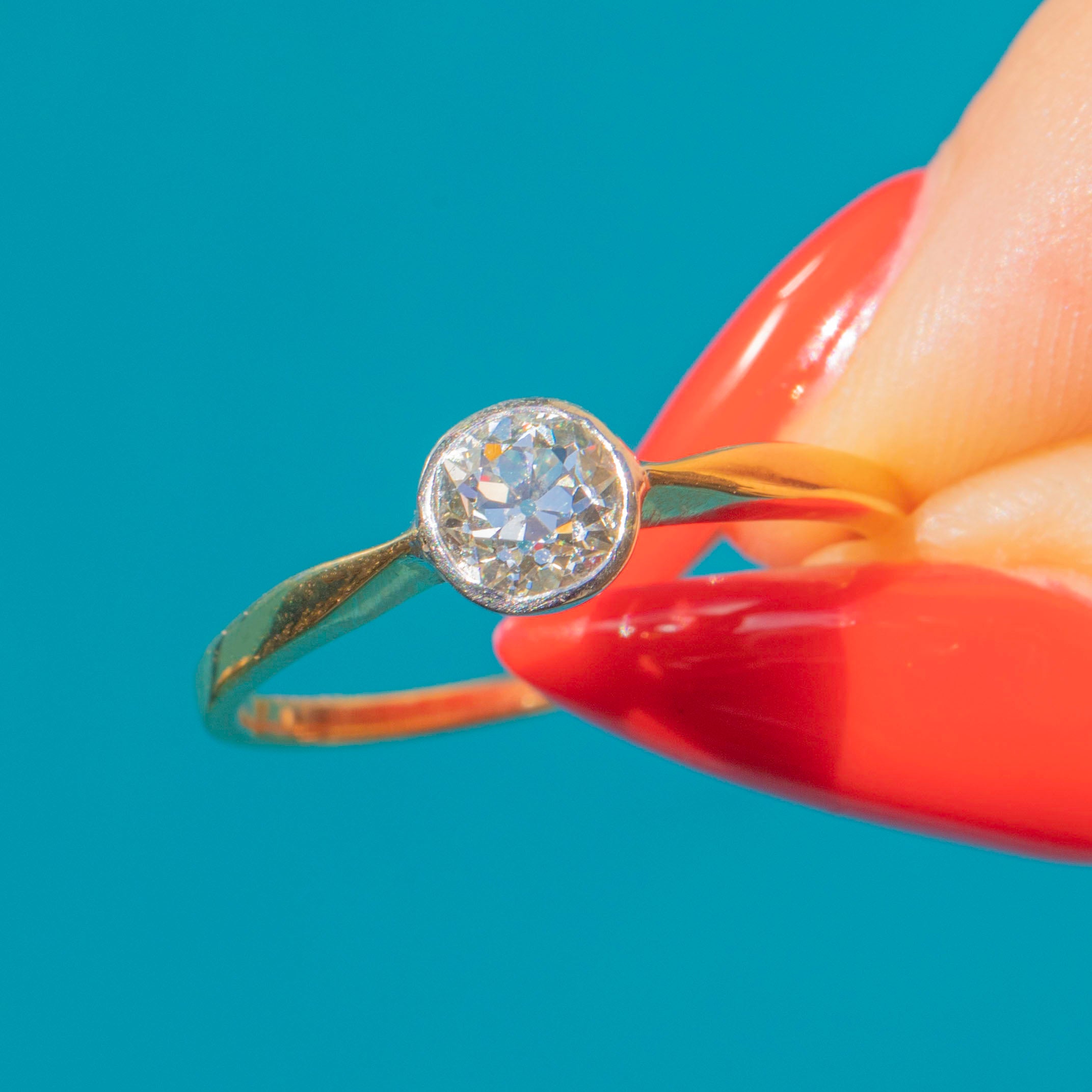 VERY GOOD-EXCELLENT. This Art Deco 18ct Gold bezel-set Diamond solitaire ring is quite the find with an astoundingly rare 0.80ct old European Diamond! The ring is stunning, inlaid with a bright and sparkly old-European cut Diamond in perfect condition with no chips, or abrasion of any kind.