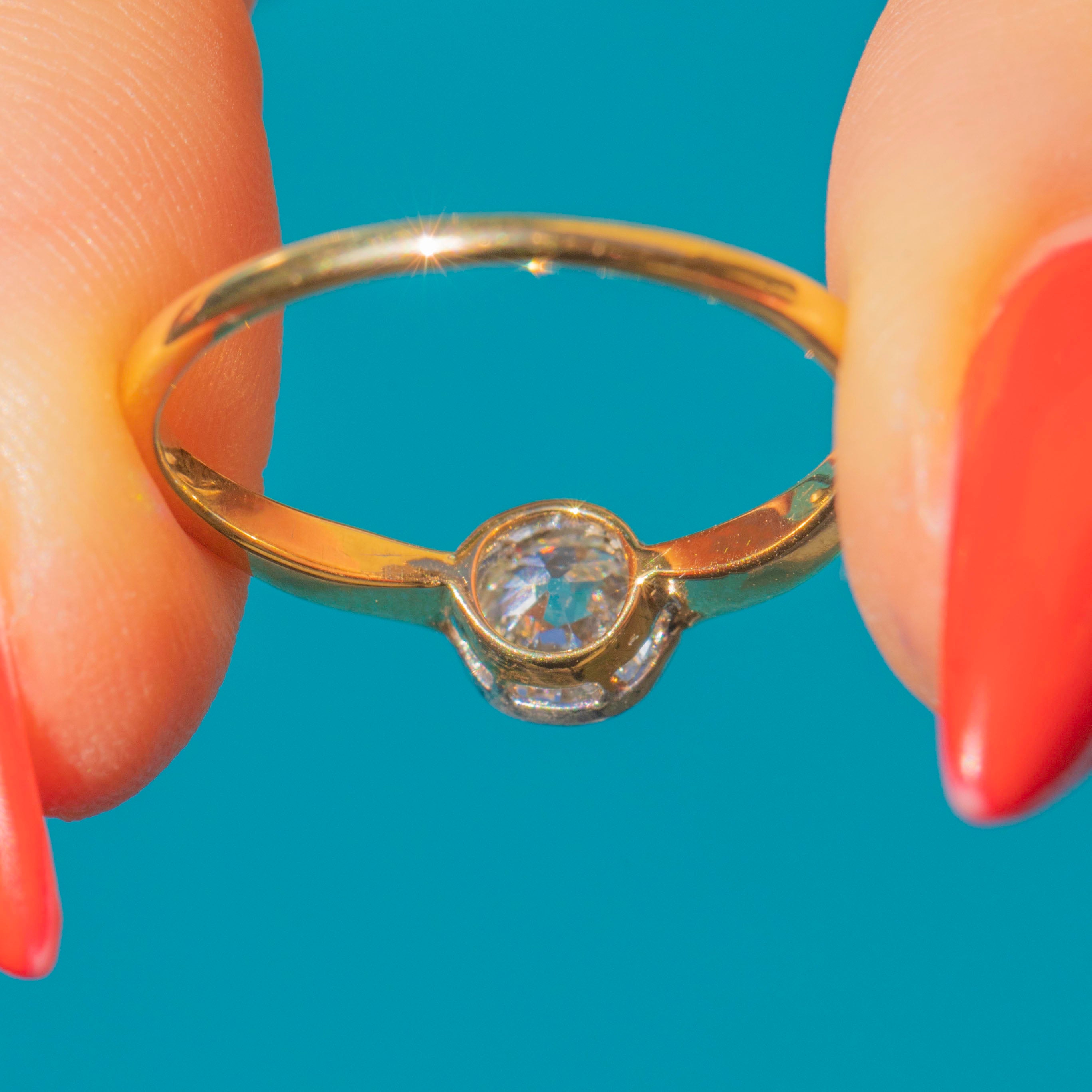 MATERIALS: Tests as 18ct Yellow Gold, Platinum settings, Old-European Diamond (0.80ct, J Colour, Si1 Clarity).