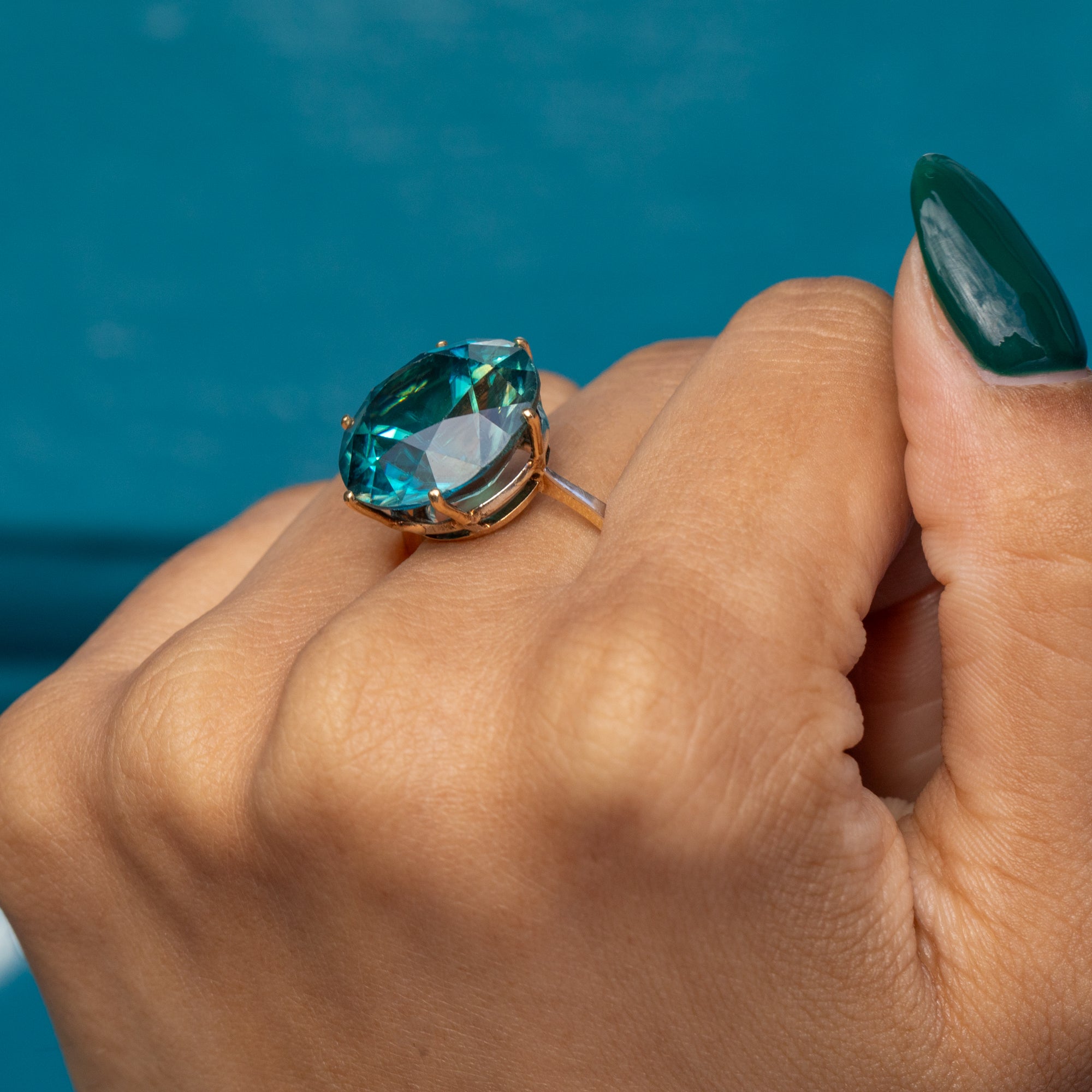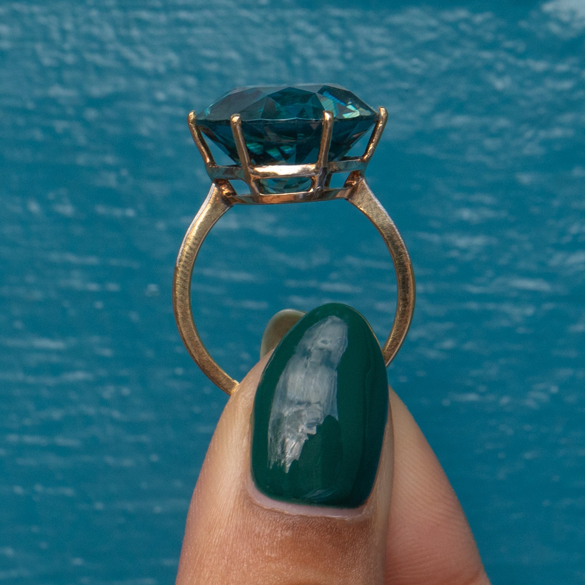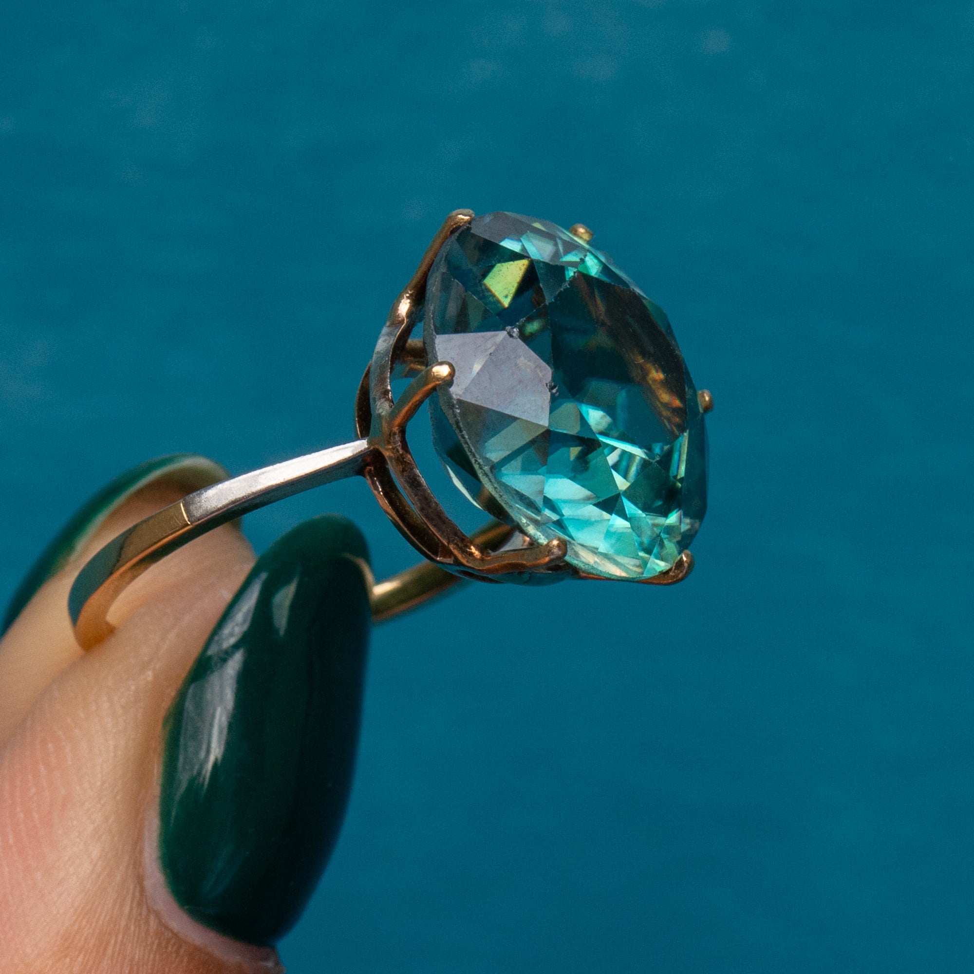 Smooth and glossy, the 18ct Gold band is the perfect balance of elegance and simplicity to compliment the outstanding 15.00ct Zircon, providing an incredible profile and wonderful finger coverage. A versatile and dynamic piece, this antique cocktail ring is the perfect piece to add a show-stopping edge to any look!