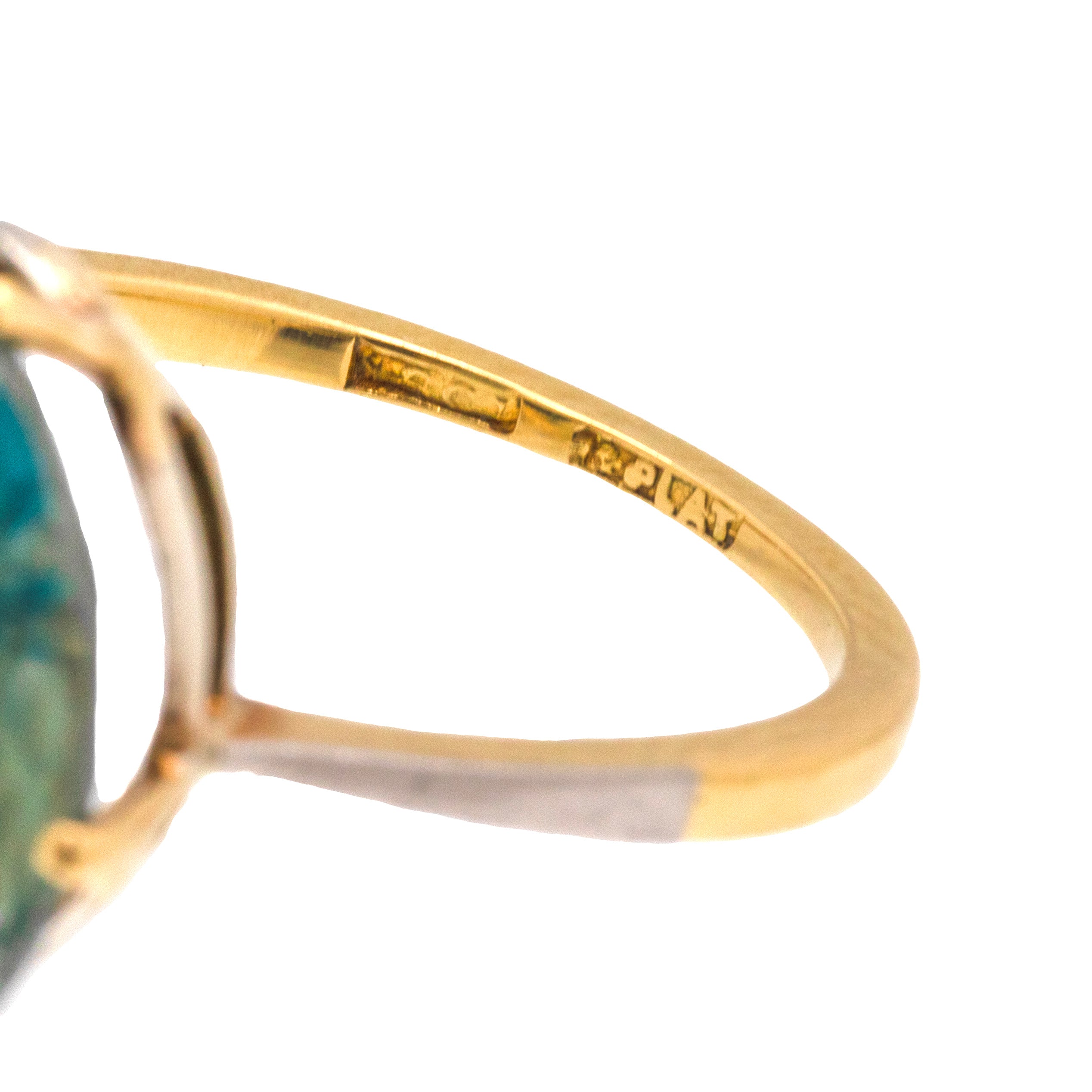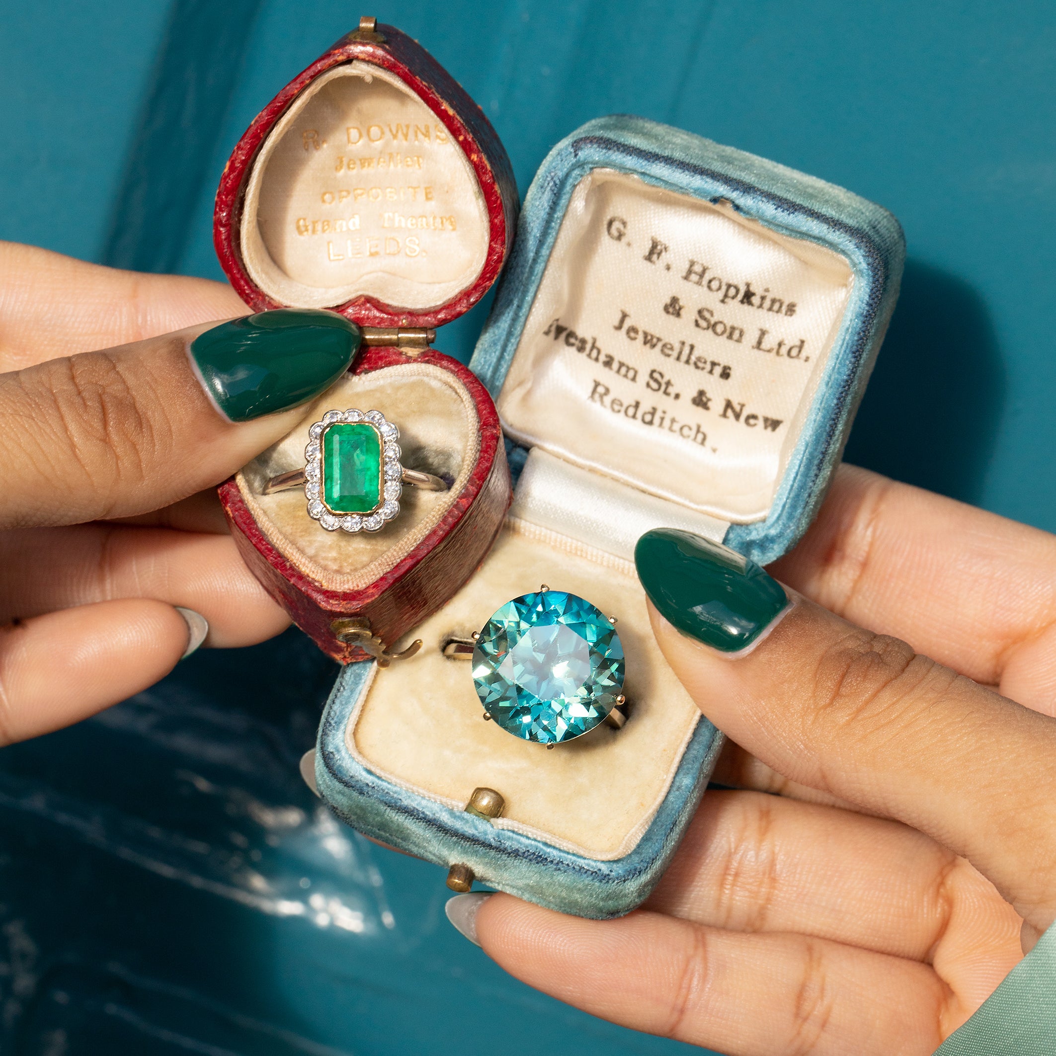 EXCELLENT. It is our pleasure to report that this stunning Art Deco 18ct Gold Blue Zircon cocktail ring is in excellent condition. The Zircon has a crisp set of facets and is completely free from chips or abrasions, which is quite remarkable when considering her grand age! With Zircon being a softer gem, this ring is best kept for special occasions rather than everyday wear. The 18ct Gold band is smooth and free from wear and her settings hold the impressively large and scintillating 15ct Blue Zircon securely, allowing you to wear it with confidence!