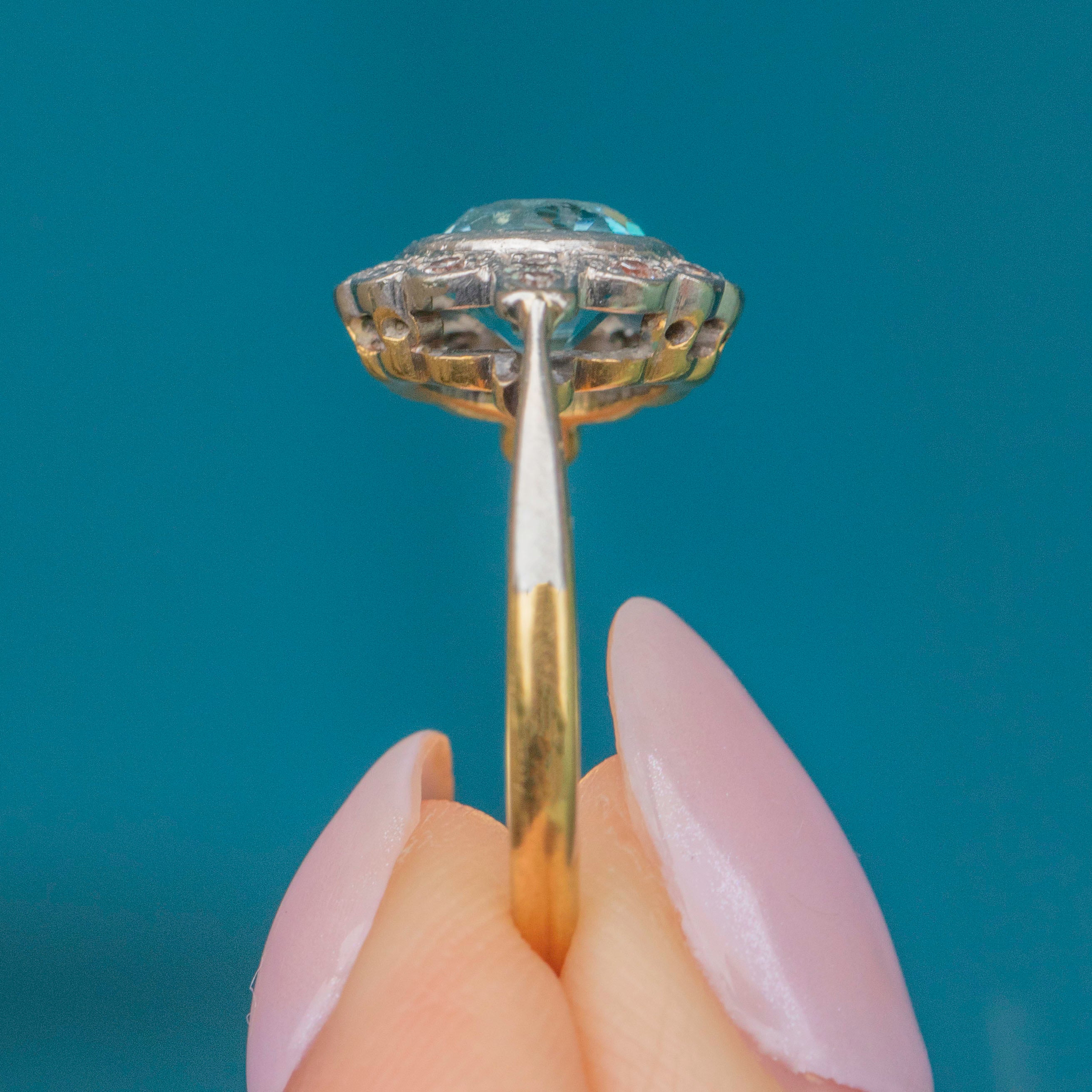 Art Deco 18ct Gold Blue Zircon Diamond Cluster Ring 2.15ct Zircon