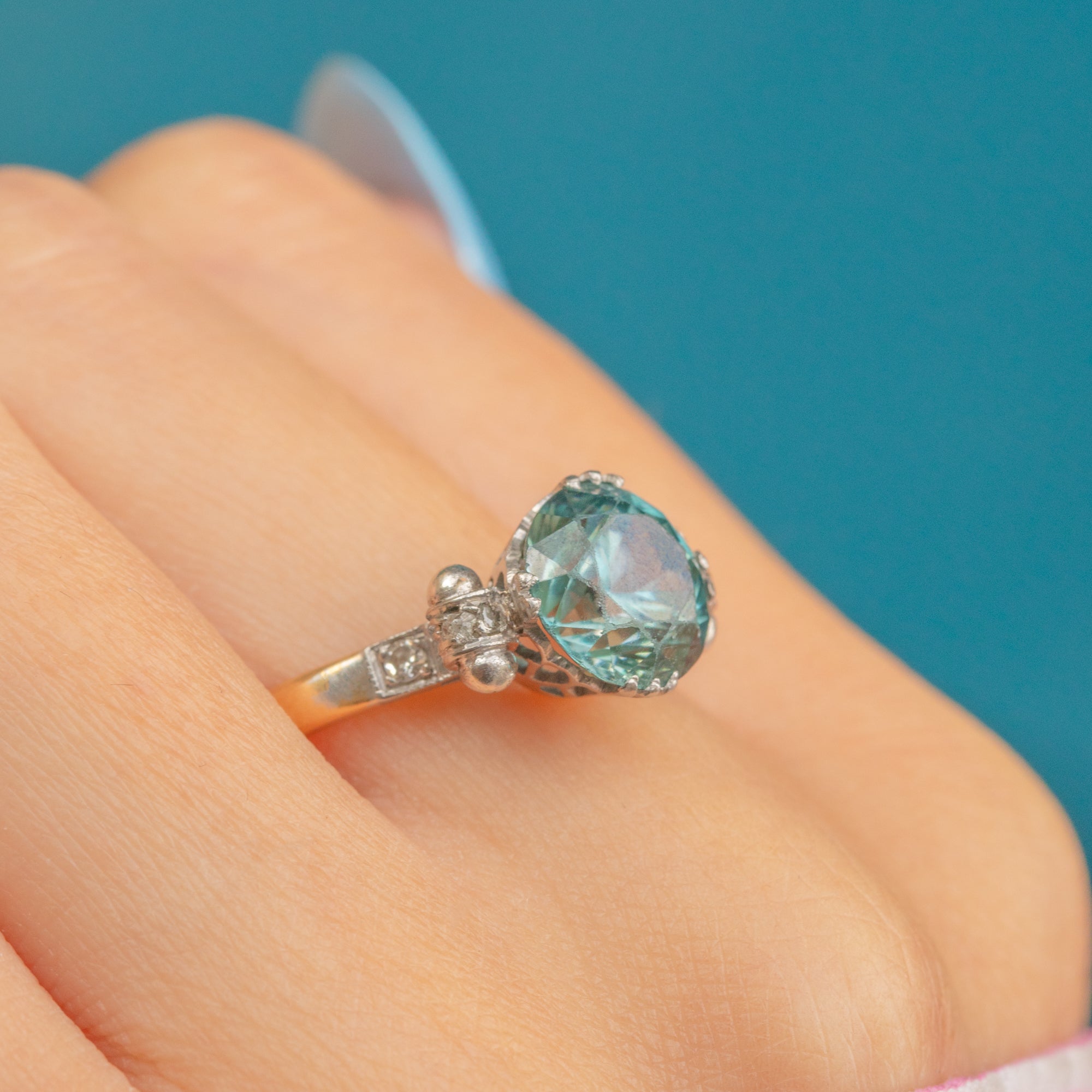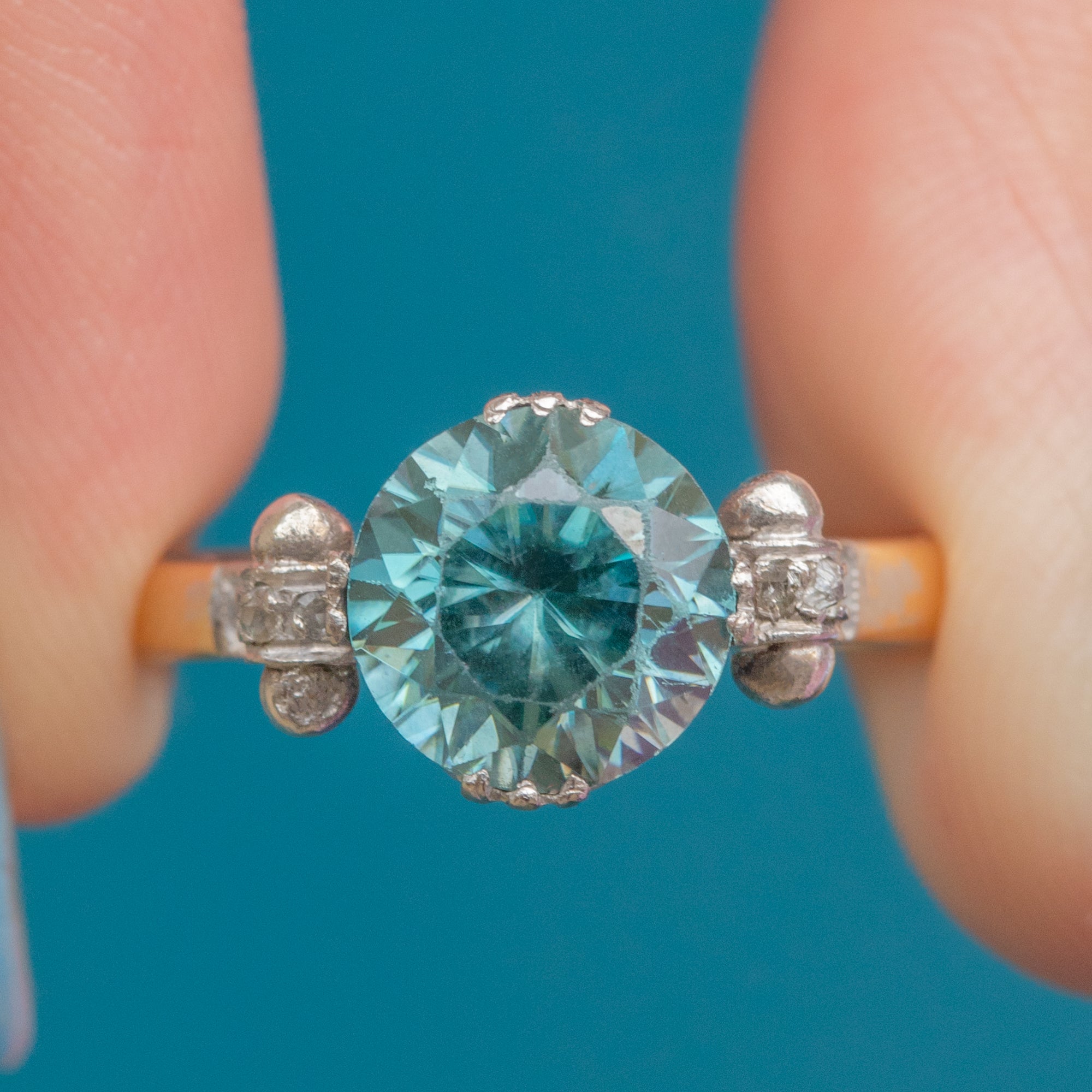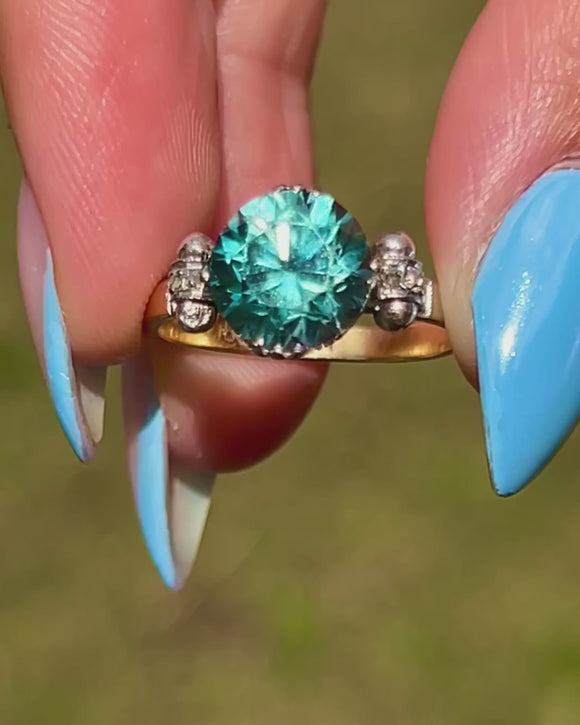 This striking antique Zircon ring exudes Deco elegance! Crafted from sumptuous 18ct Gold and inlaid with an icy blue 2.90ct Zircon flanked by scintillating Diamonds, this Art Deco ring will make an impact adorning your hand.