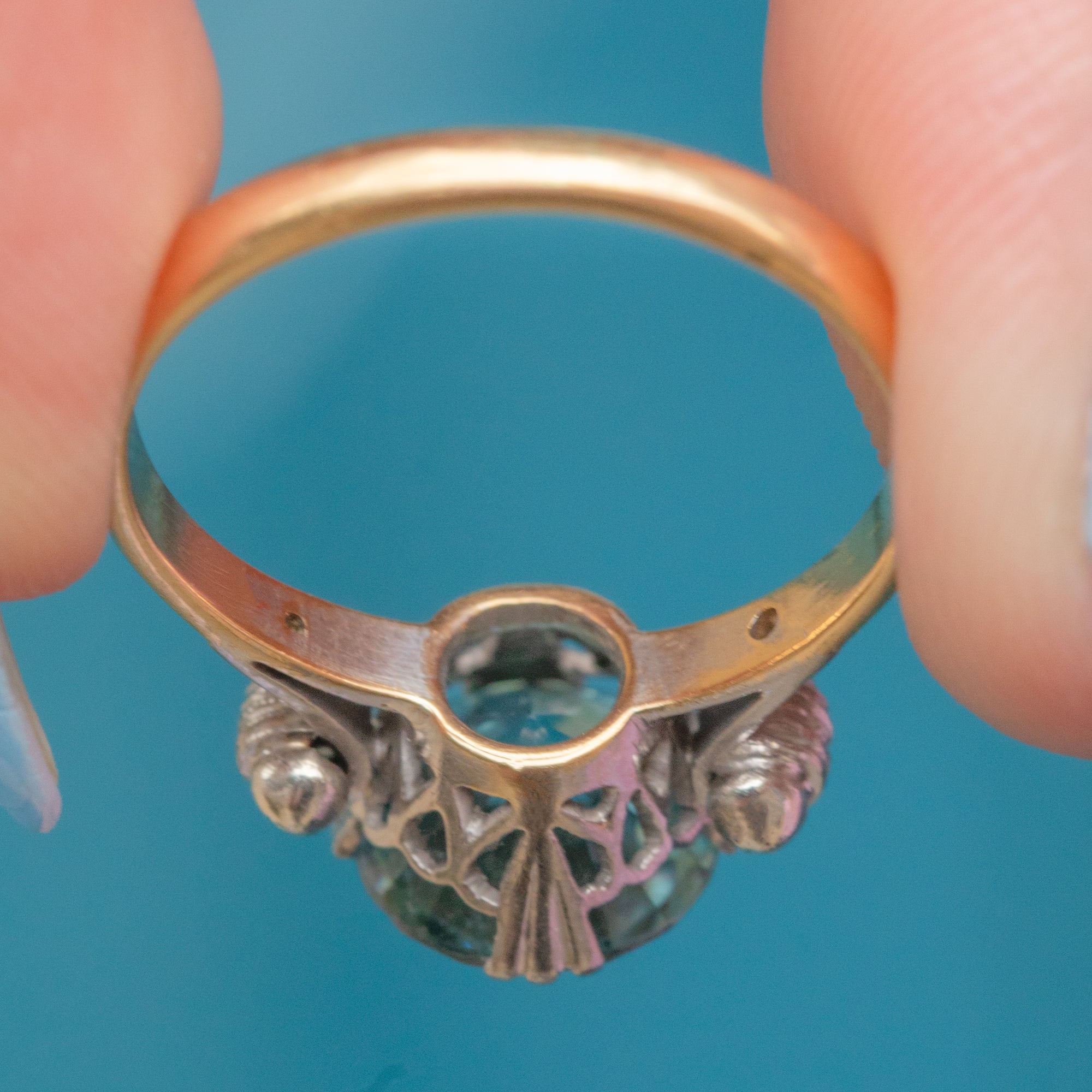 MATERIALS: Tests as 18ct Gold, Platinum settings, Blue Zircon (2.89ct), Diamonds (0.06ct).