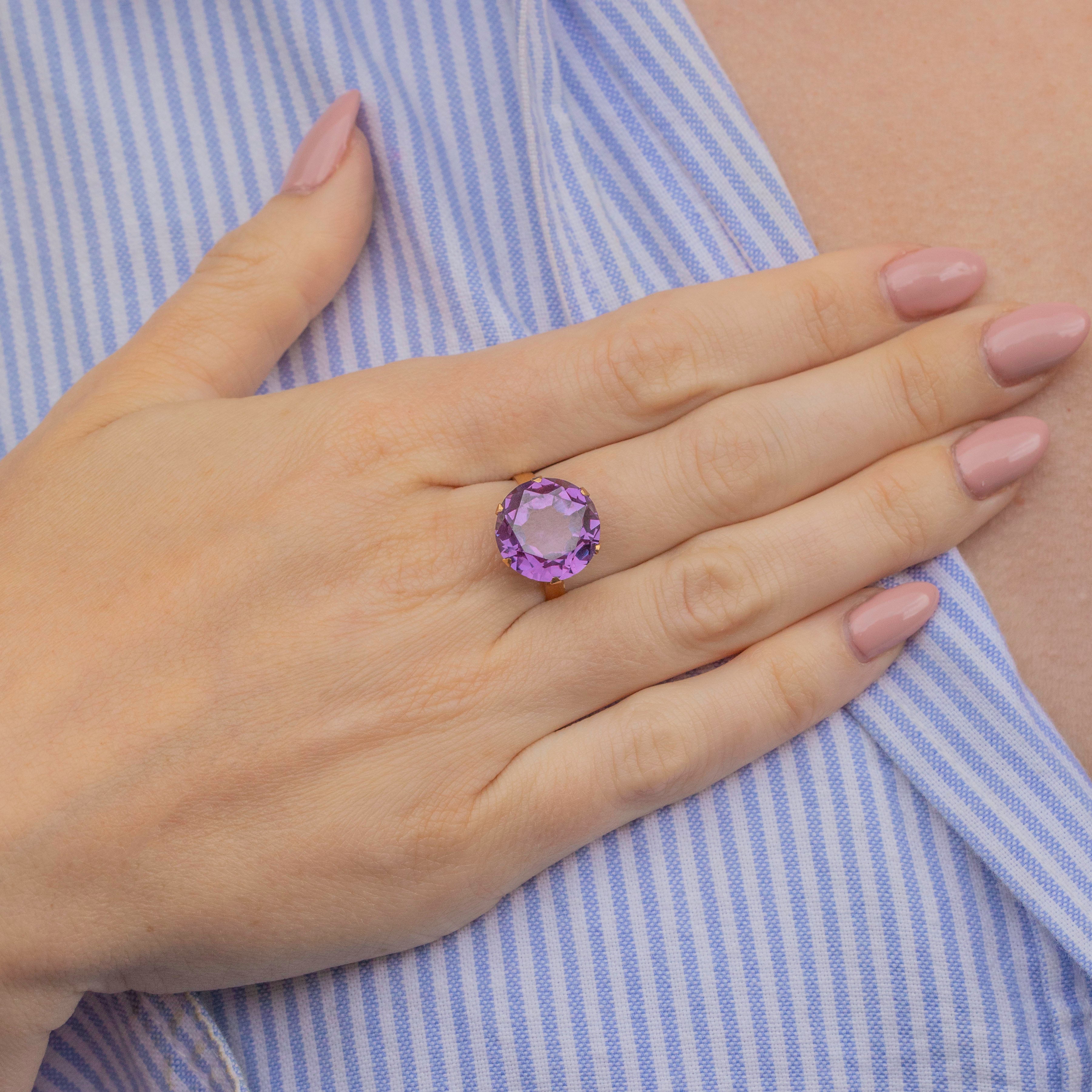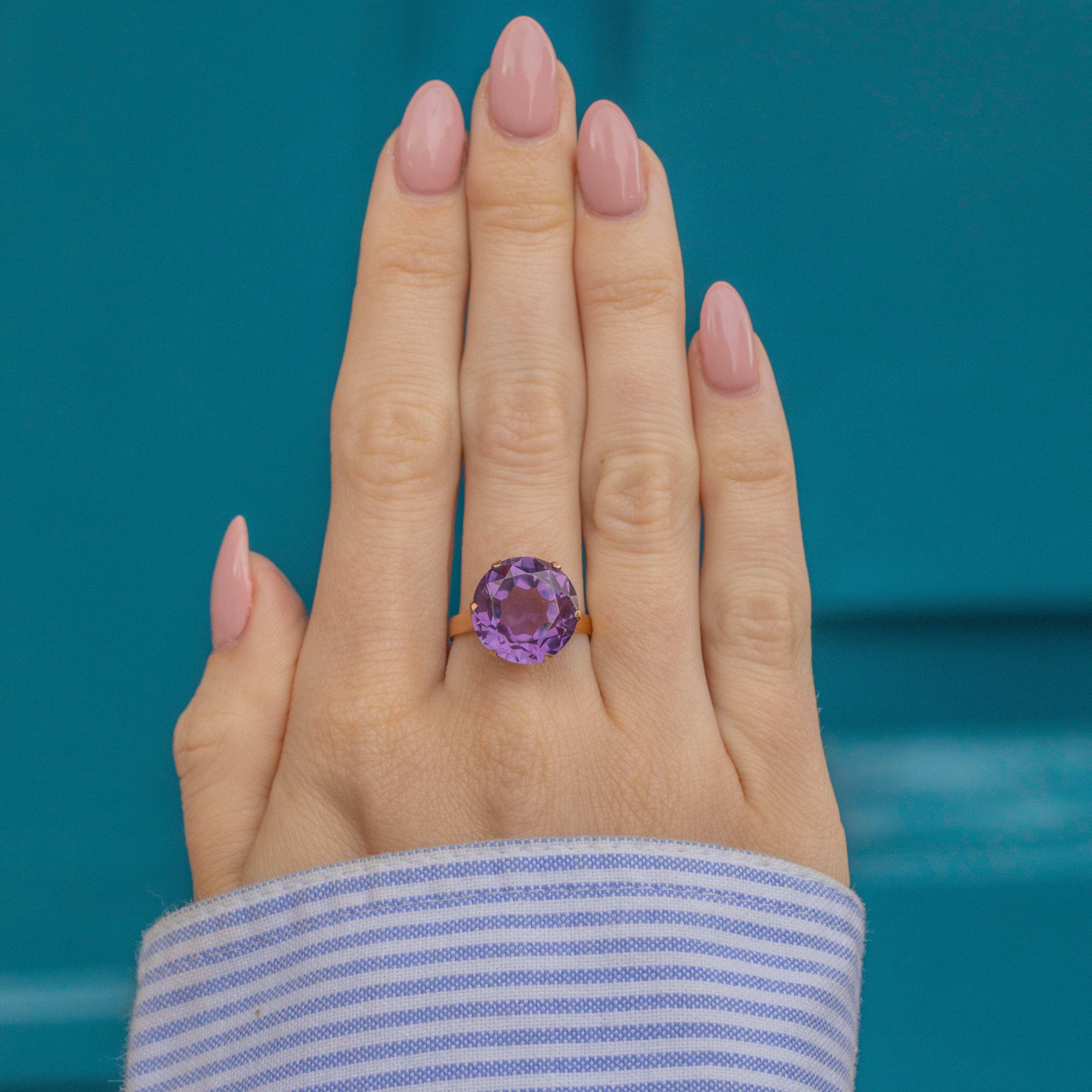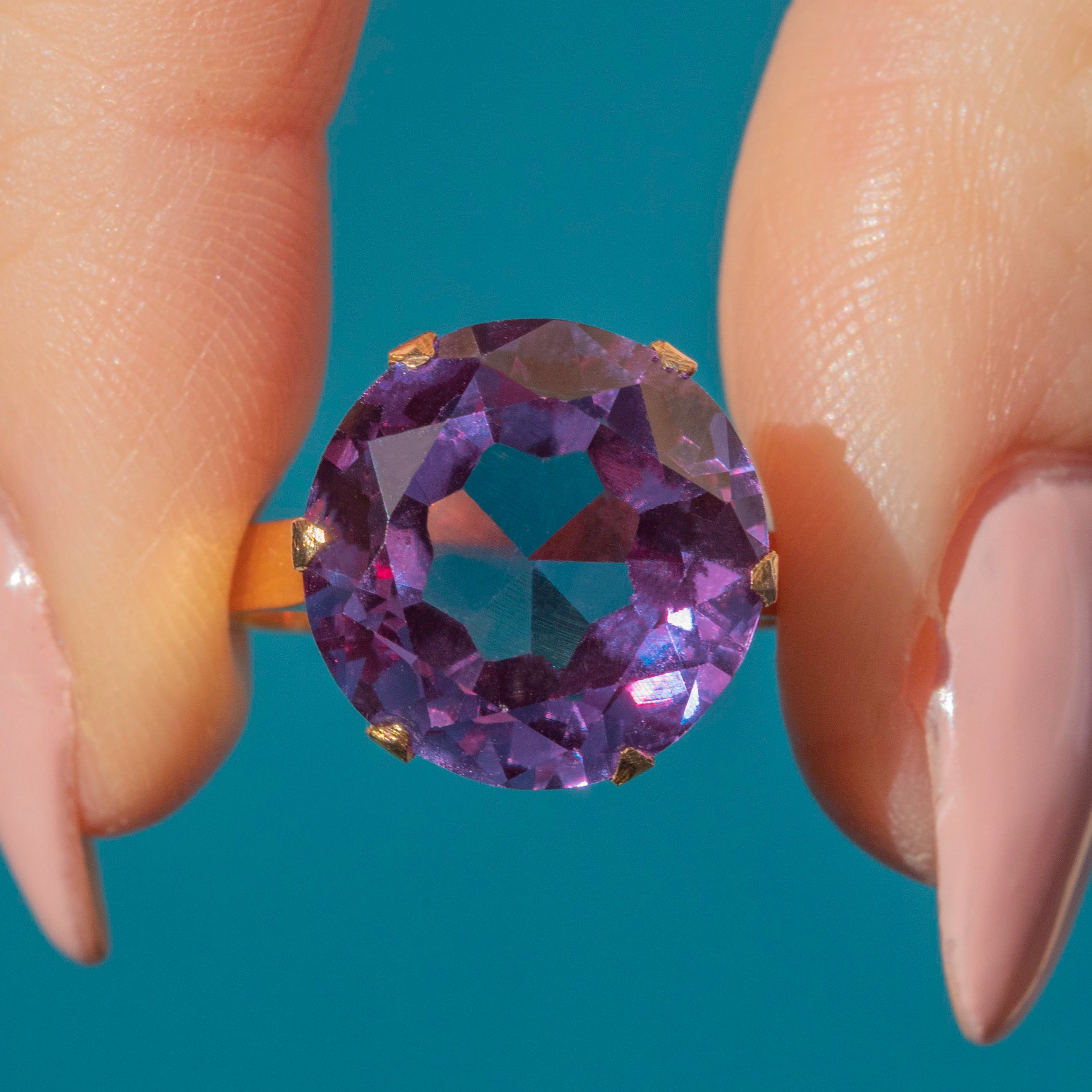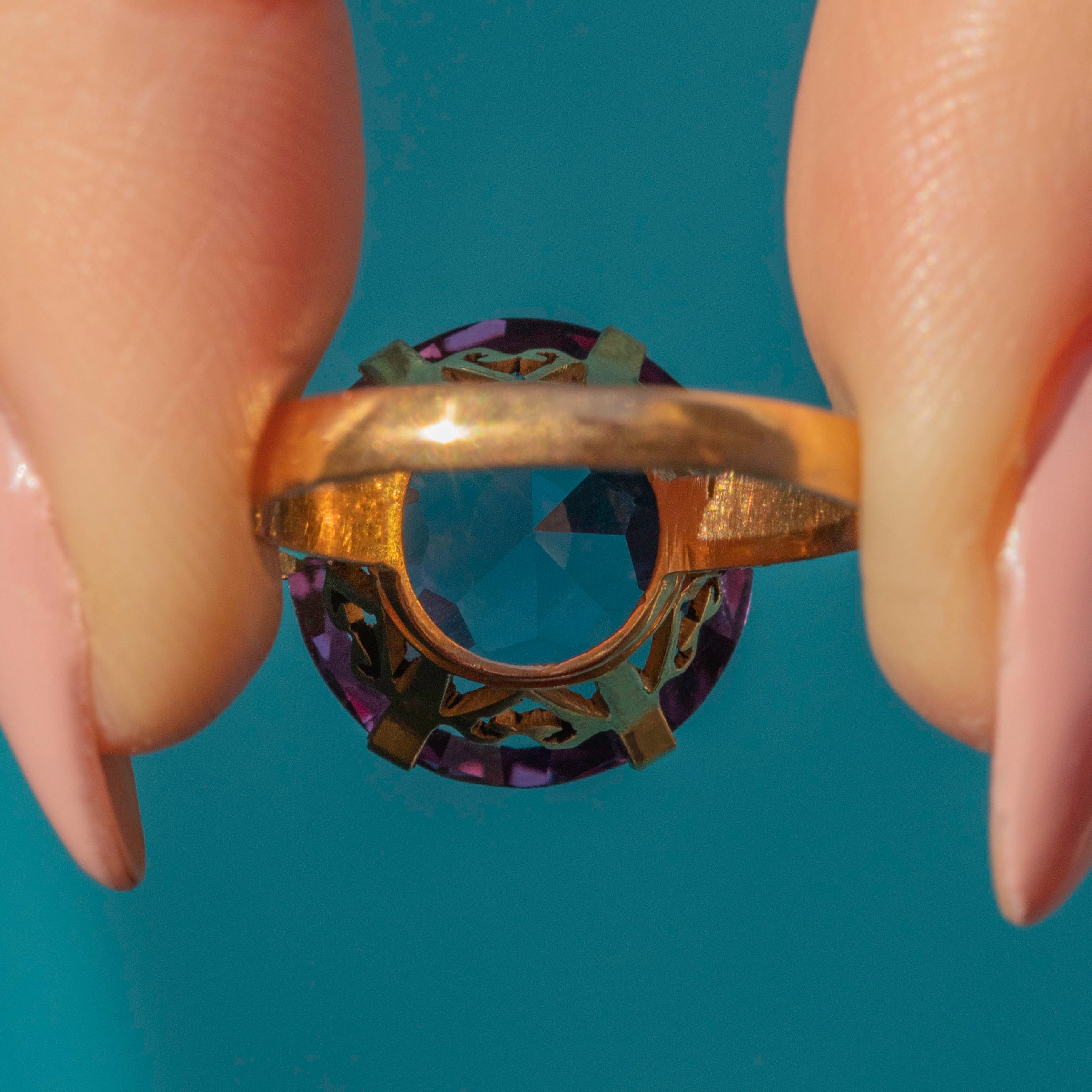 This Art Deco 18ct Gold colour-change Sapphire cocktail ring is truly irresistible! The impressive 6.90ct colour-changing Sapphire is out of this world, with violet hues that transform into flashes of navy blue radiating through delicate hand-cut facets.