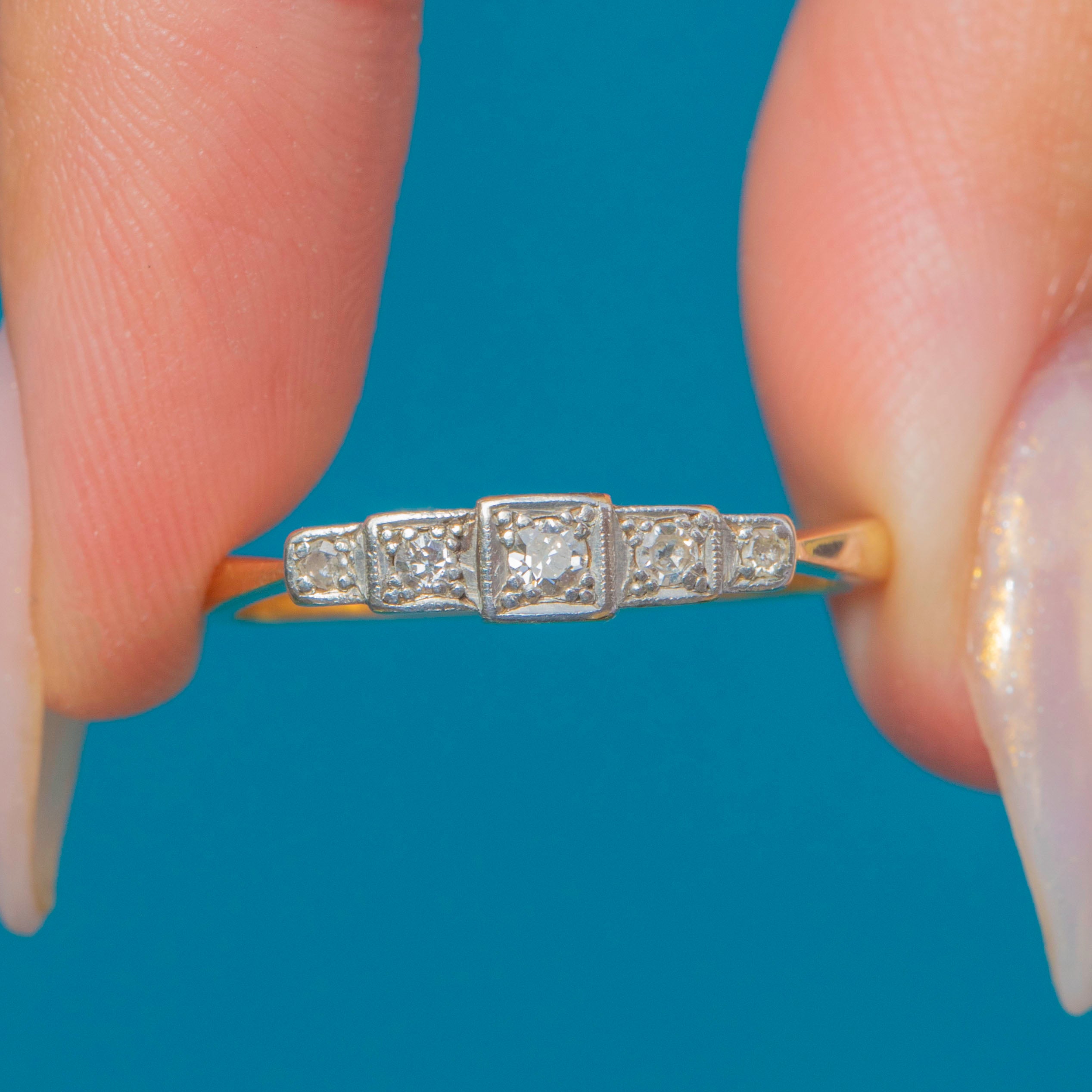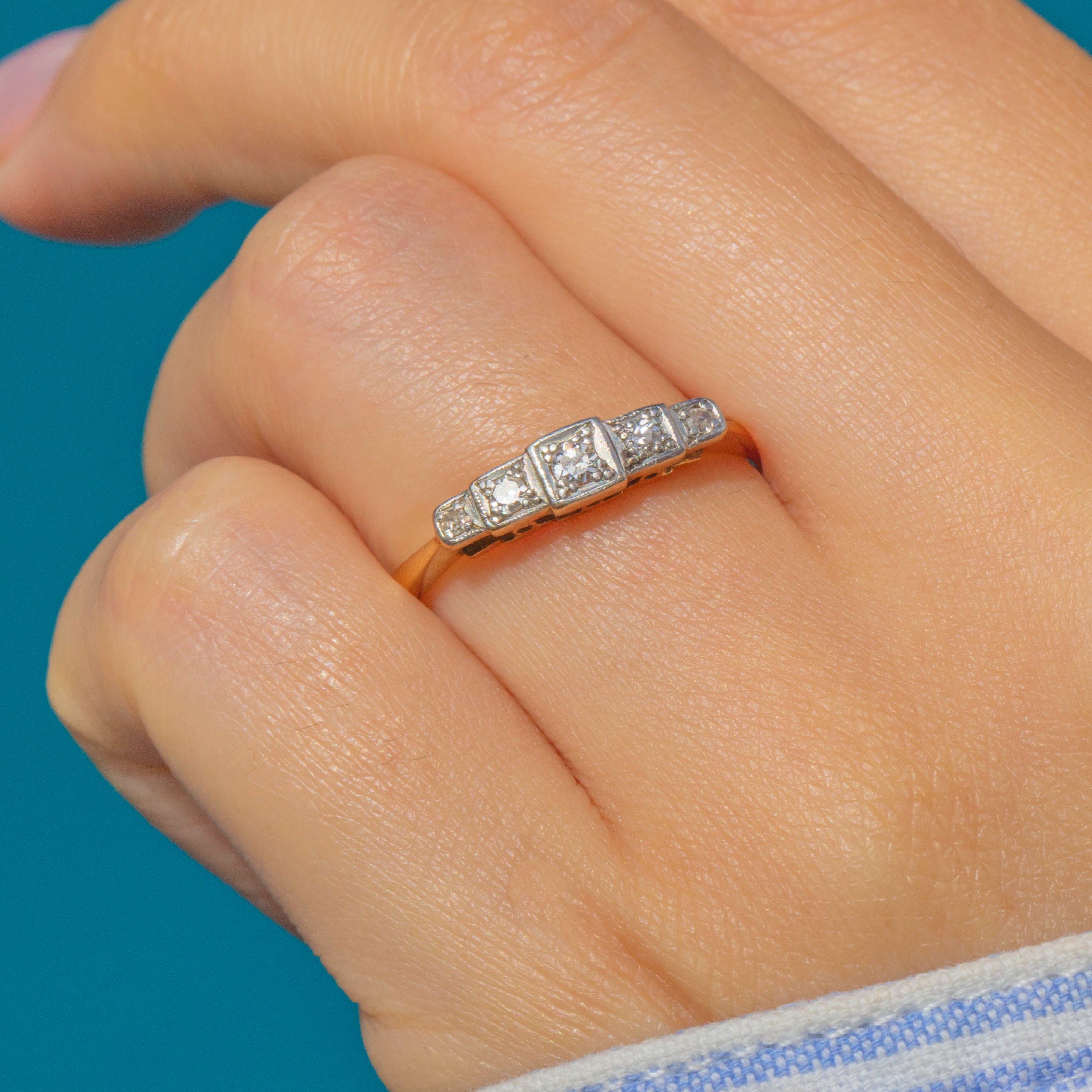 A chic Art Deco Diamond 5-stone ring in 18ct Gold and Platinum, c.1920. The design features five graduating old cut Diamonds, each set in a crisp square Platinum bezel, forming a stepped architectural row across the finger. The style is distinctly Art Deco, reminiscent of the iconic Chrysler Building of the era.