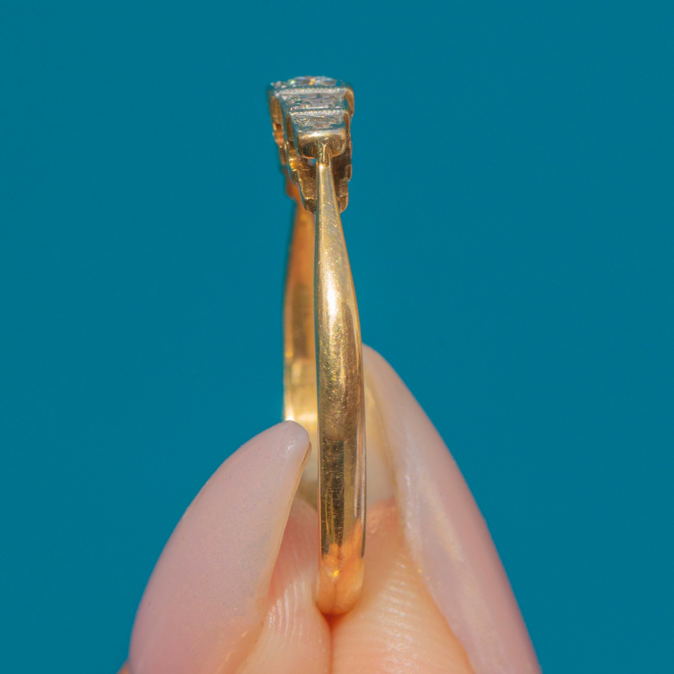 VERY GOOD – EXCELLENT: Diamonds are well-matched, bright and securely set. Platinum settings are crisp with no wear, and the 18ct Gold band shows no thinning or resizing marks. A clean and beautifully preserved Art Deco ring.