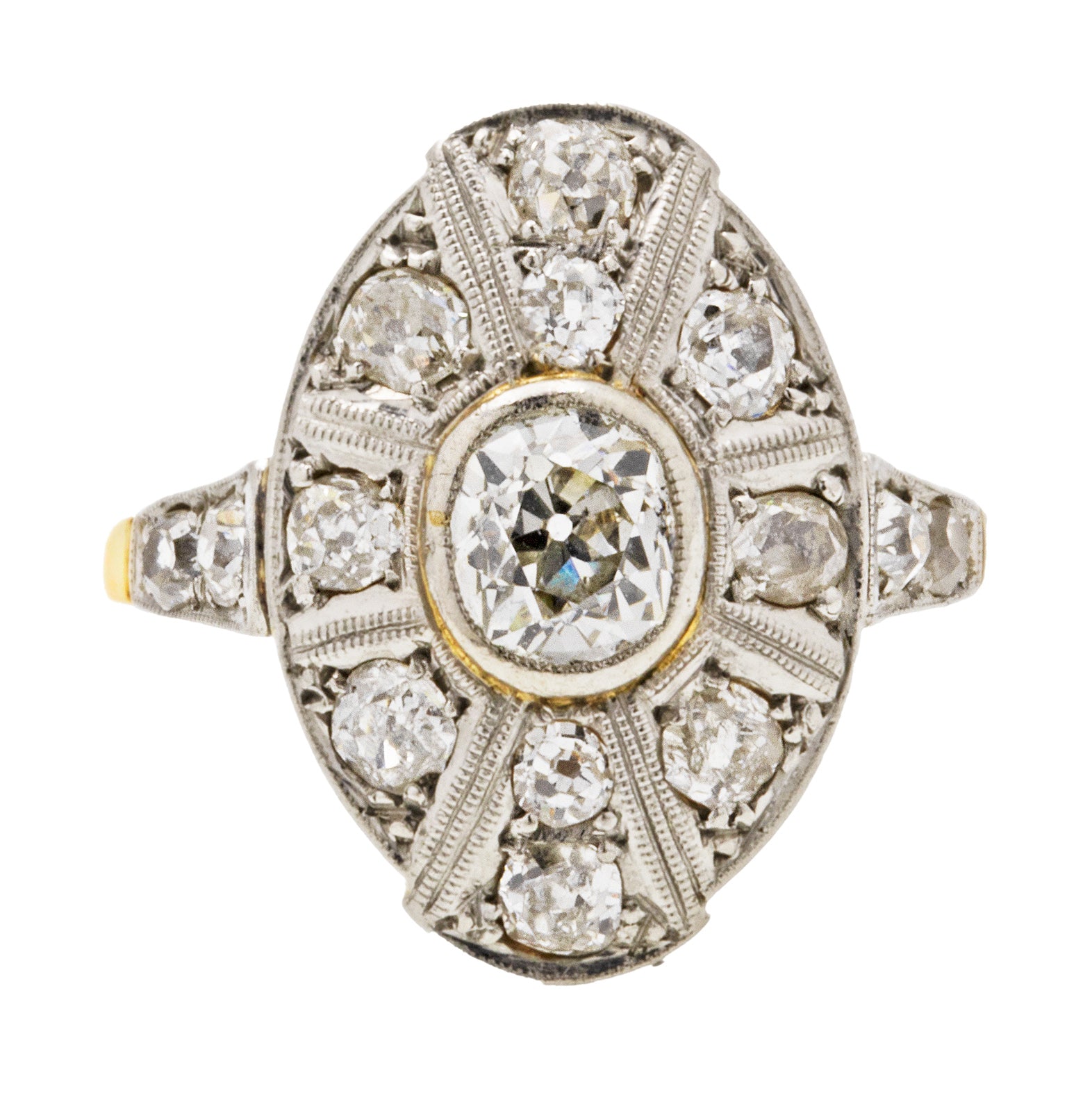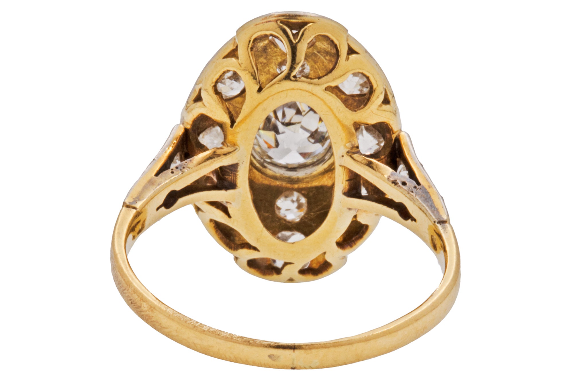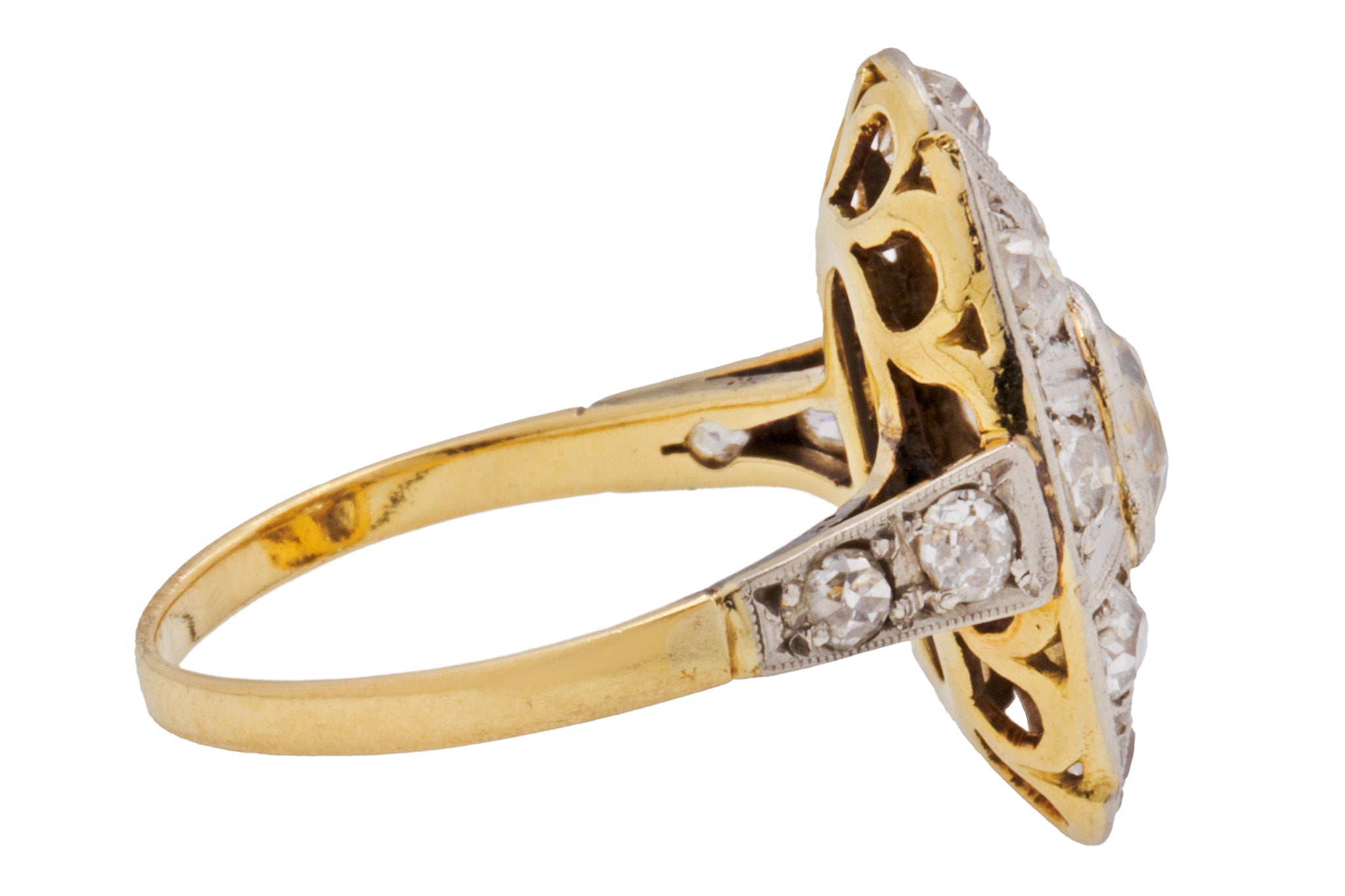 VERY GOOD. This is a lovely Art Deco 18ct Gold Diamond cluster ring in very good condition. The Diamonds are all securely set and have the most gorgeous bright sparkle. The ring only has one resize mark on the back of the band, which is only really visible on the inside of the piece. The central Old Mine Cut Diamond is I-J colour and Si-i clarity, and only one carbon spot inclusion is noticeable up close. The ring has a classic Art Deco feel, and you cannot escape her sparkle!