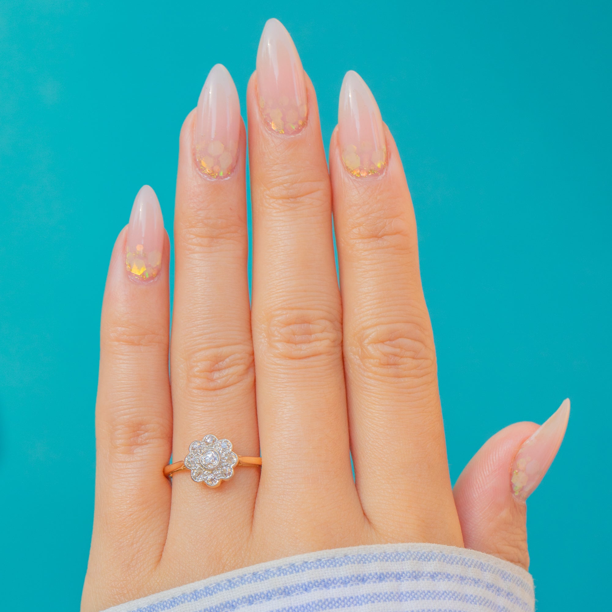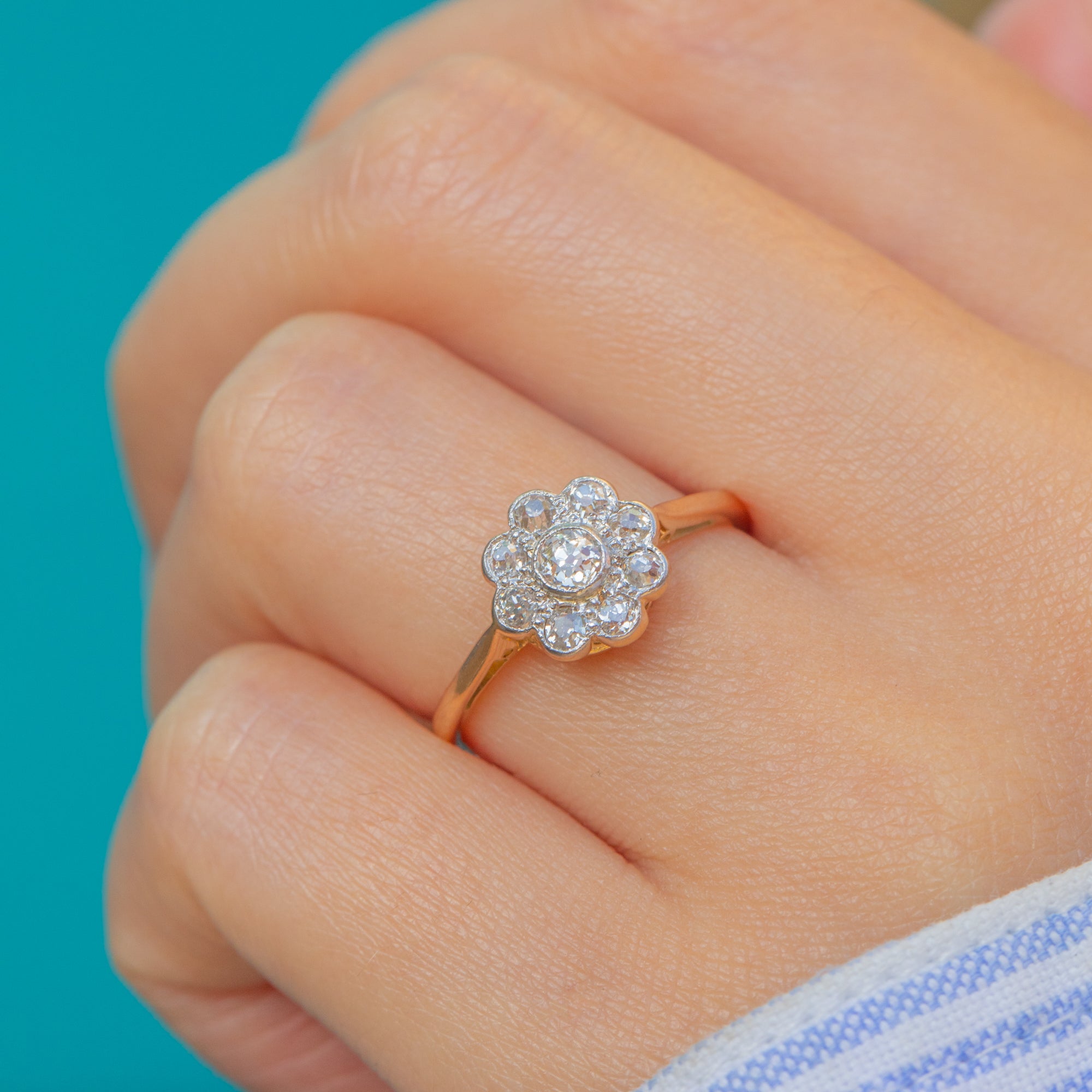 Beautifully proportioned with a 9mm cluster face, this ring offers incredible sparkle and charm. Perfect as an antique engagement ring or as a timeless everyday jewel, it showcases the enduring brilliance of early 20th-century Diamonds.