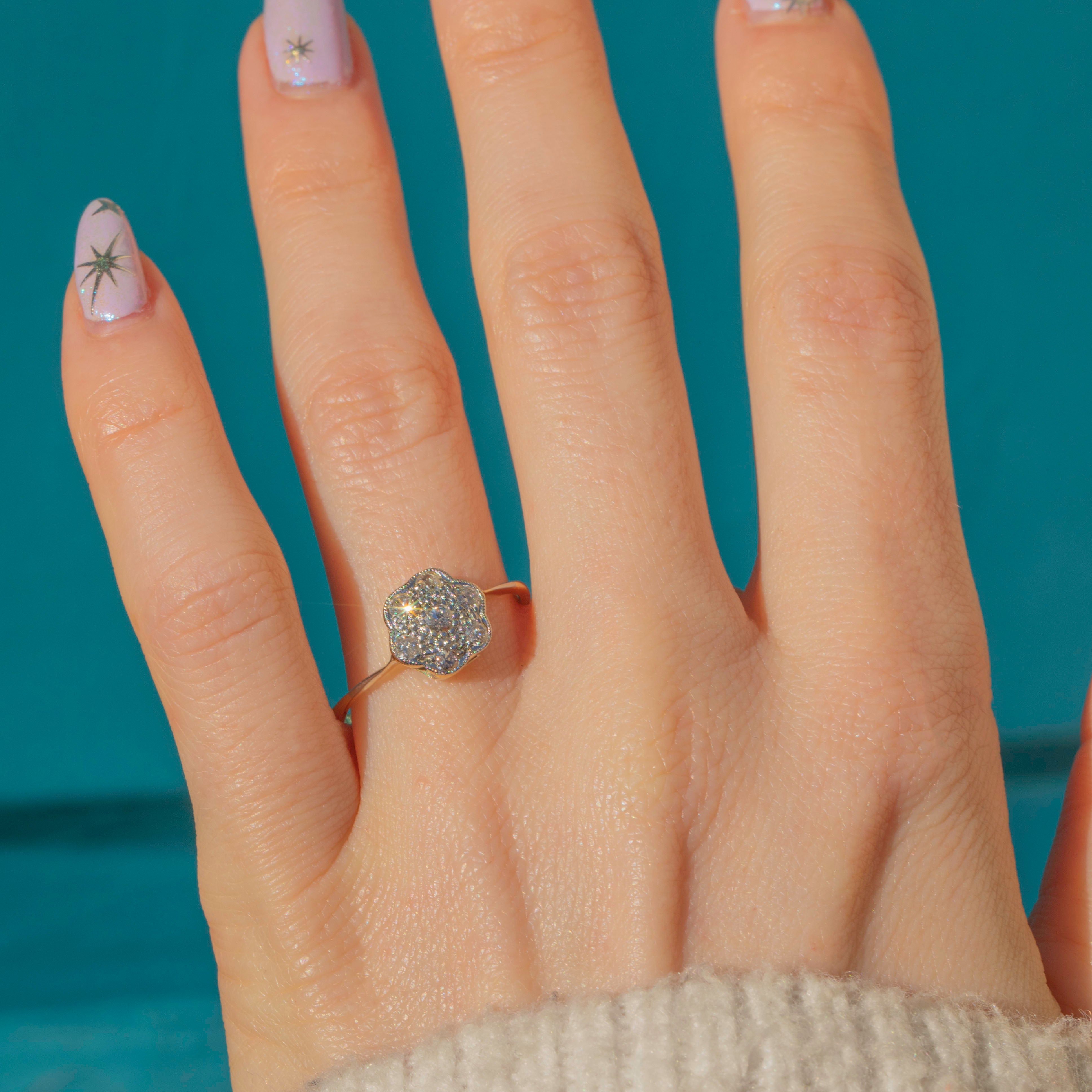 A gorgeous Art Deco 18ct Gold Diamond daisy cluster ring! This Art Deco delight has been crafted from solid 18ct yellow Gold and showcases a feminine daisy cluster of Diamonds set in Platinum.
