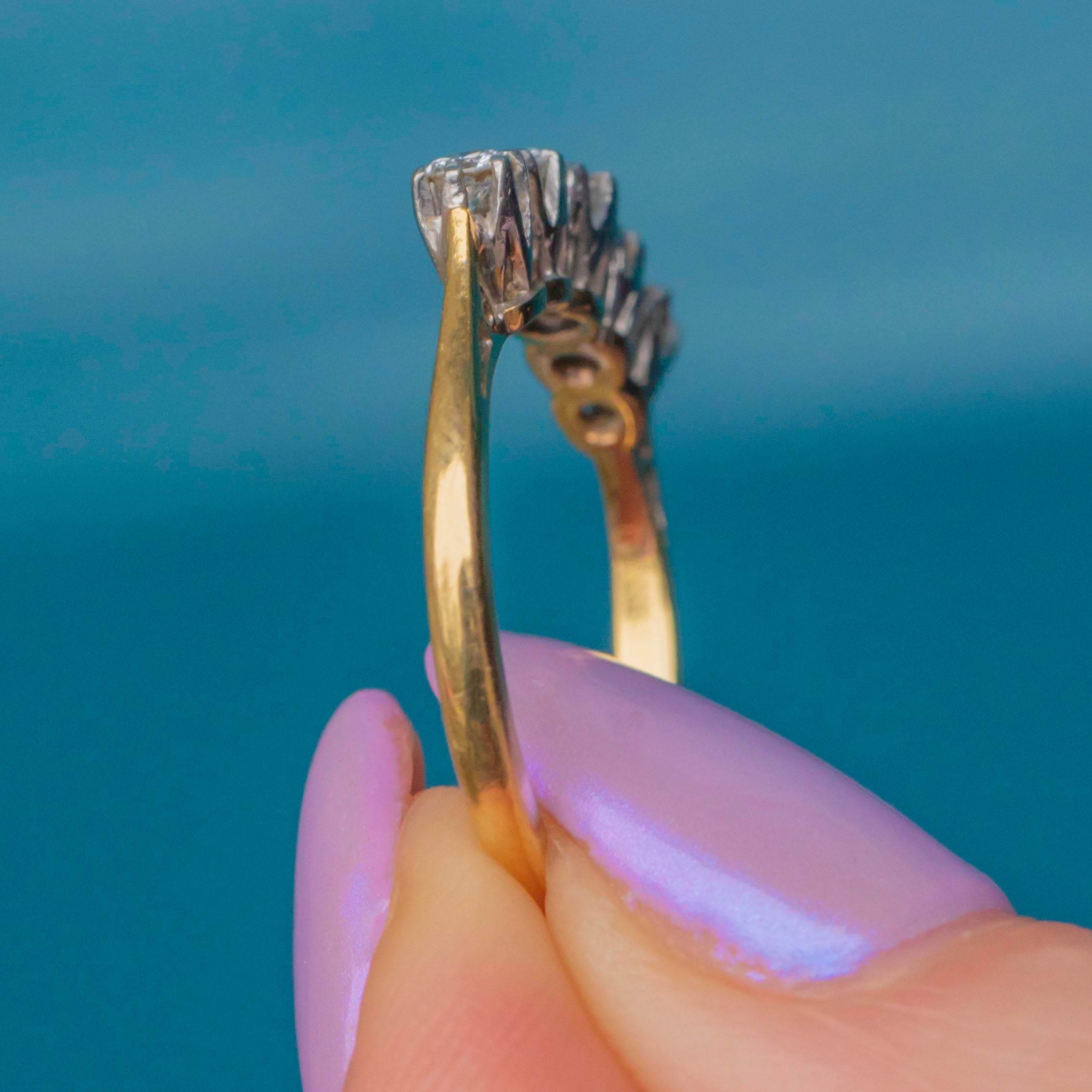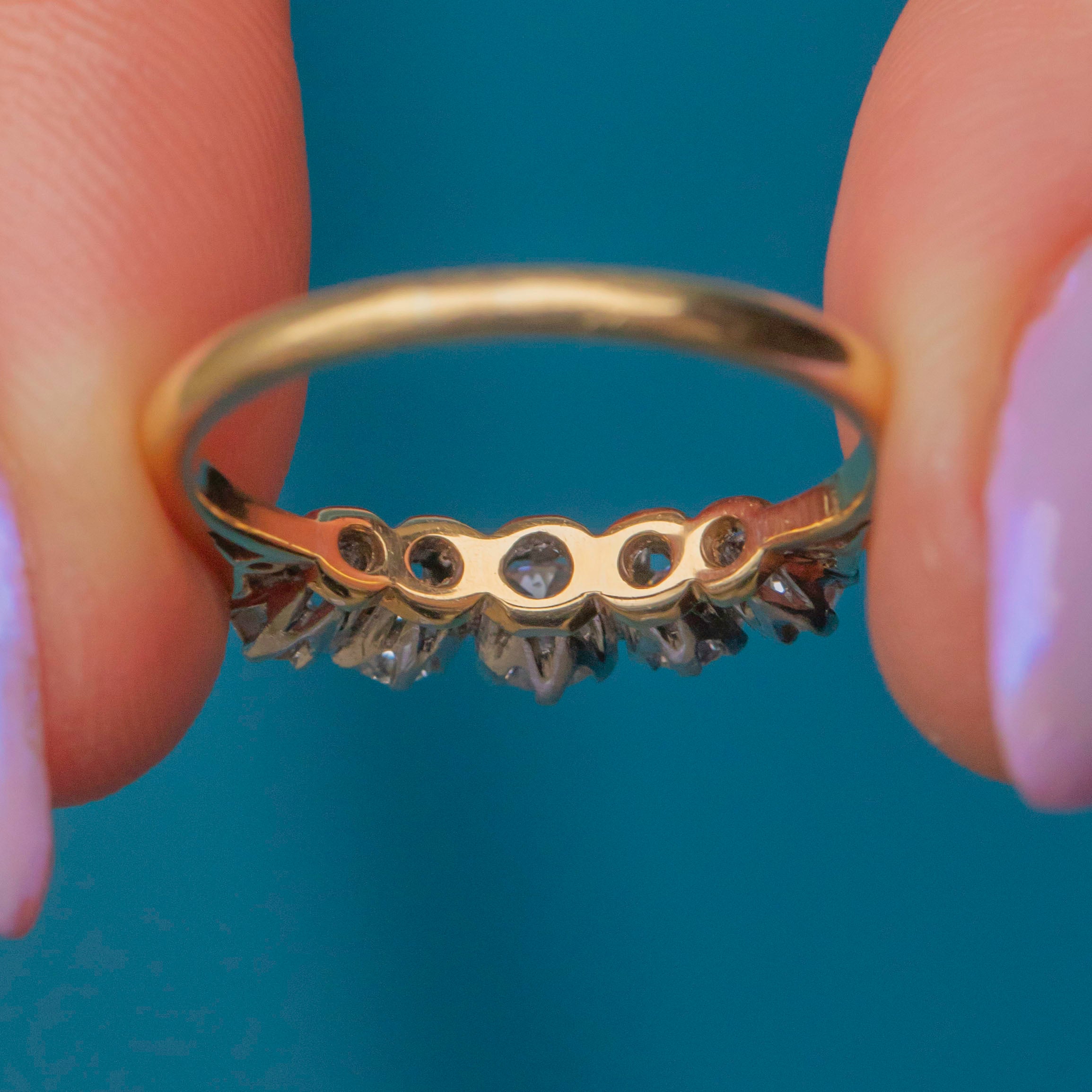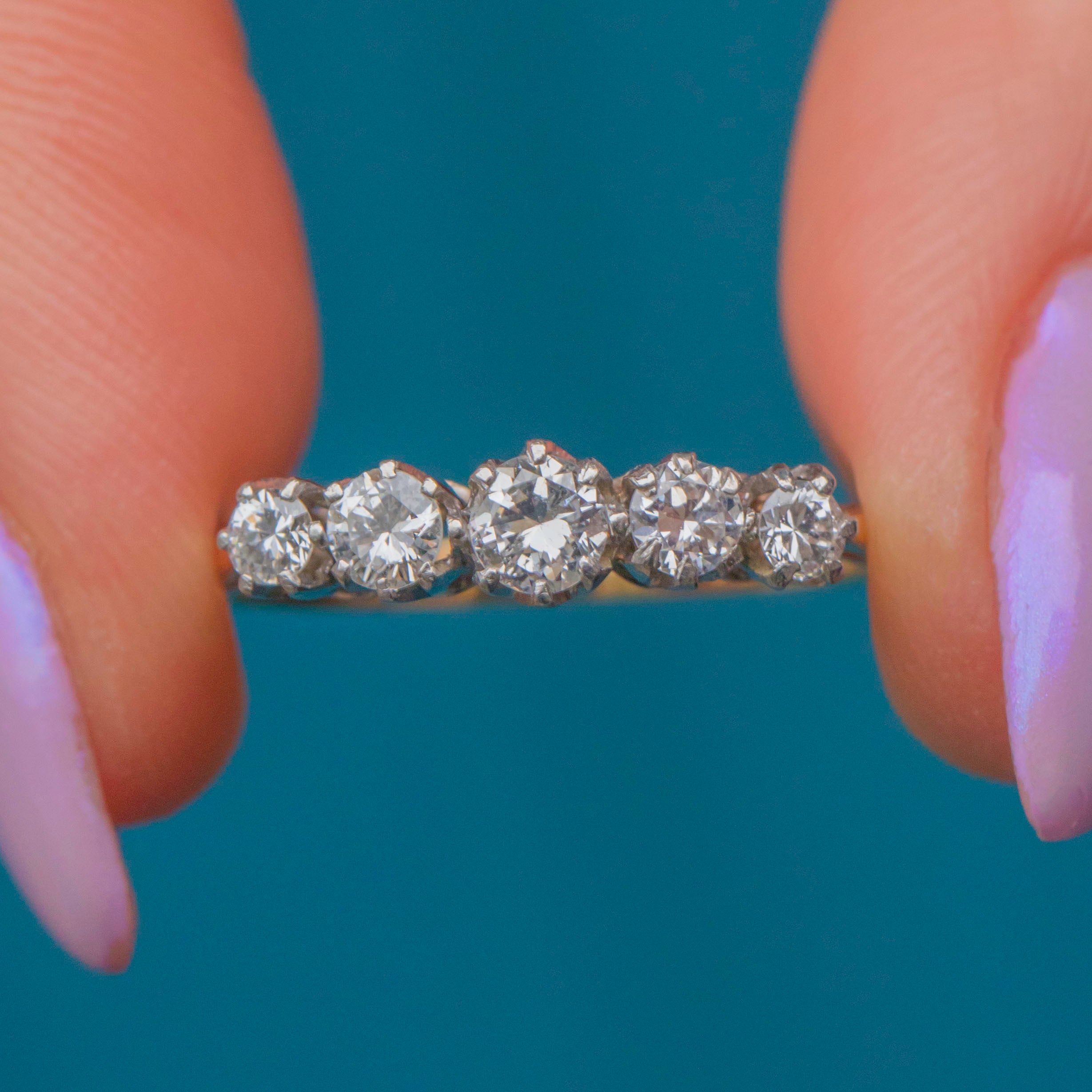 This 18ct Gold Art Deco five stone Diamond ring is bountiful in elegance, grace and refinement. This pretty ring has beautiful Diamonds set in claw settings, epitomising Art Deco aesthetic.