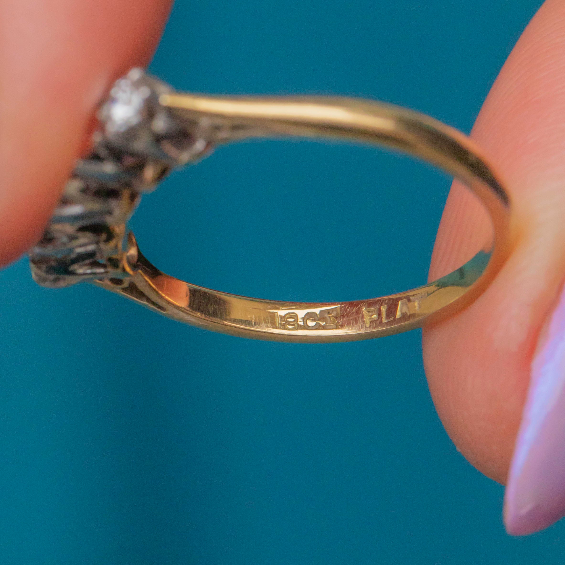 EXCELLENT. This 18ct Gold Art Deco five stone Diamond ring is in impeccable condition. All of the Diamonds are securely set with no visible surface wear, and the Platinum and Gold are lustrous and rich. This is a gorgeous antique Diamond ring to add to your collection!