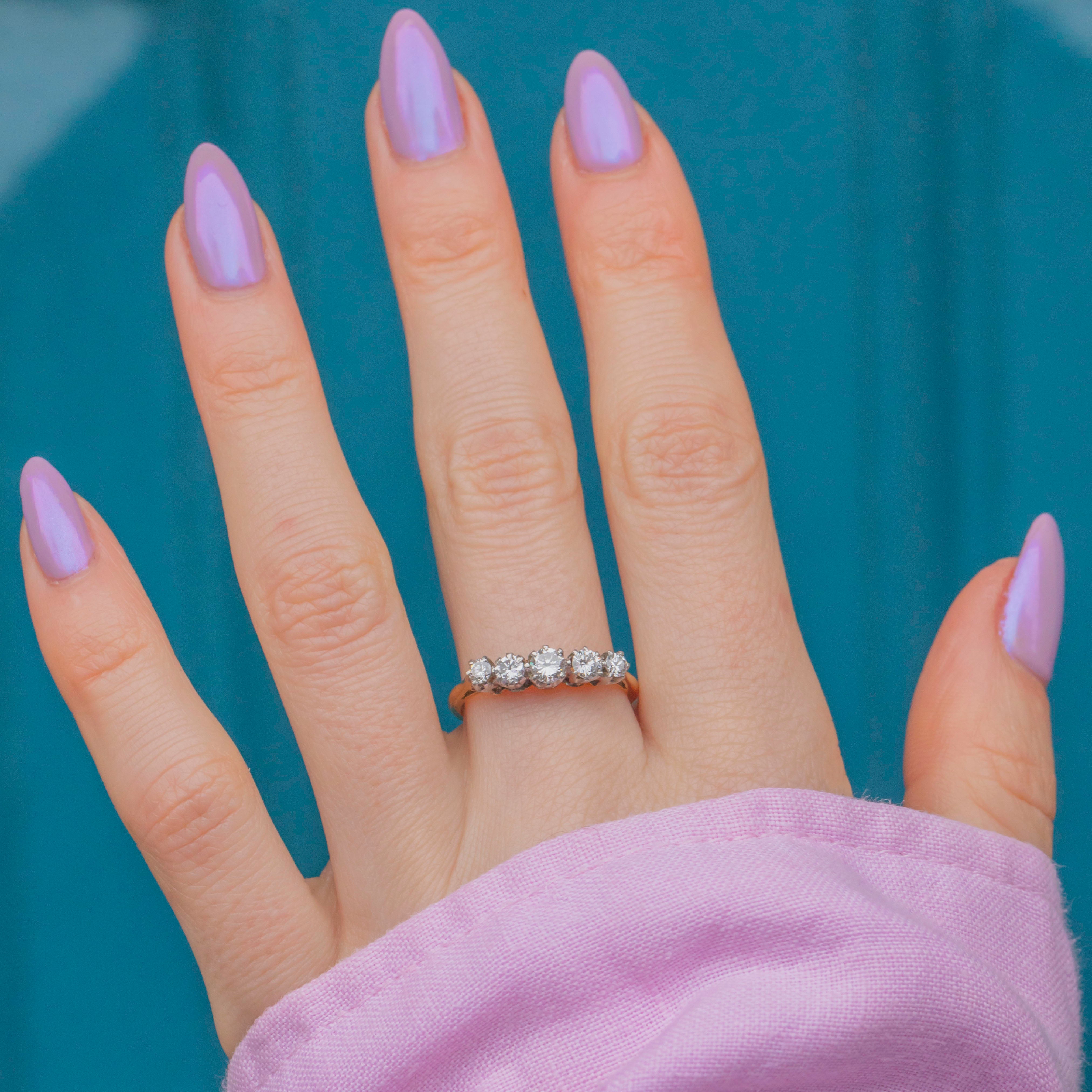 The 0.50cts of Diamonds sparkle from every direction, and the ring has a low profile that makes it ideal for everyday wear; it would make the perfect choice for an engagement ring. Five stone rings are traditionally symbolic of a strong bond and also are a gift of choice to commemorate five year anniversaries in relationships!