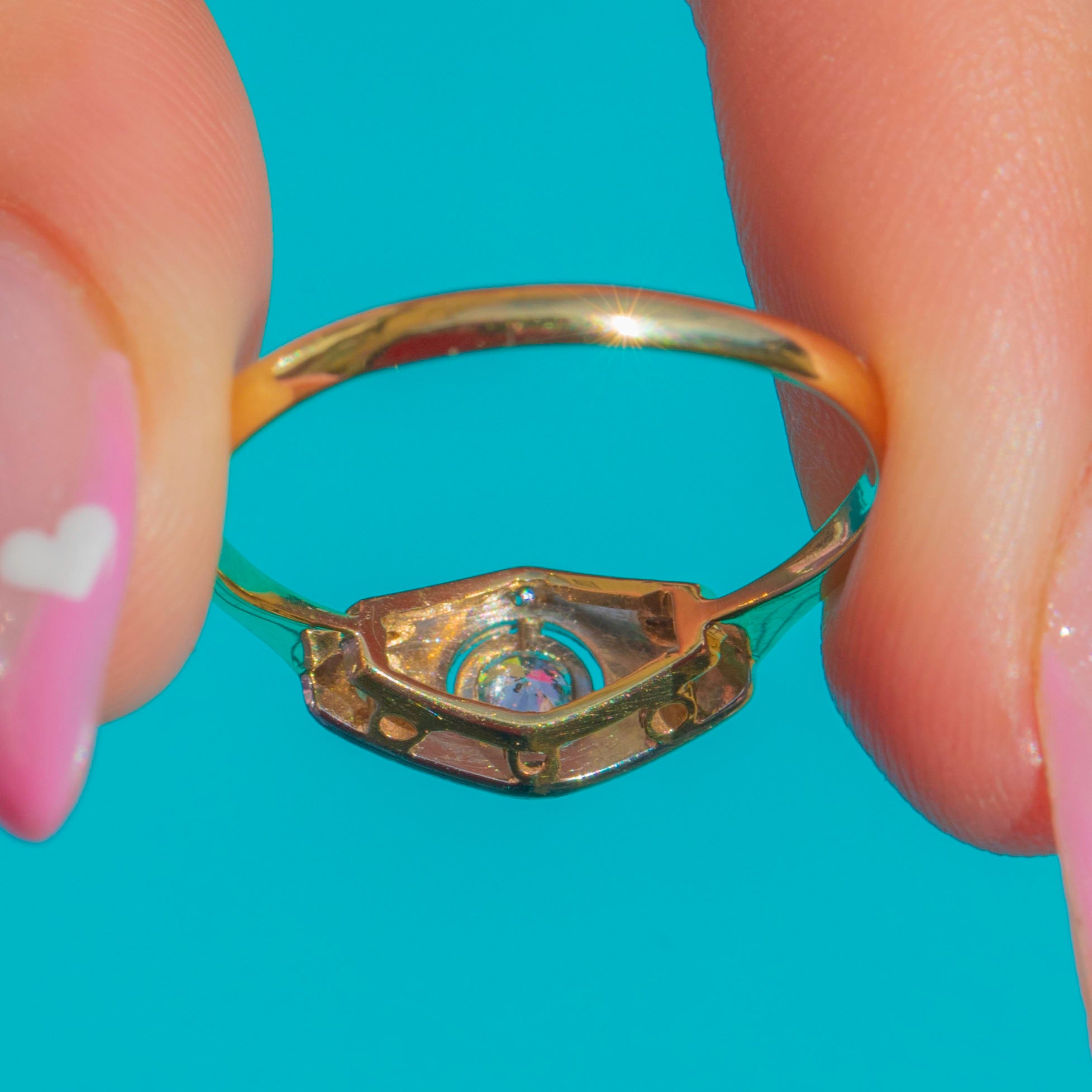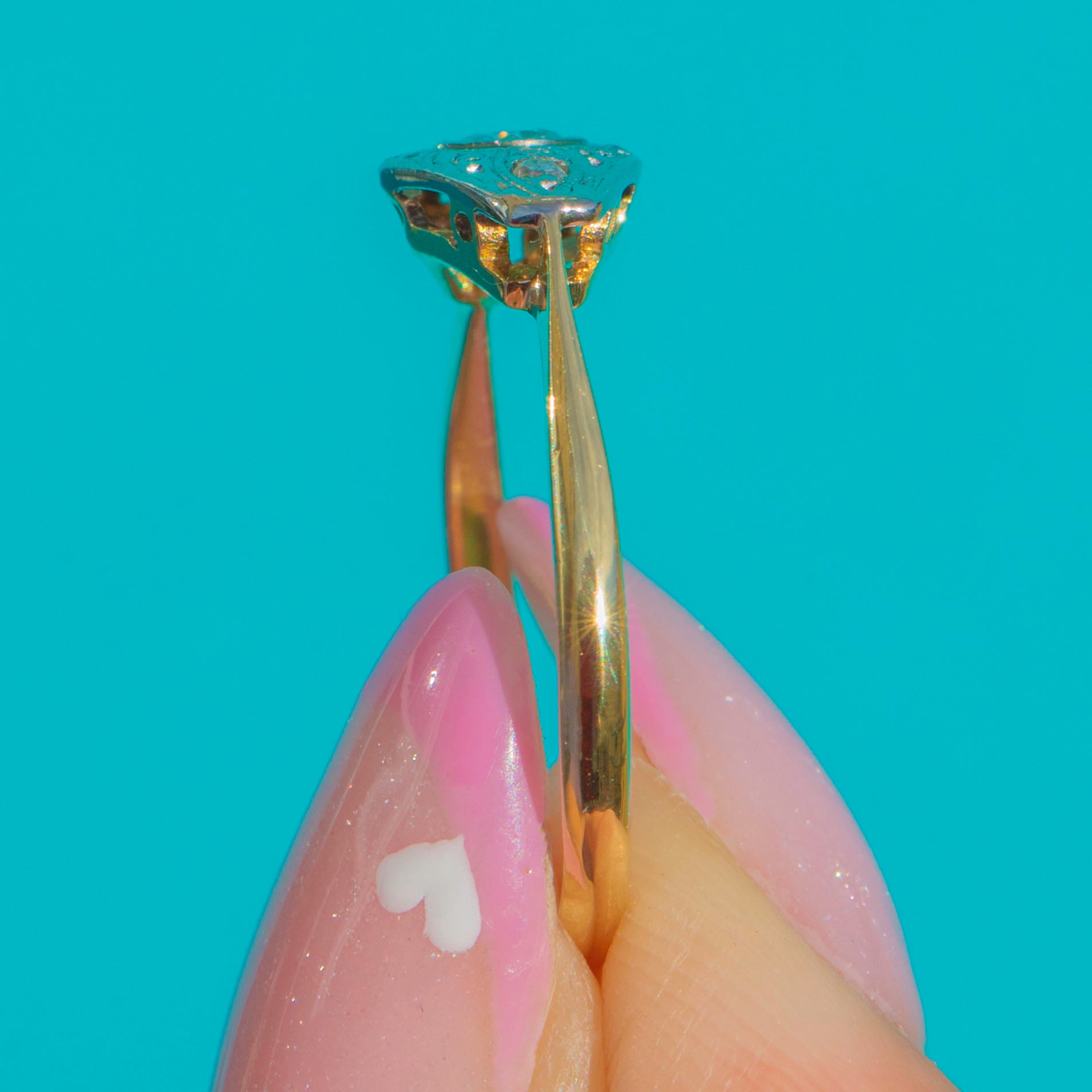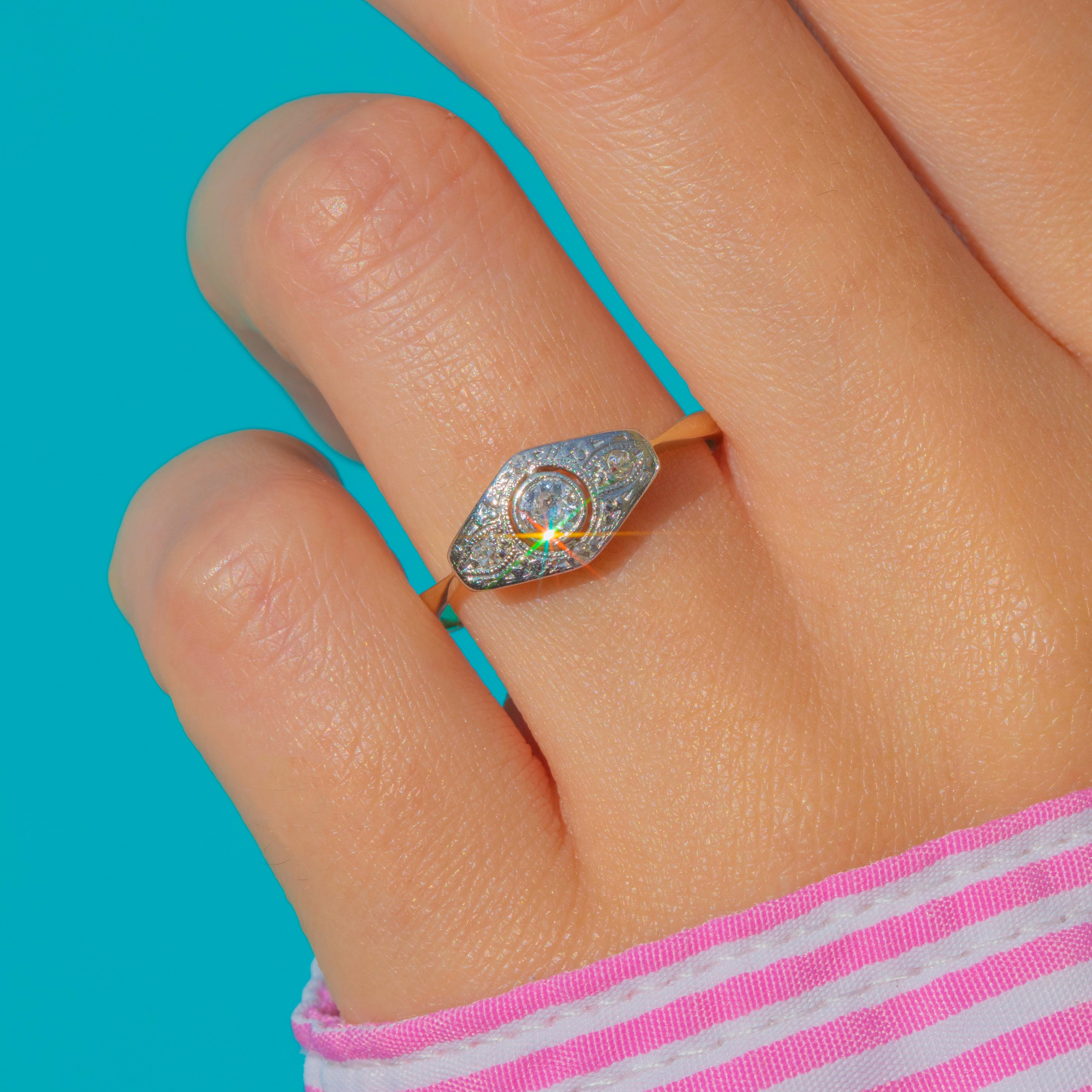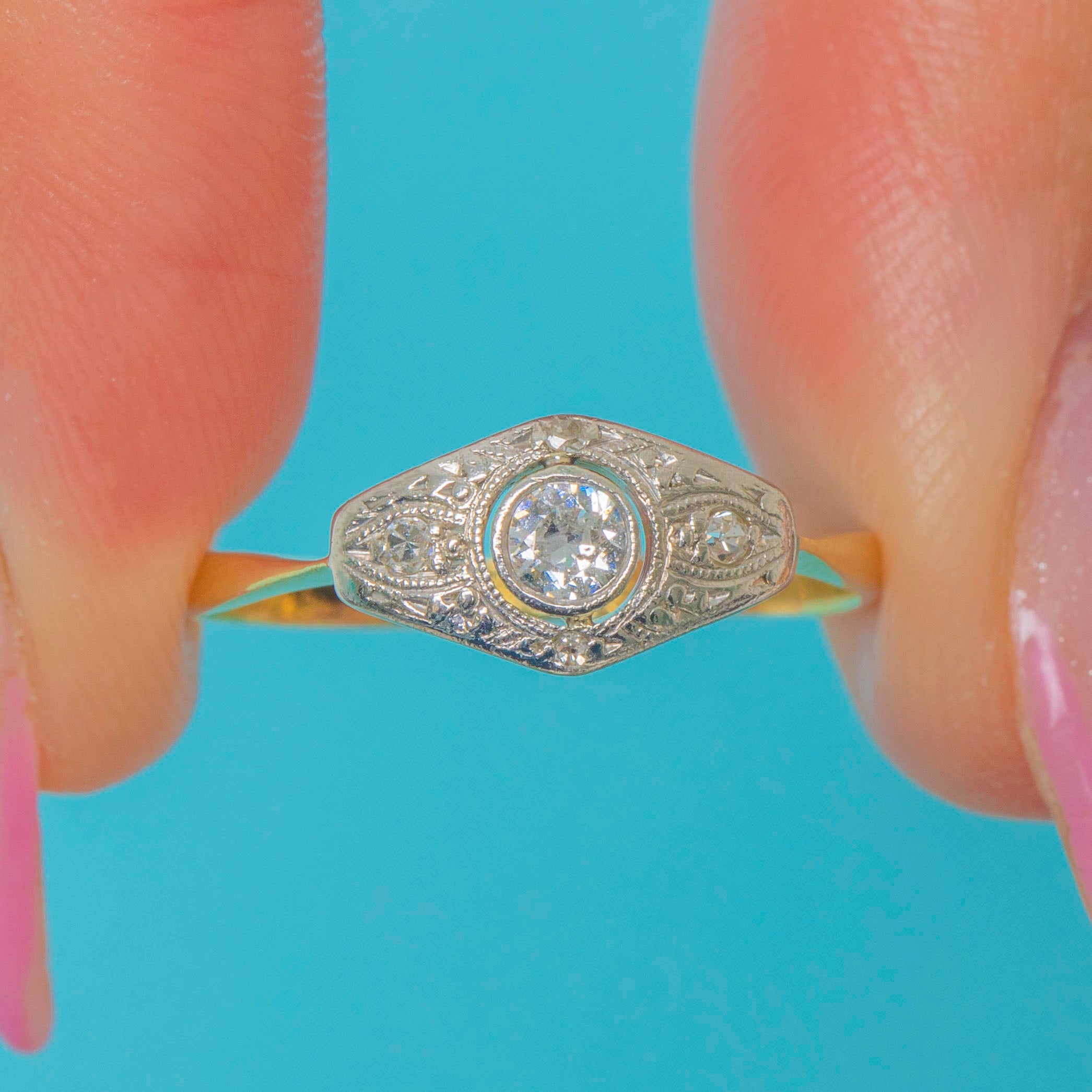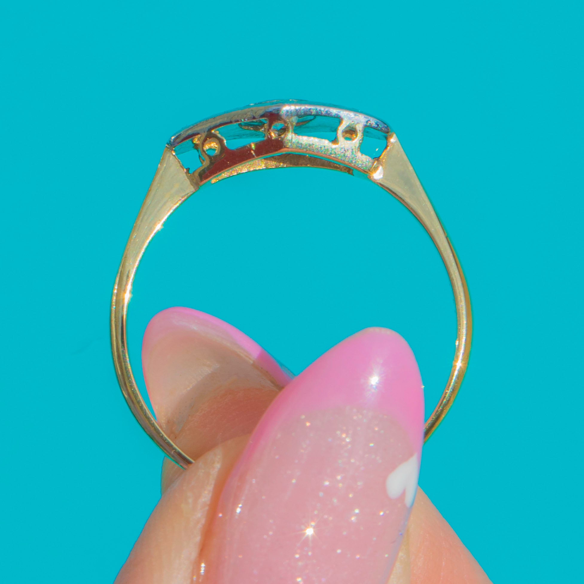 This elegant Art Deco ring is crafted in 18ct Yellow Gold with Platinum-topped settings, designed in a sleek lozenge-shaped East–West panel set with sparkling old-cut Diamonds. The geometric form and clean symmetry capture the refined glamour of the 1920s.