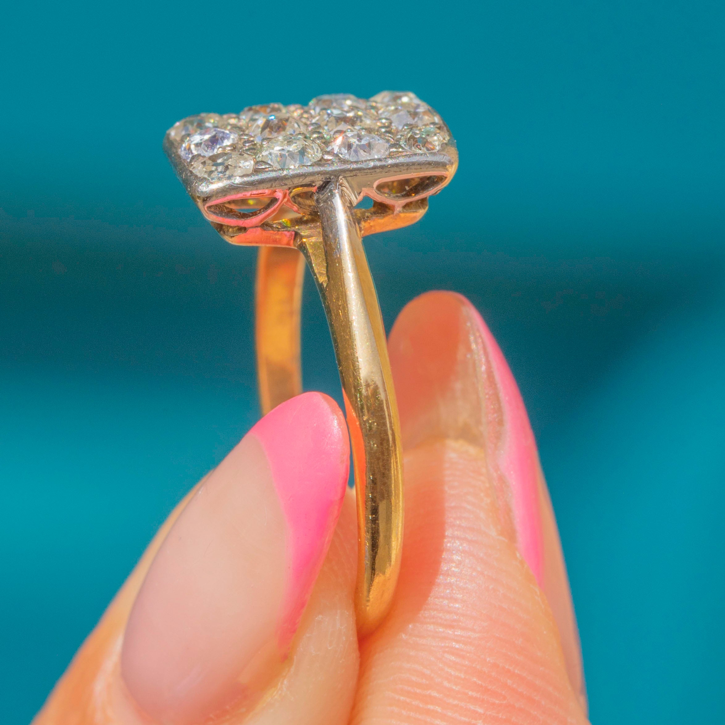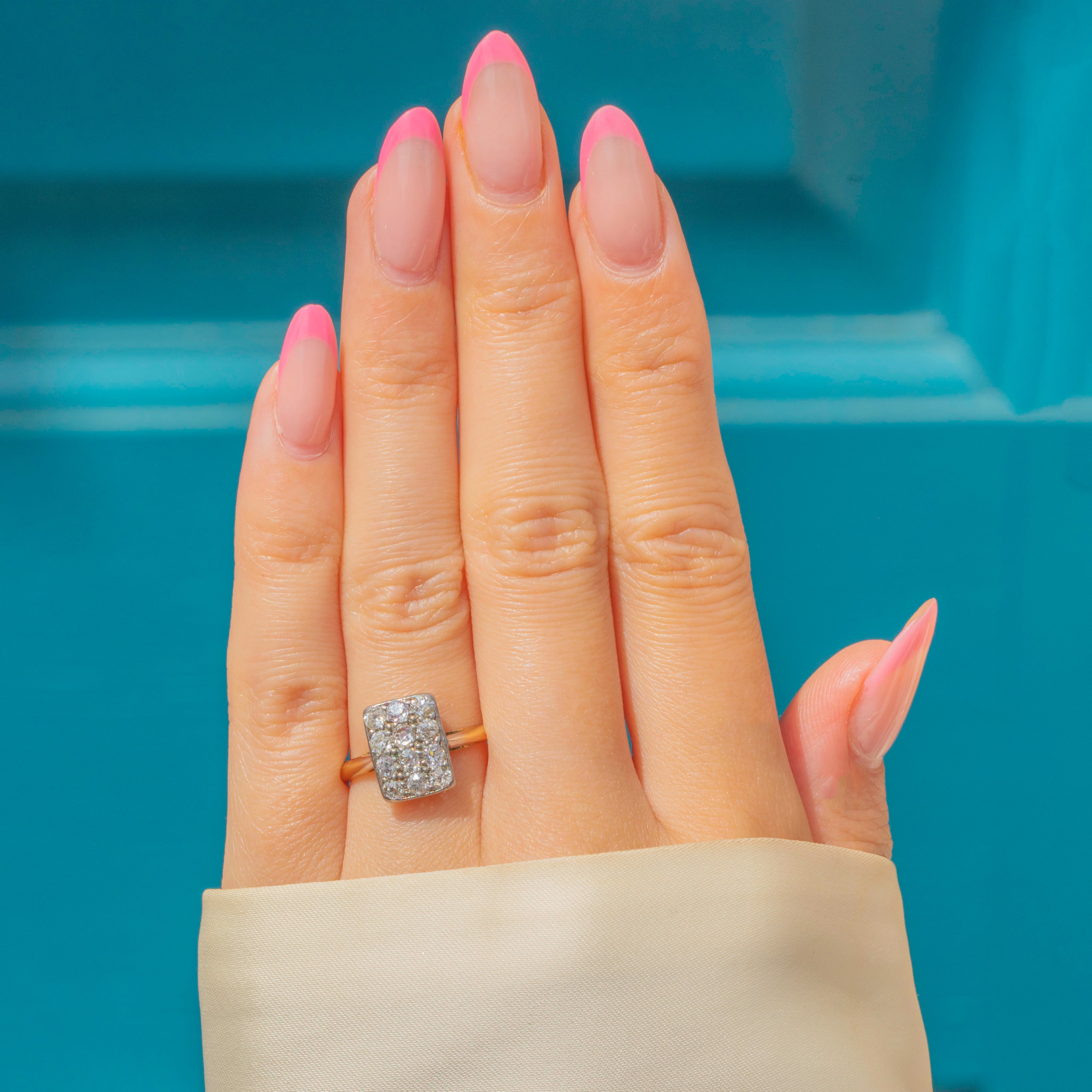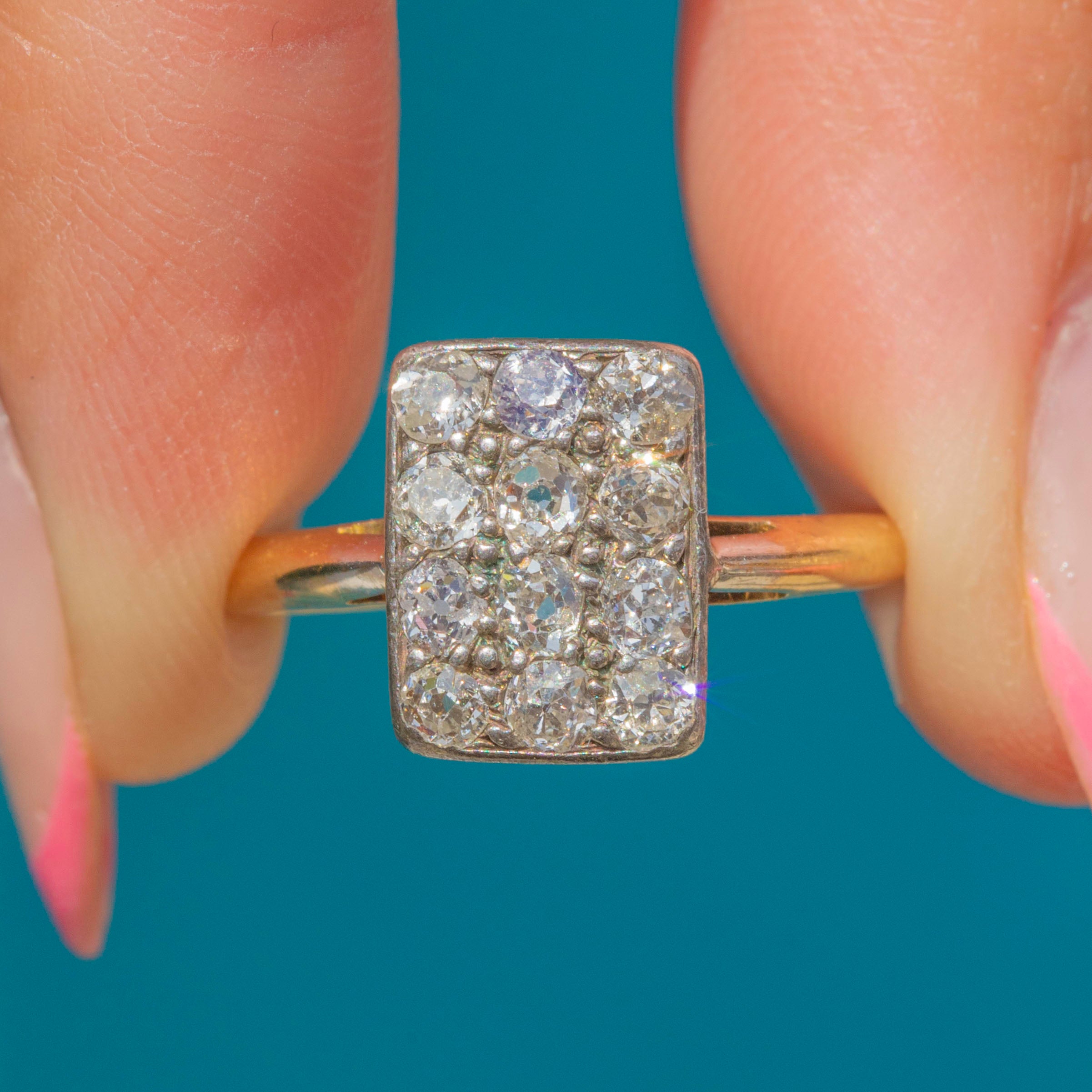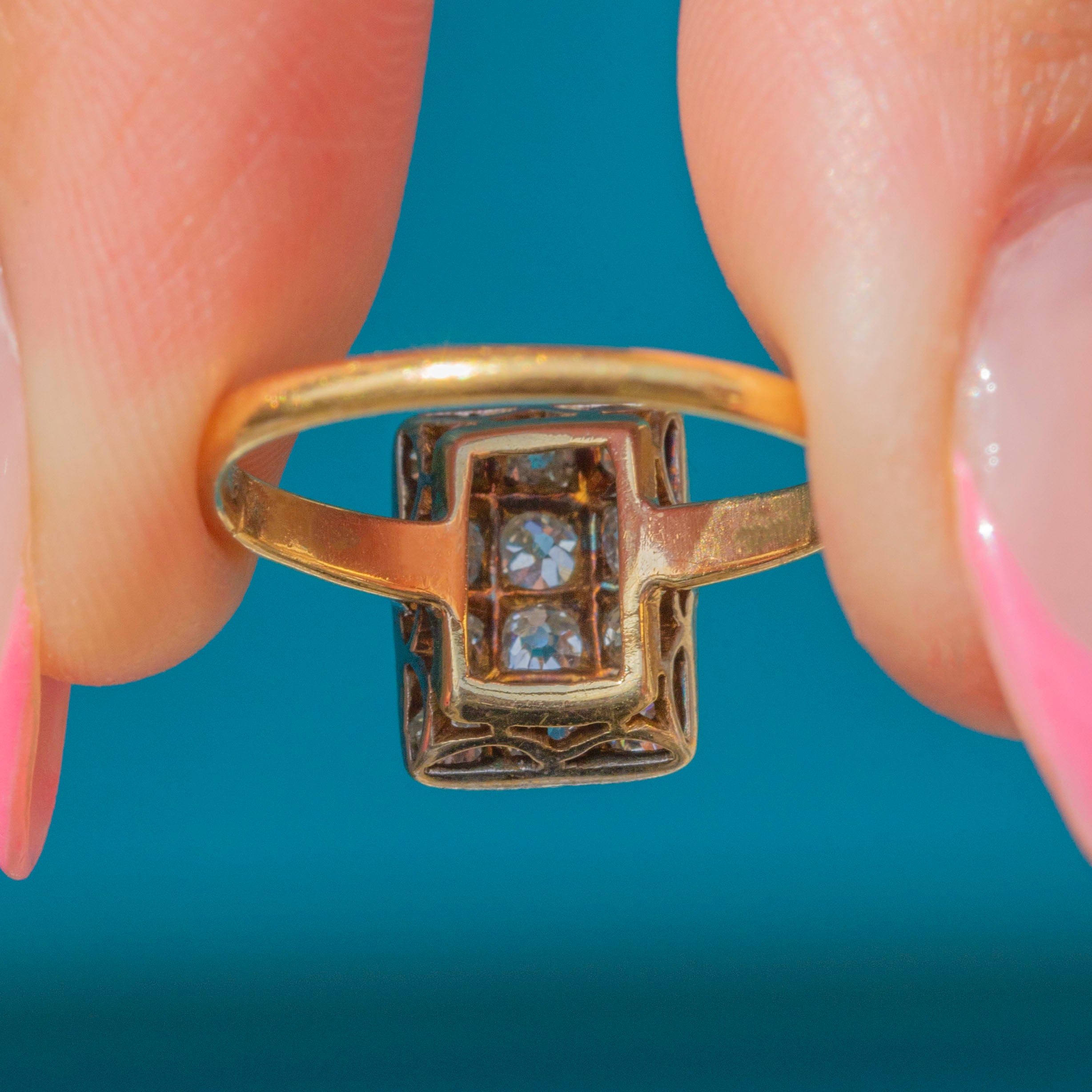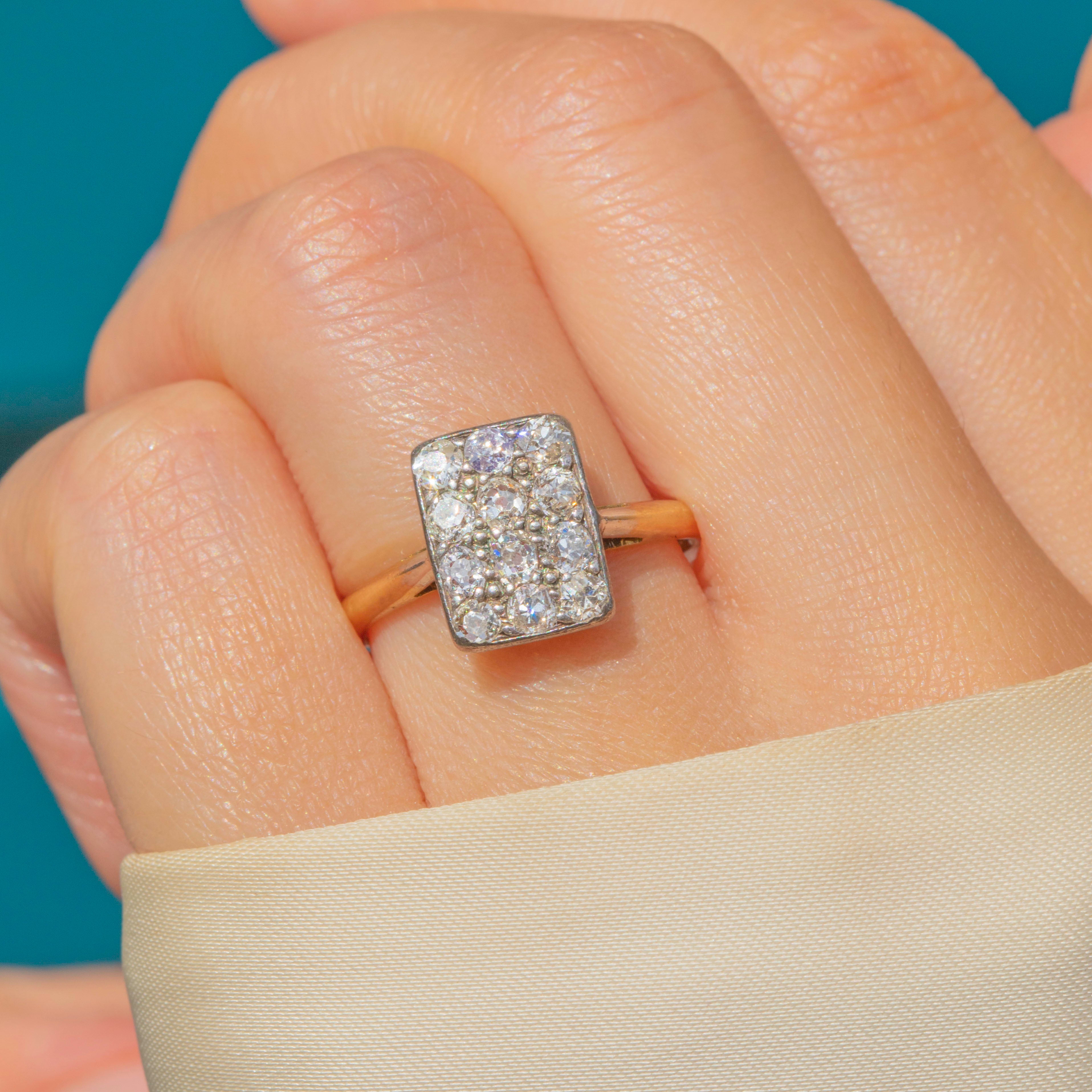 VERY GOOD-EXCELLENT: This Art Deco 18ct Gold Diamond panel ring is in excellent condition. Each of her 12 Diamonds are securely set and free from damage, retaining a brilliant sparkle for their ages. There are no signs of a previous resize, and the 18ct Gold is buttery throughout, free from dings and dents. Although her hallmarks are illegible, you can be rest assured that our in house testing team has confirmed she is 18ct Gold with Silver settings. In awe of her sparkle and coverage on the finger, this is a glorious Art Deco engagement ring!