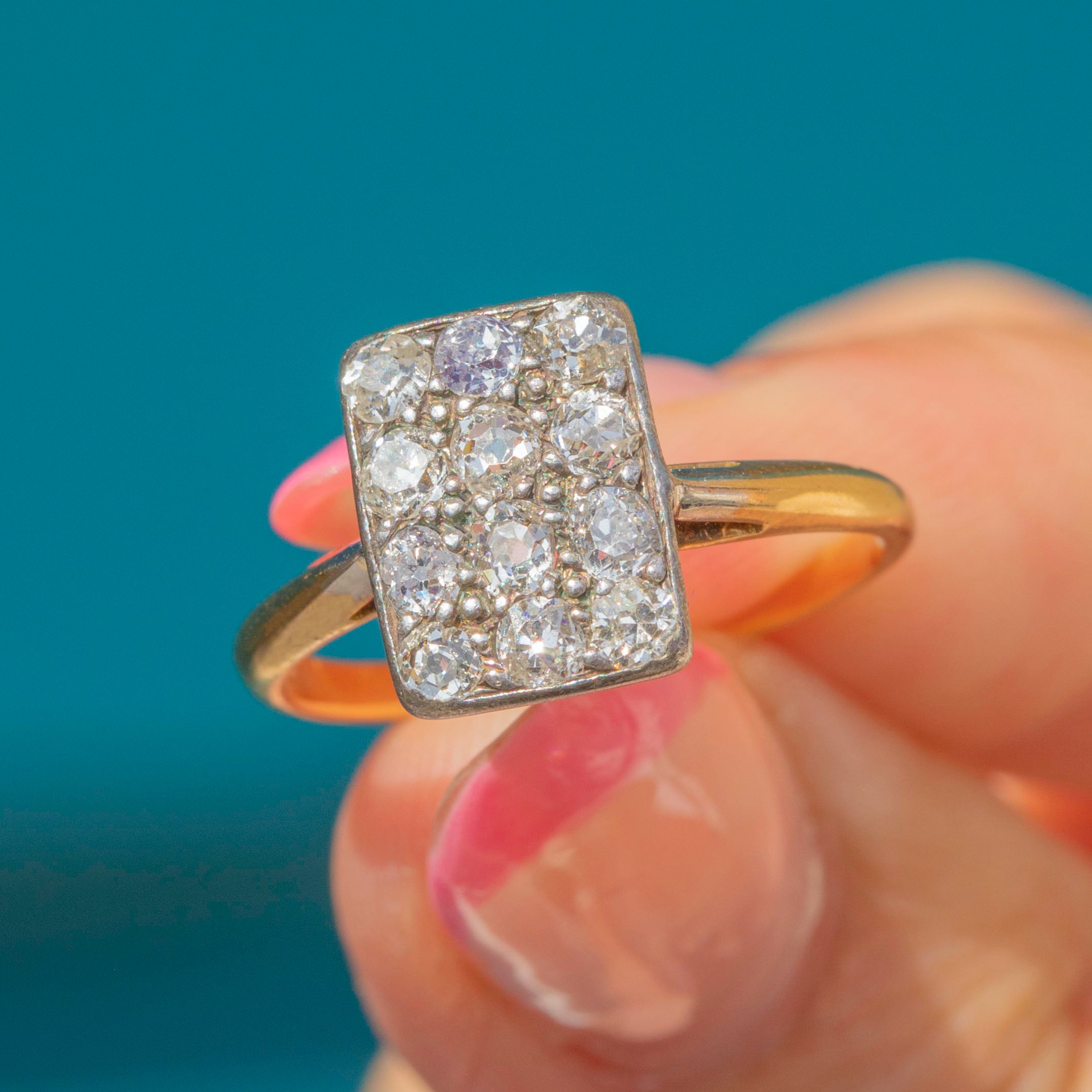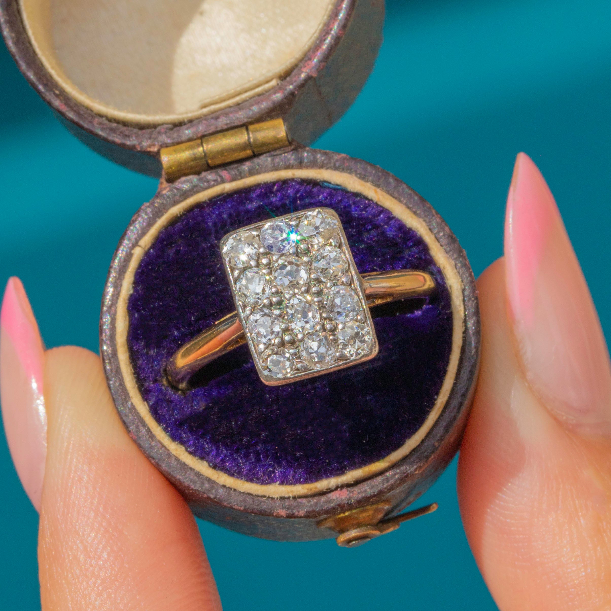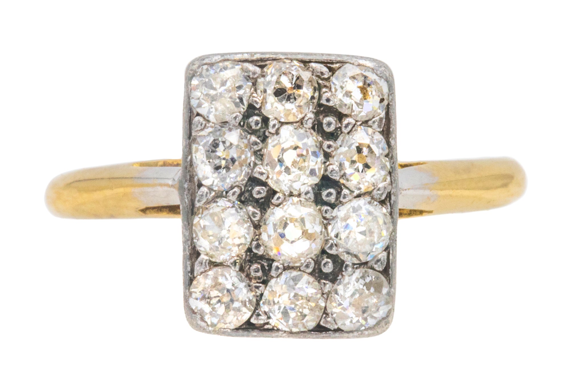 This Art Deco Diamond panel ring is classically beautiful! Embellished with 12 bright old mine-cut Diamonds, her rectangular cluster ring face twinkles at every angle.