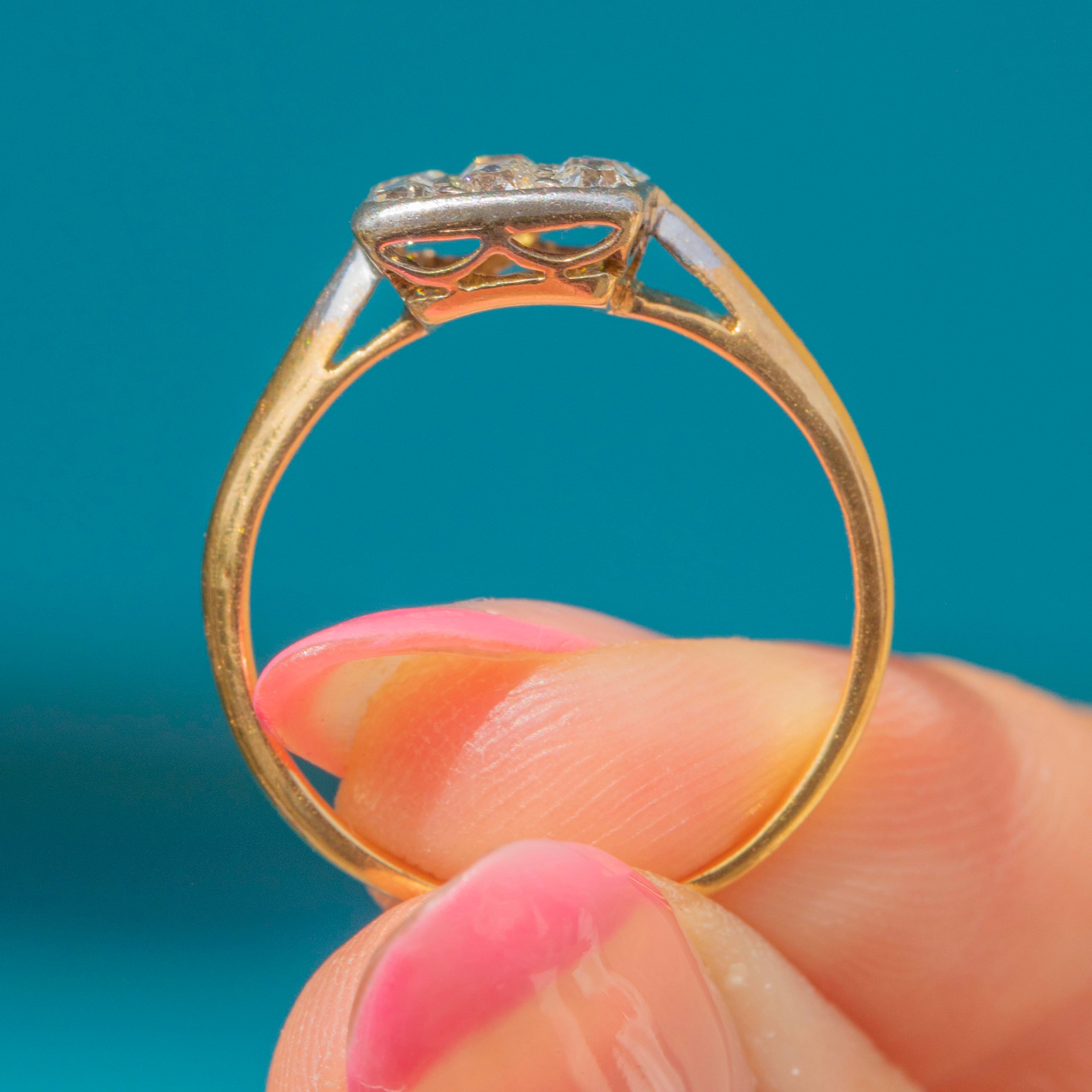 MATERIALS: Tests as 18ct Gold, Silver settings, Old Mine-Cut Diamonds (0.50ct total).