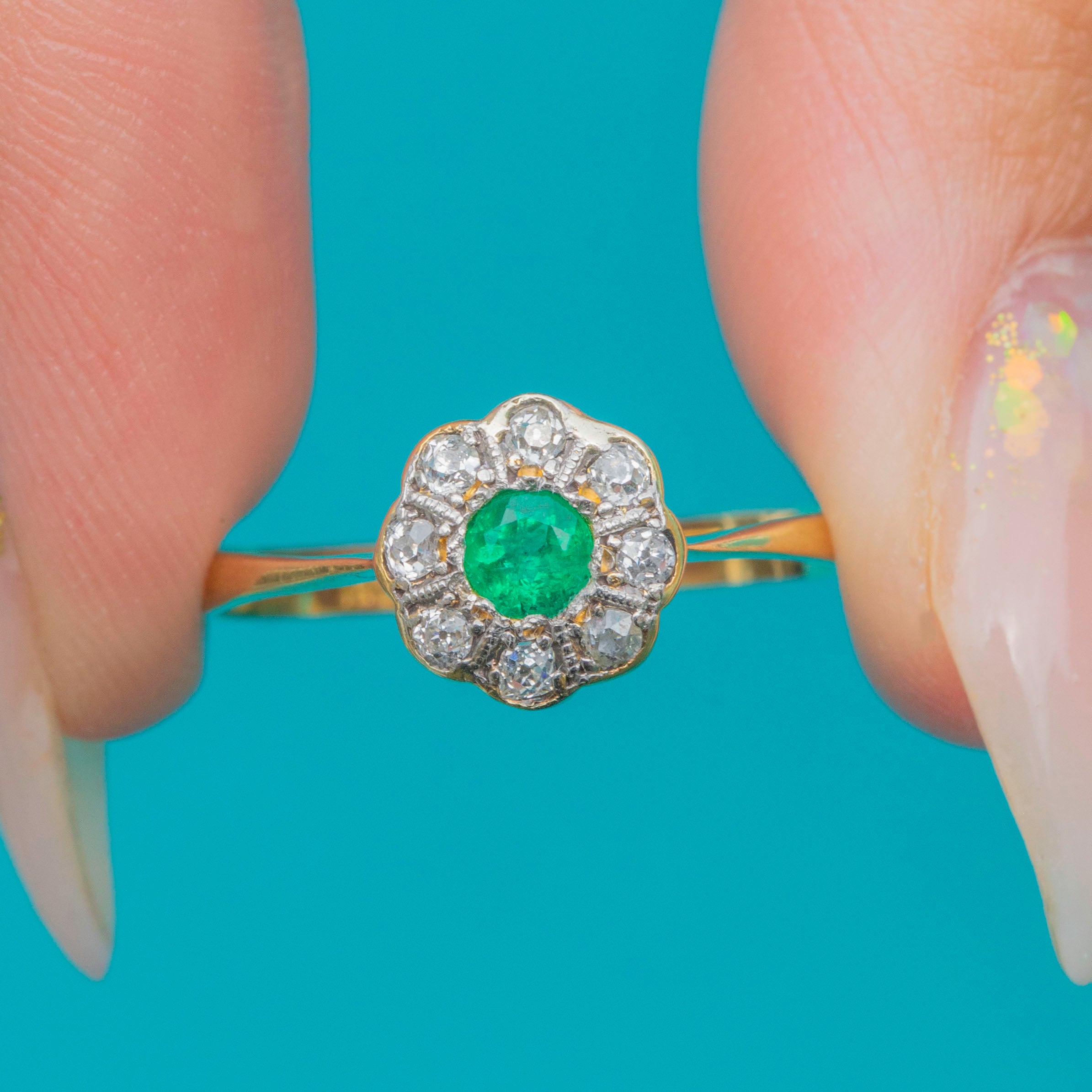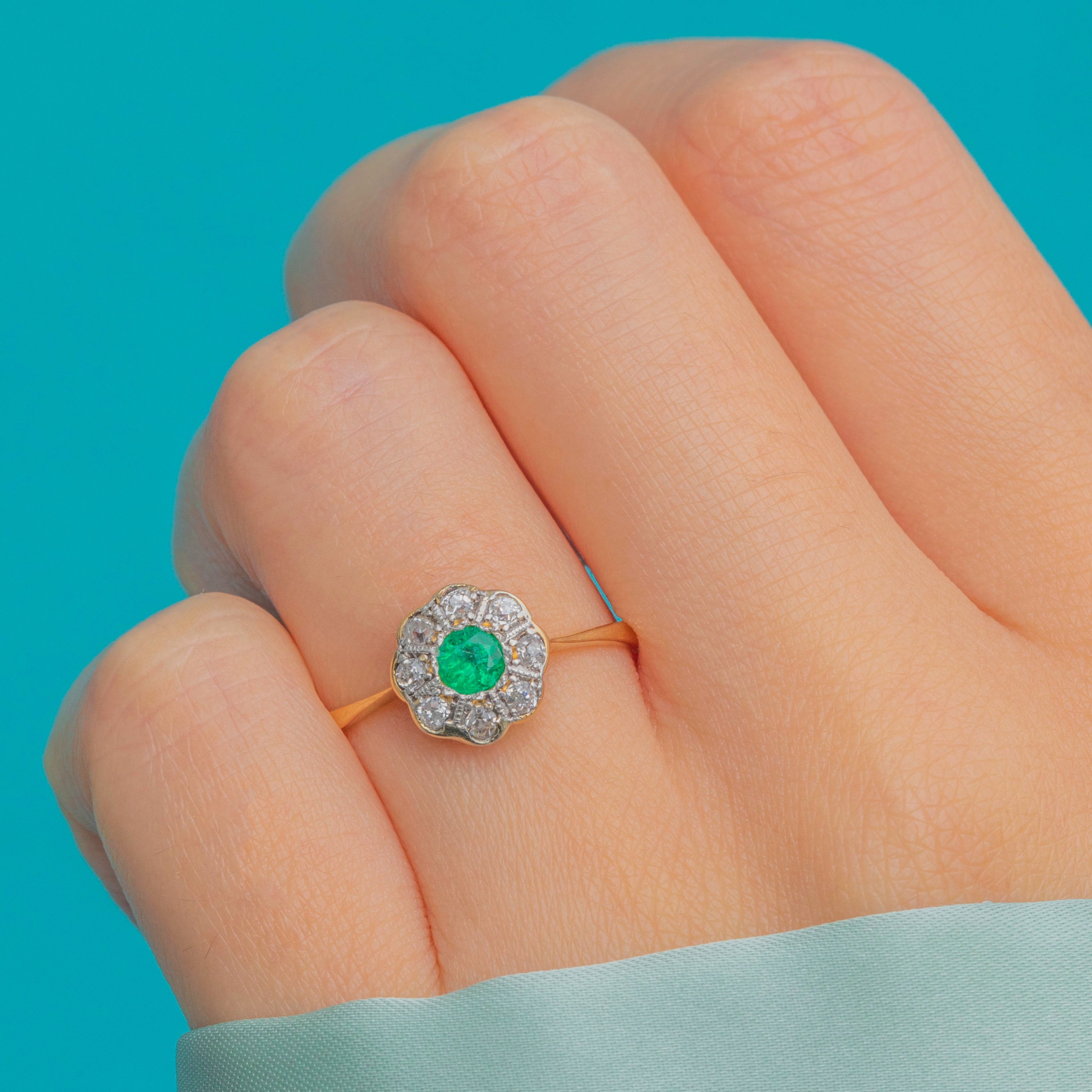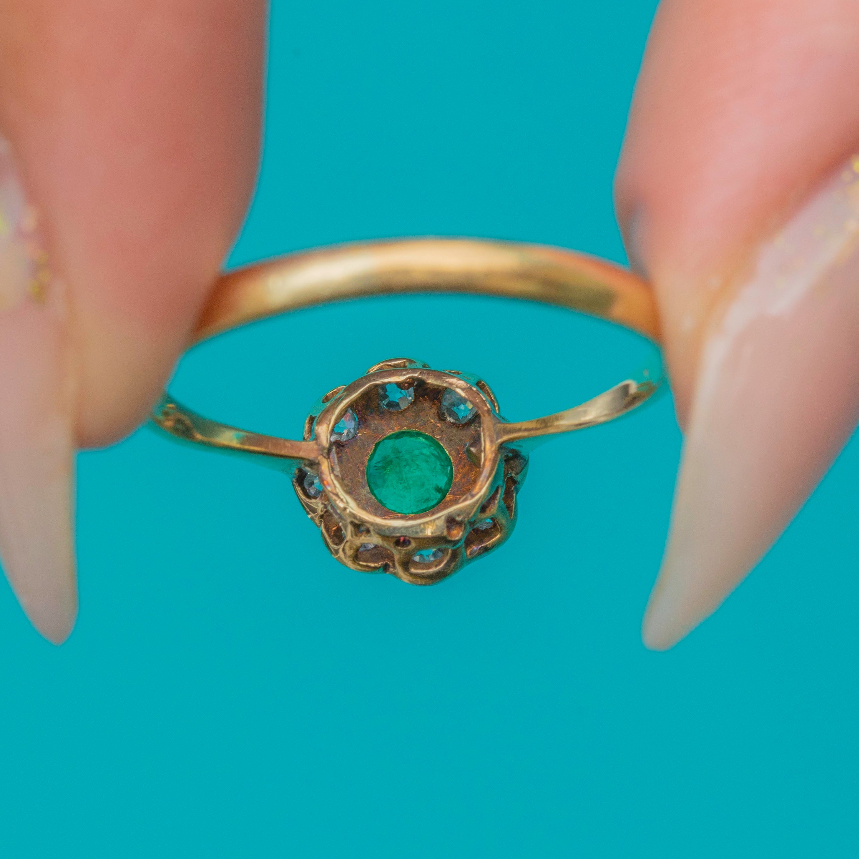 The central Emerald glows with a rich green hue, framed by a constellation of antique-cut Diamonds that add charm and fire to the piece. With its neat proportions and classic round cluster form, this ring makes a wonderful choice for everyday wear, stacking, or as a meaningful antique engagement ring.