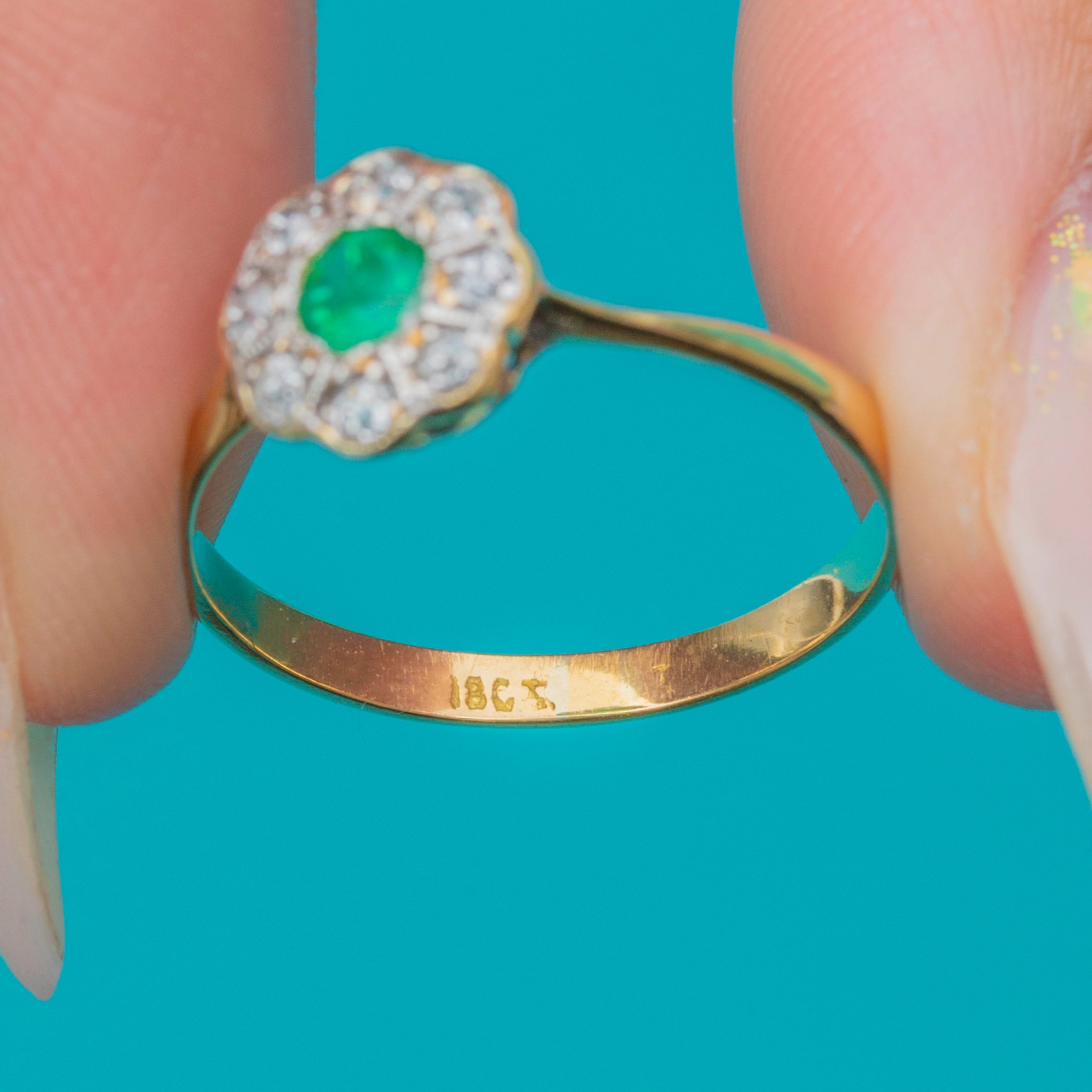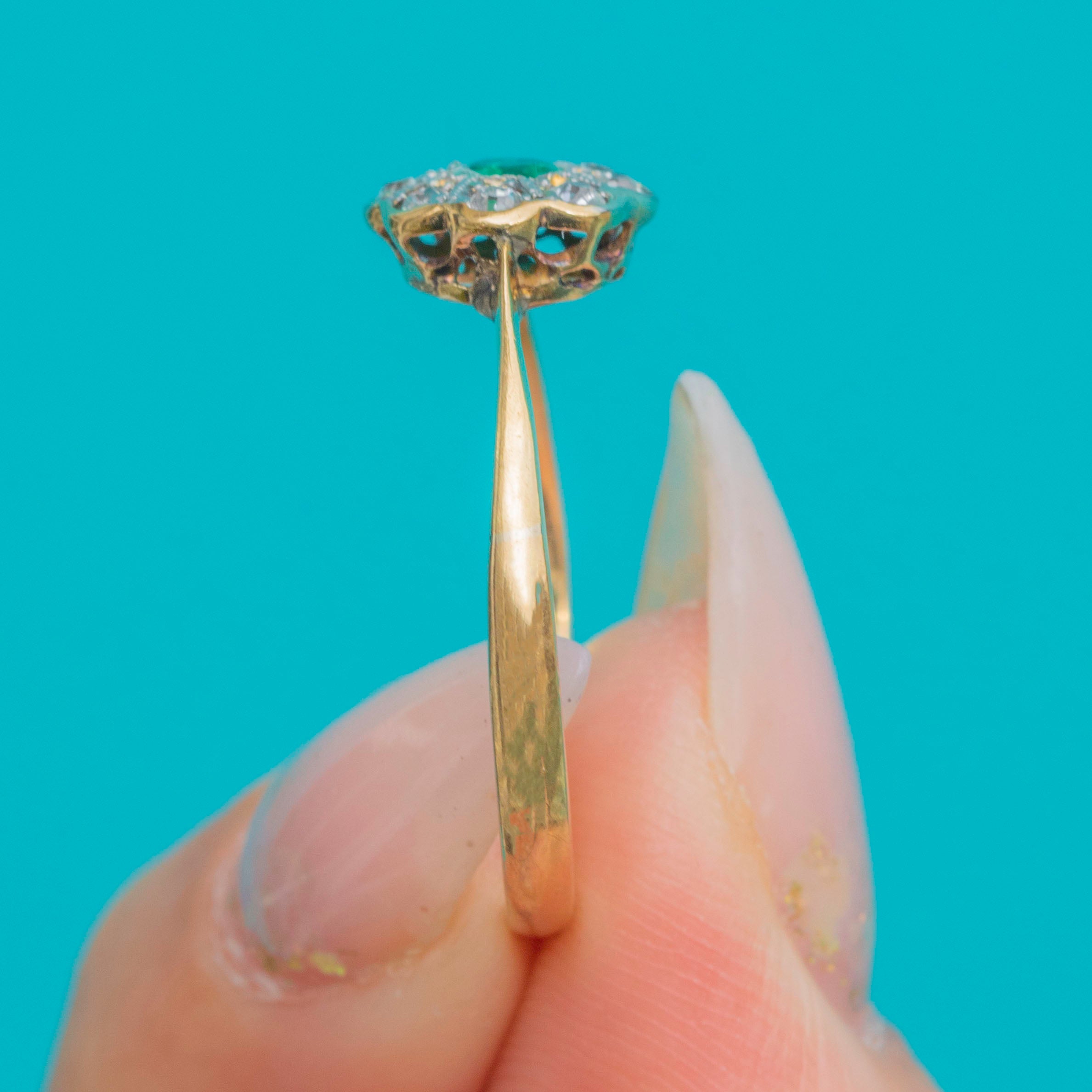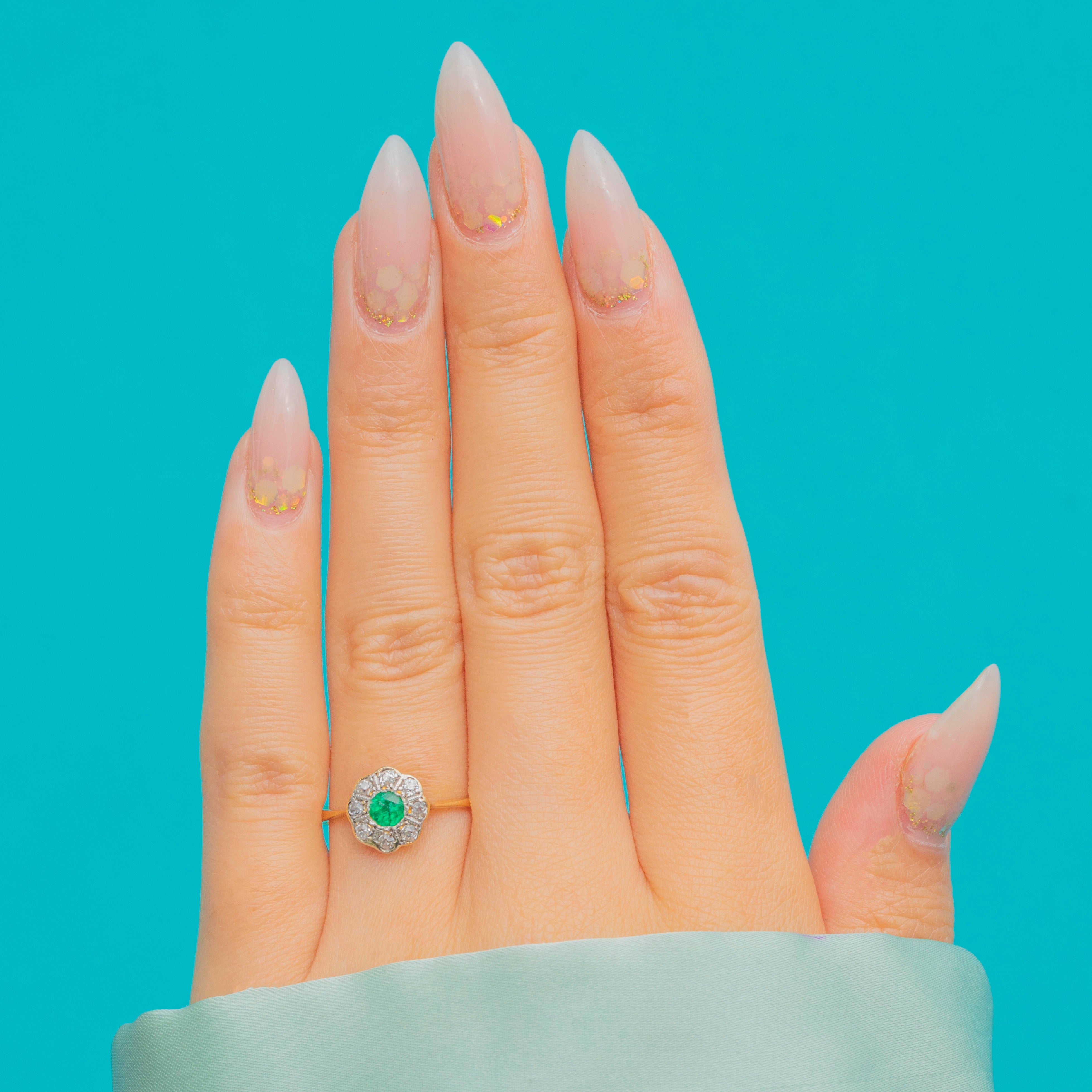 The central Emerald glows with a rich green hue, framed by a constellation of antique-cut Diamonds that add charm and fire to the piece. With its neat proportions and classic round cluster form, this ring makes a wonderful choice for everyday wear, stacking, or as a meaningful antique engagement ring.