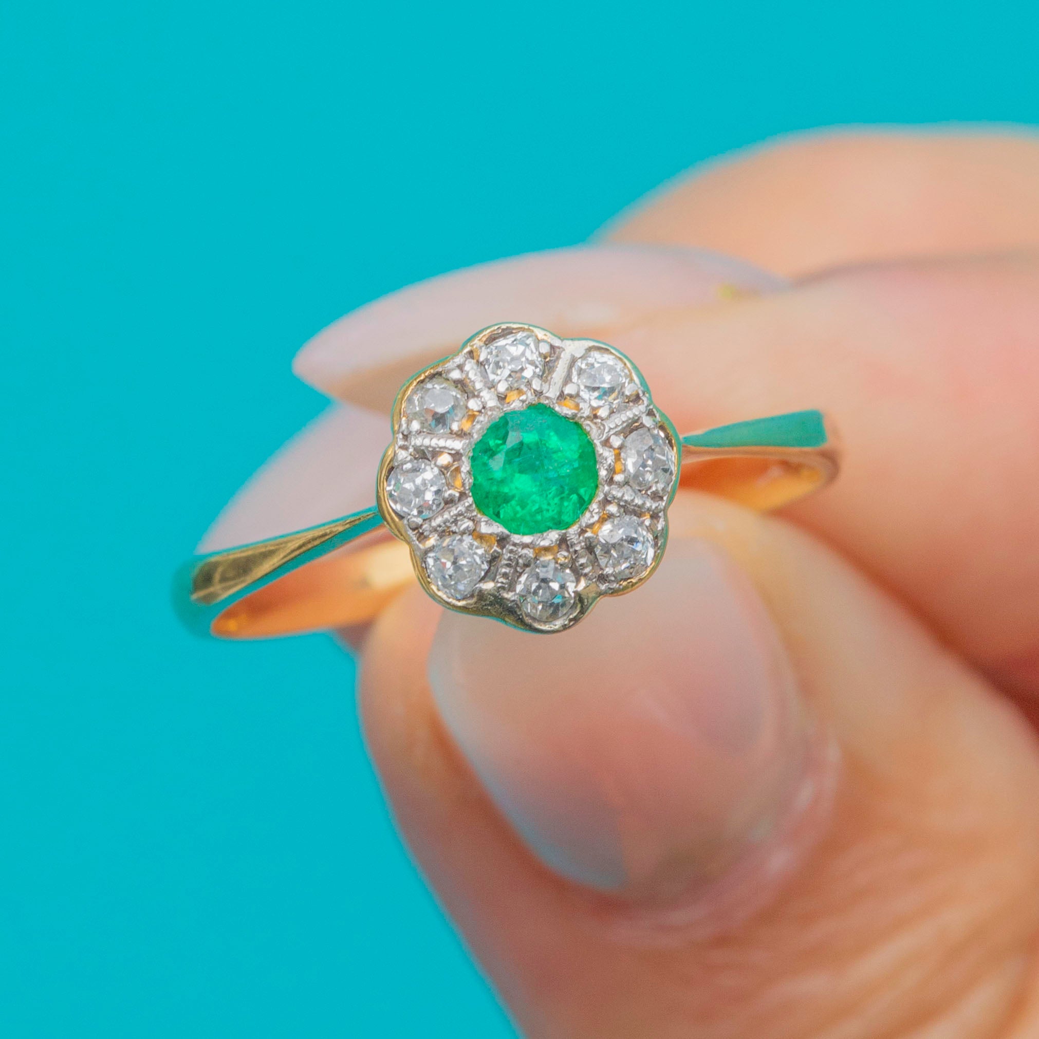 This dainty Art Deco cluster ring showcases a vivid Emerald surrounded by a halo of glittering old mine-cut Diamonds. Crafted in 18ct Gold, the design is a timeless favourite of the 1920s, radiating both colour and sparkle in equal measure.