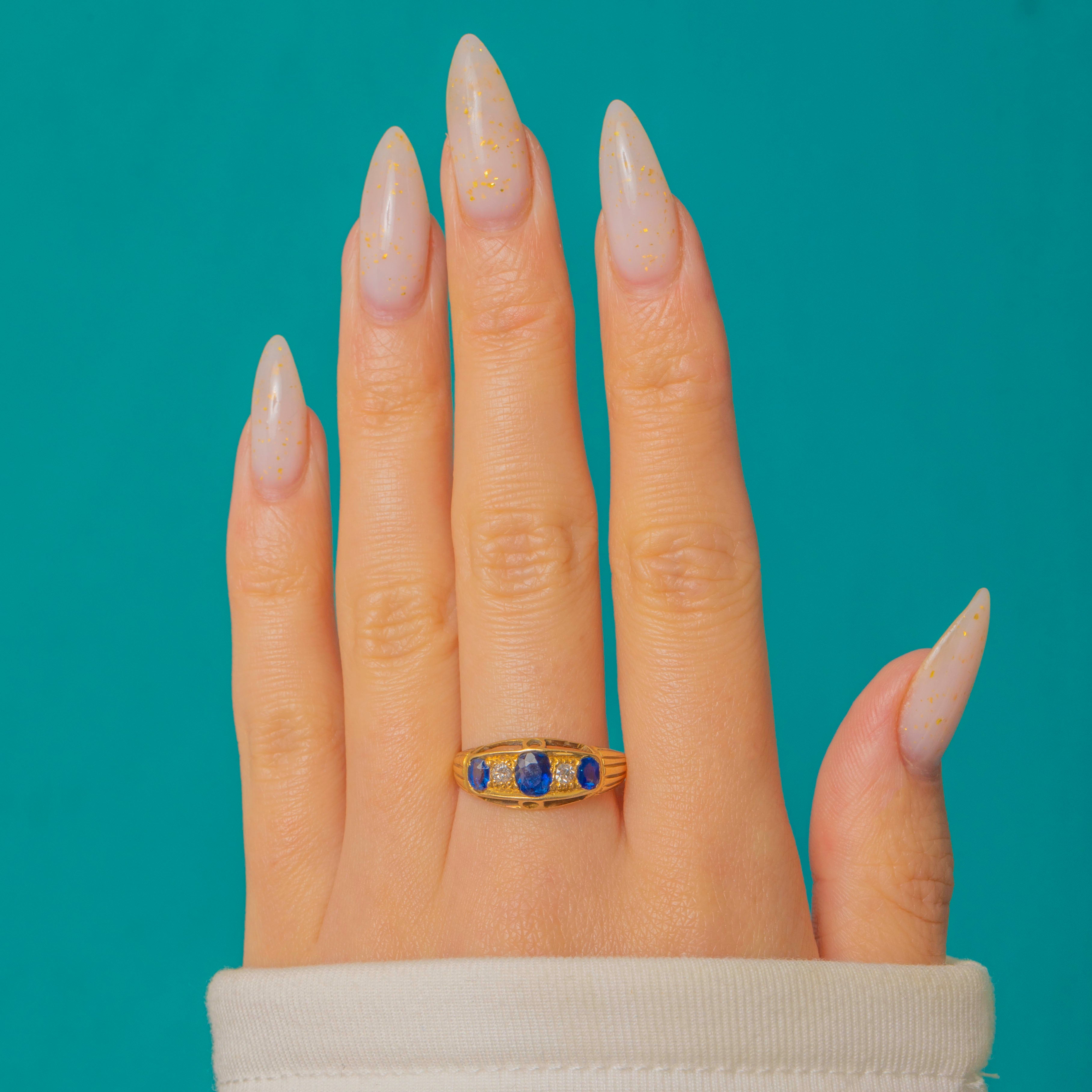 Sleek, architectural and unmistakably Art Deco, this five-stone boat ring is crafted in rich 18ct Gold and set with a trio of vivid Royal blue Natural Sapphires punctuated by two bright transitional-cut Diamonds, all presented in refined settings with an open gallery and stepped, fluted shoulders for that quintessential period poise.