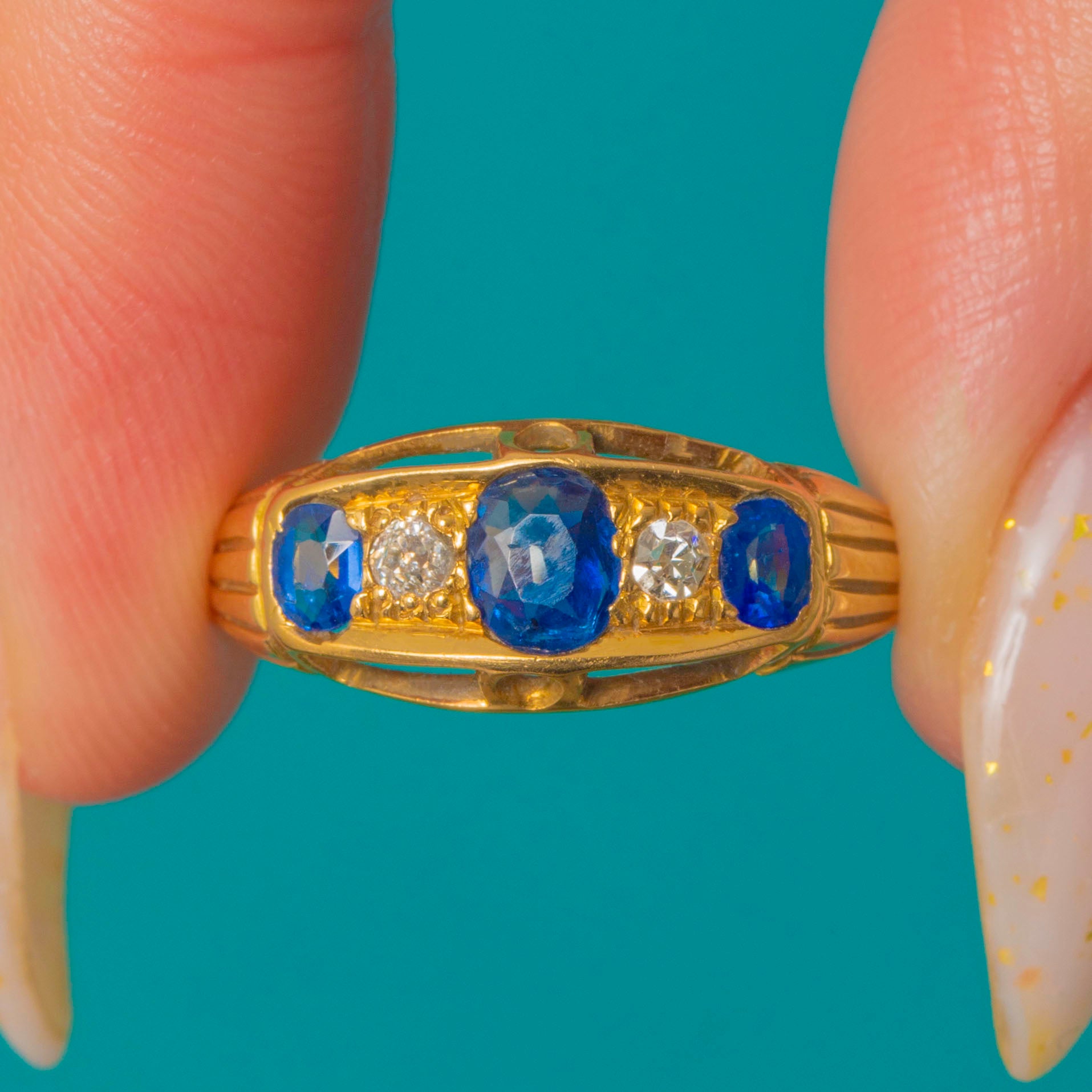 EXCELLENT: The Sapphires and Diamonds are bright and well-matched, with only light surface wear visible under magnification. The 18ct Gold band and settings are crisp and secure, showing minimal age-related wear. Beautifully preserved and ready to wear.