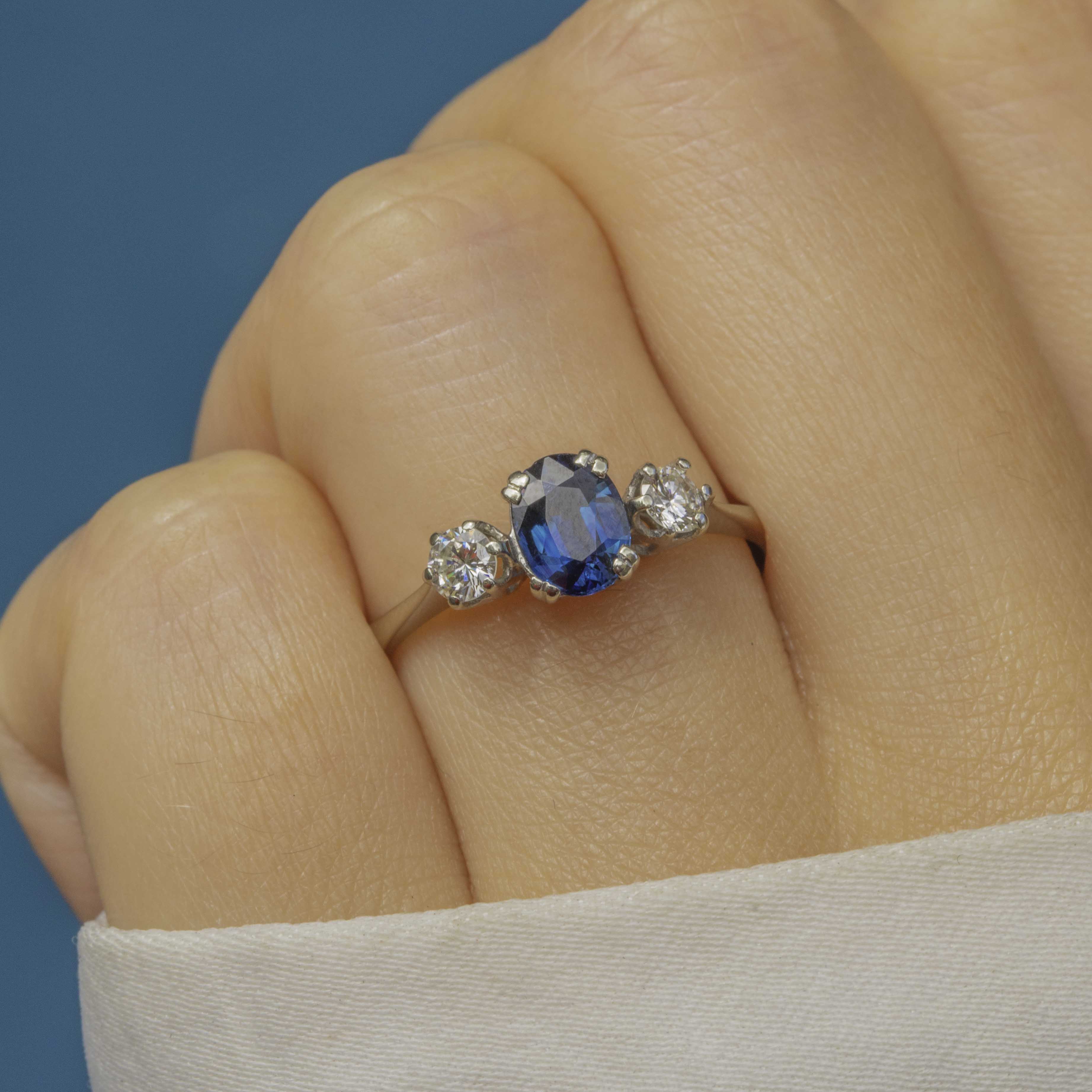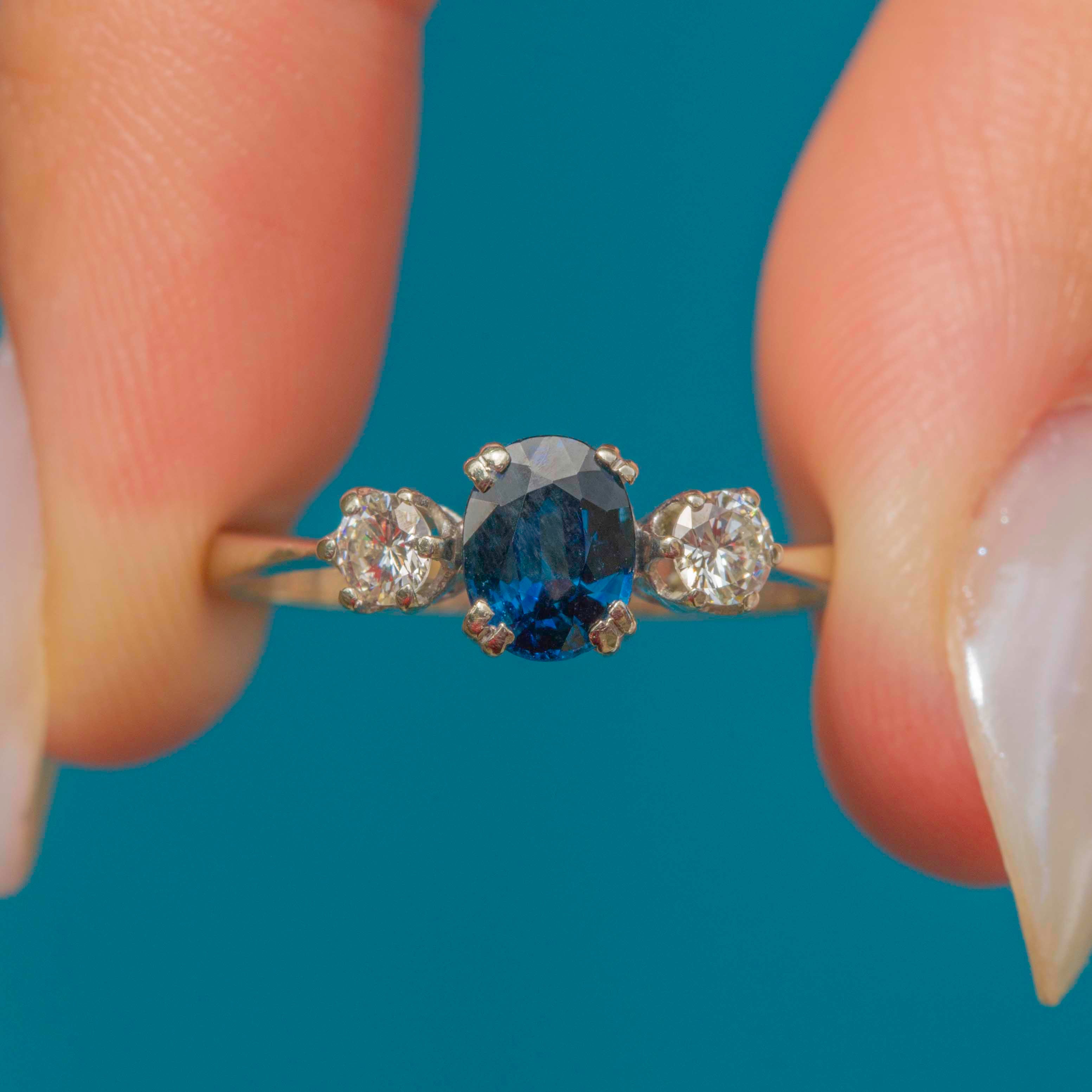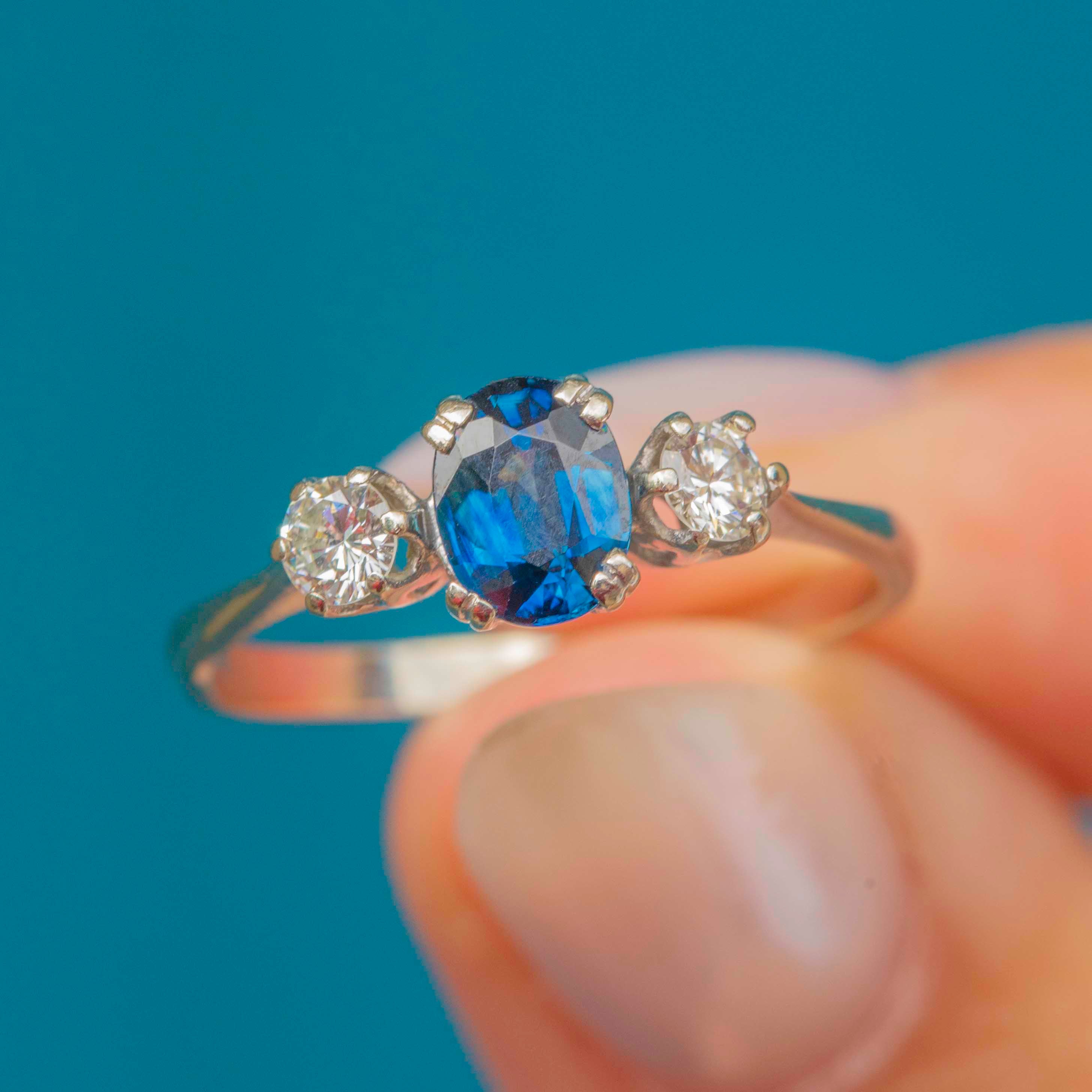VERY GOOD: The gemstones are wonderfully preserved and are securely set. The 18ct Gold has a gorgeous lustrous sheen, and is free from dings or dents, with only minor scratches on the inside of the band. One of the prongs of the claw setting on the Sapphire has ever so slightly worn but it still holds the Natural Sapphire secure. This does not affect the overall impact of the piece.