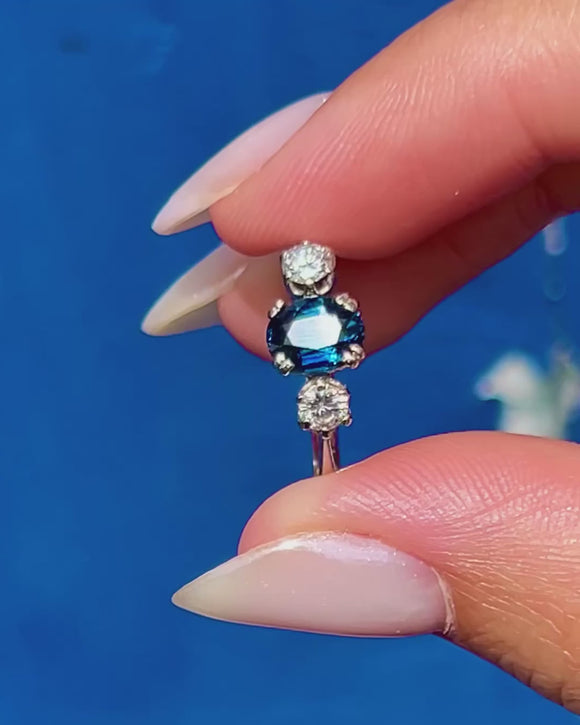 Poised at the centre of this ring is a magnificent 0.80ct royal blue Sapphire, flanked by twinkling Diamonds, winking with every twist and turn of the finger, all set in bright 18ct White Gold.