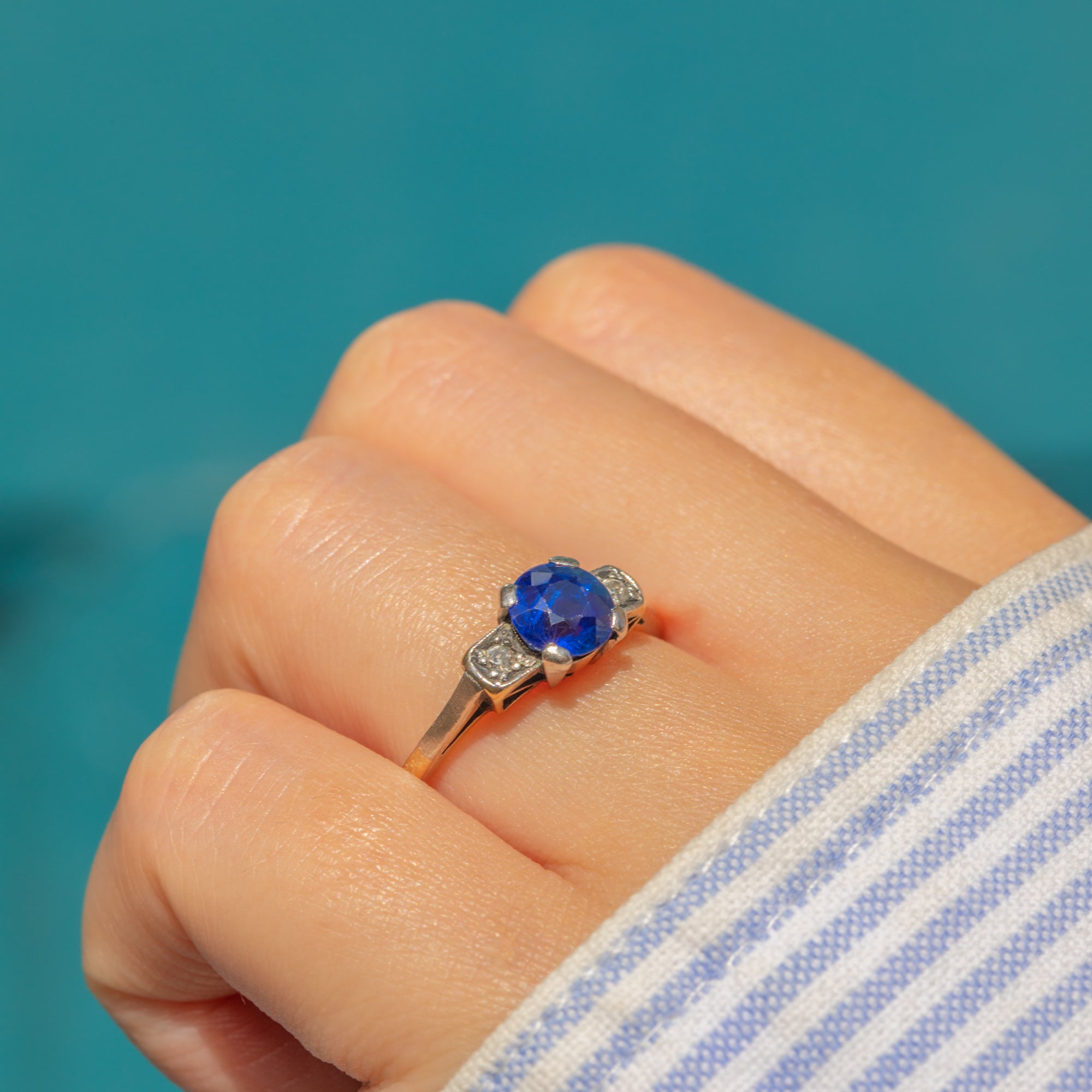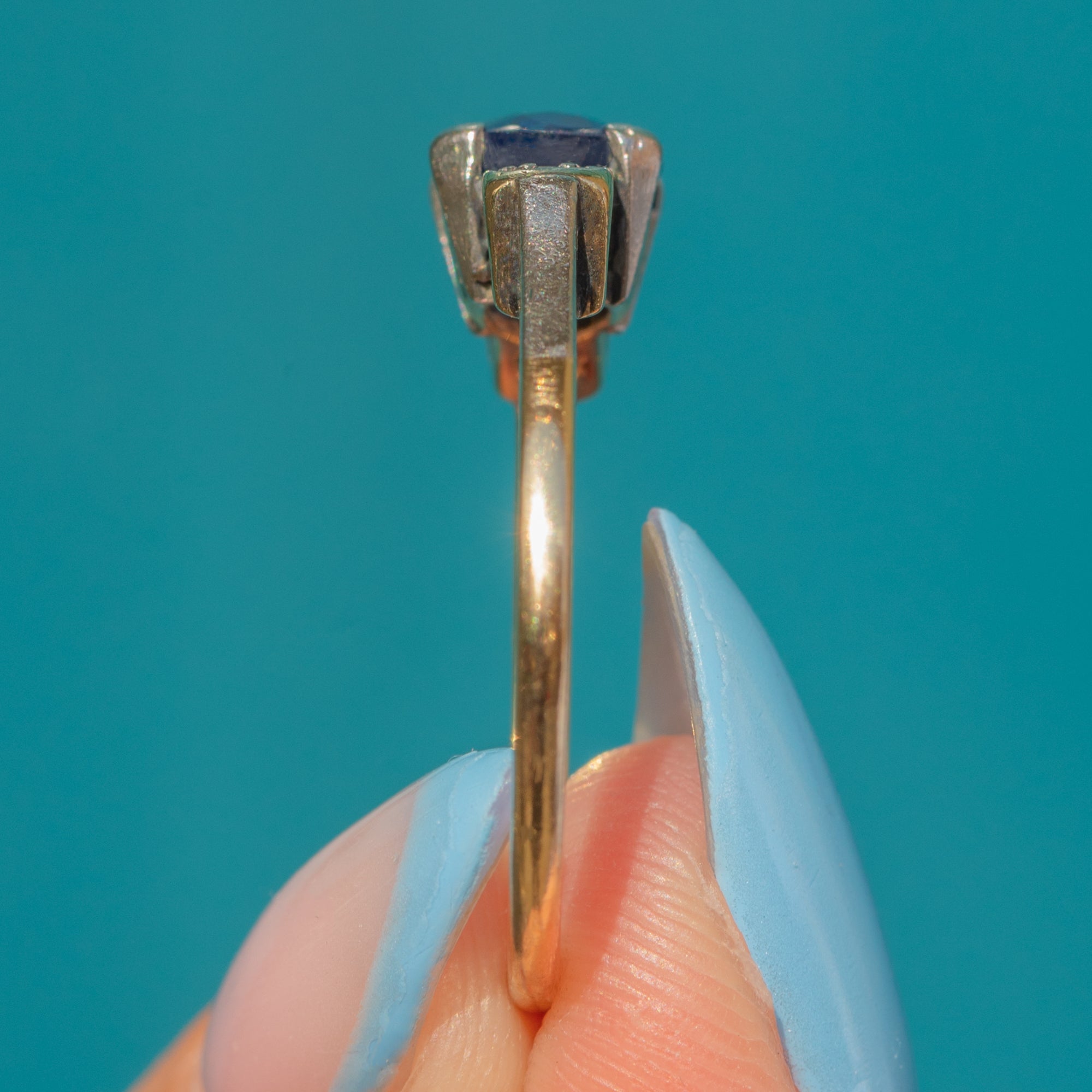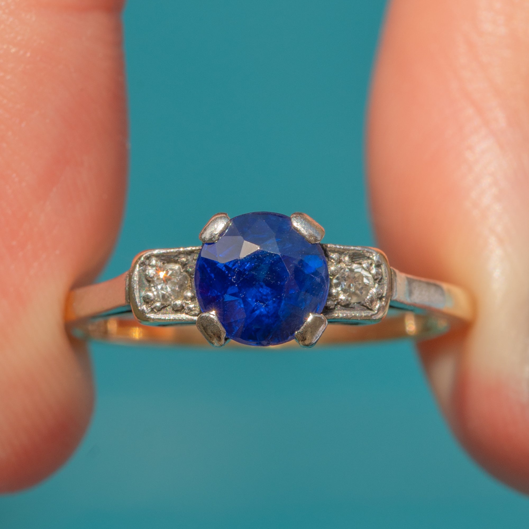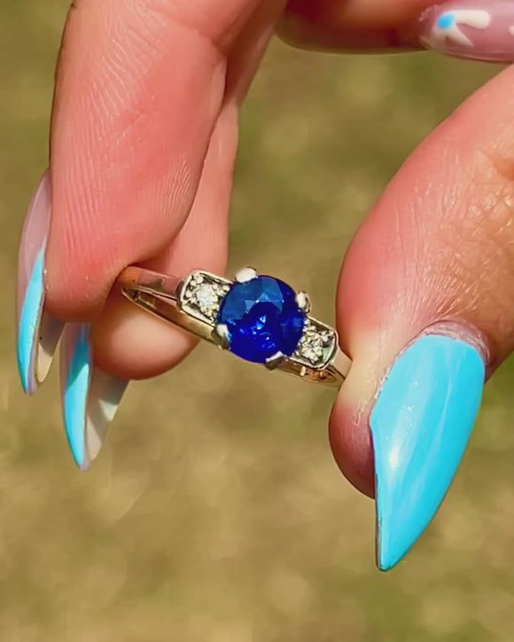 EXCELLENT: The Sapphire has a deep, saturated hue and crisp facets that are free from chips or abrasions. The Diamonds are bright, and the gemstones are all secure within their Platinum settings. The 18ct Gold band is smooth and has held its form well, providing comfortable wear.