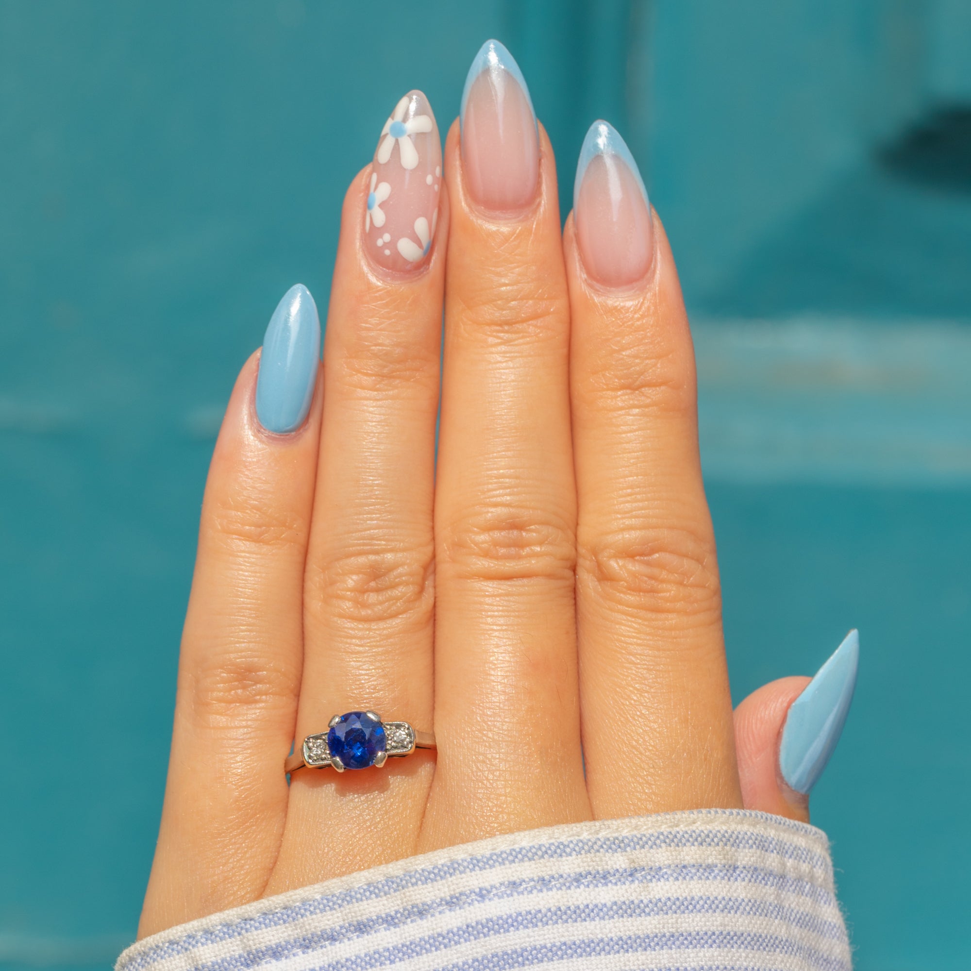 Classically Art Deco in design, this ring boasts a natural 1.04ct true blue Sapphire flanked by glimmering Diamonds displayed in geometric Platinum settings, with a raised profile that allows the light to stream through the gemstones from every angle.