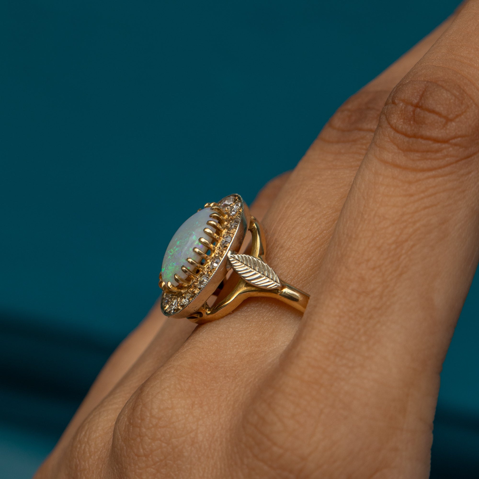 The bright blue centre of the Opal is speckled with flashes of electric green and neon orange and, combined with glittering Diamonds, this piece comes to life under the light; this Art Deco ring is a conversation starter!