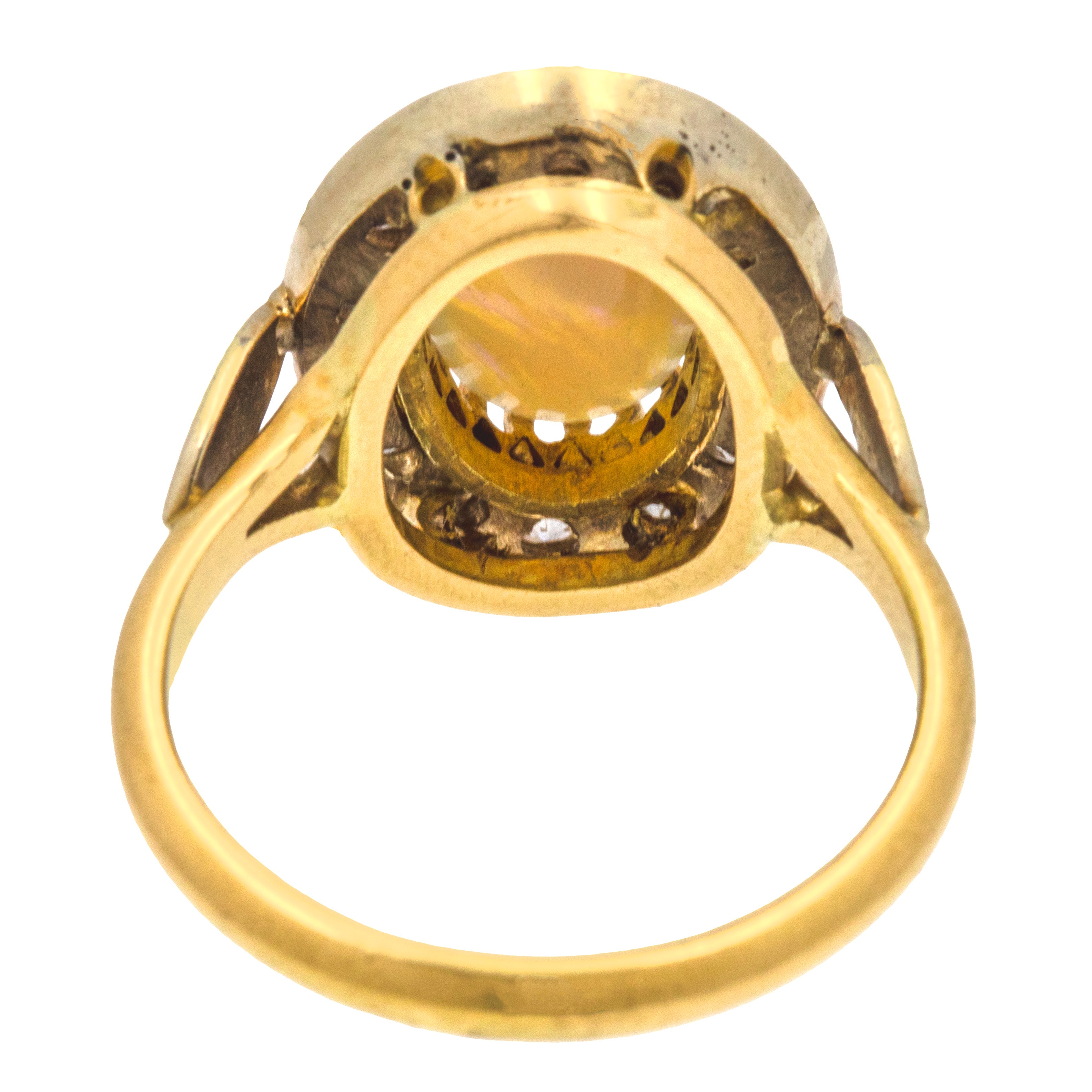 EXCELLENT. This Art Deco 18ct Gold Opal Diamond cluster ring is offered in excellent condition. The Opal is smooth to the touch, free from nibbles or chips, and the Diamonds are sparkly and free from fleabites. The 18ct Gold is saturated and the details have remained crisp, each of the gemstones are securely set. With proper care and maintenance, this ring will last for generations to come!