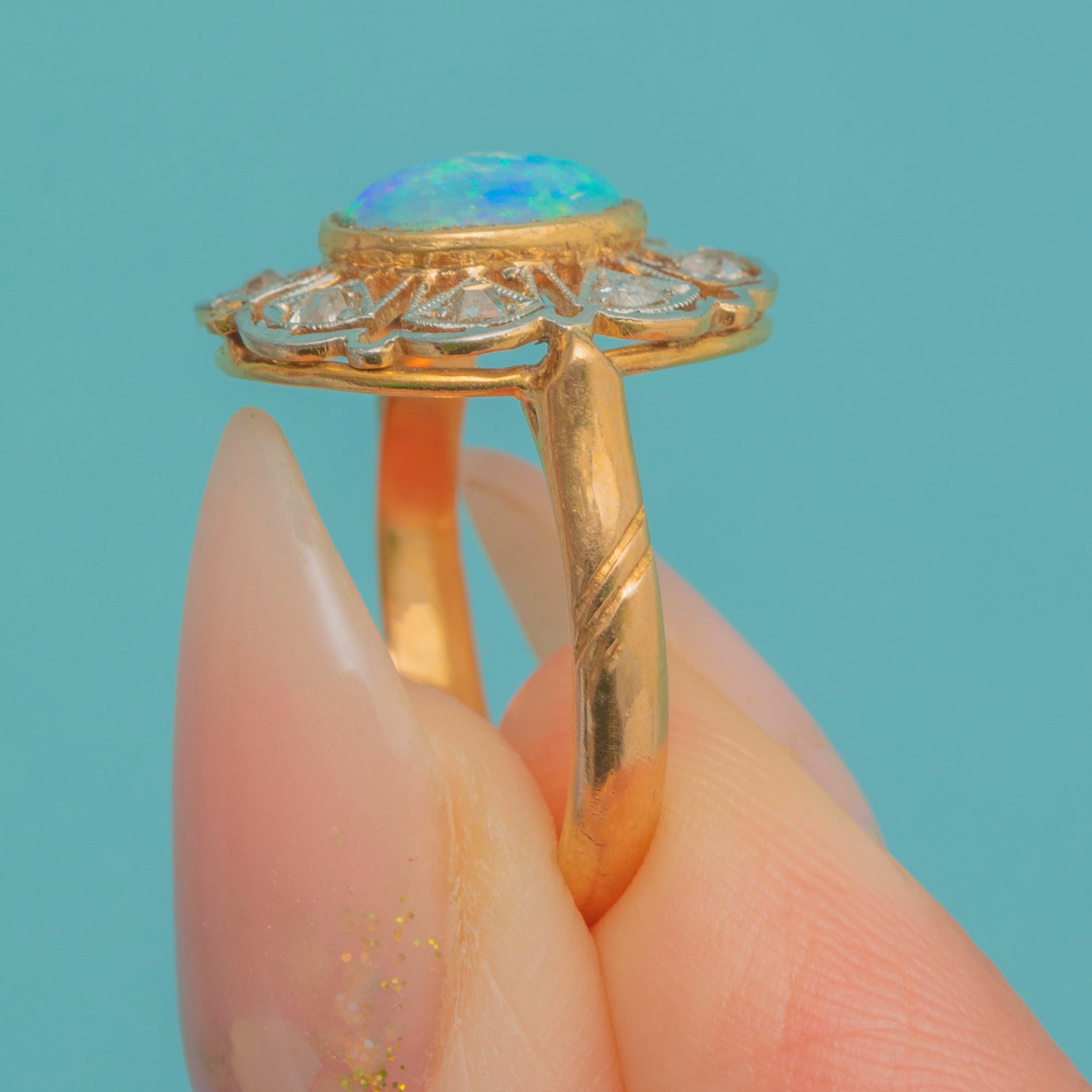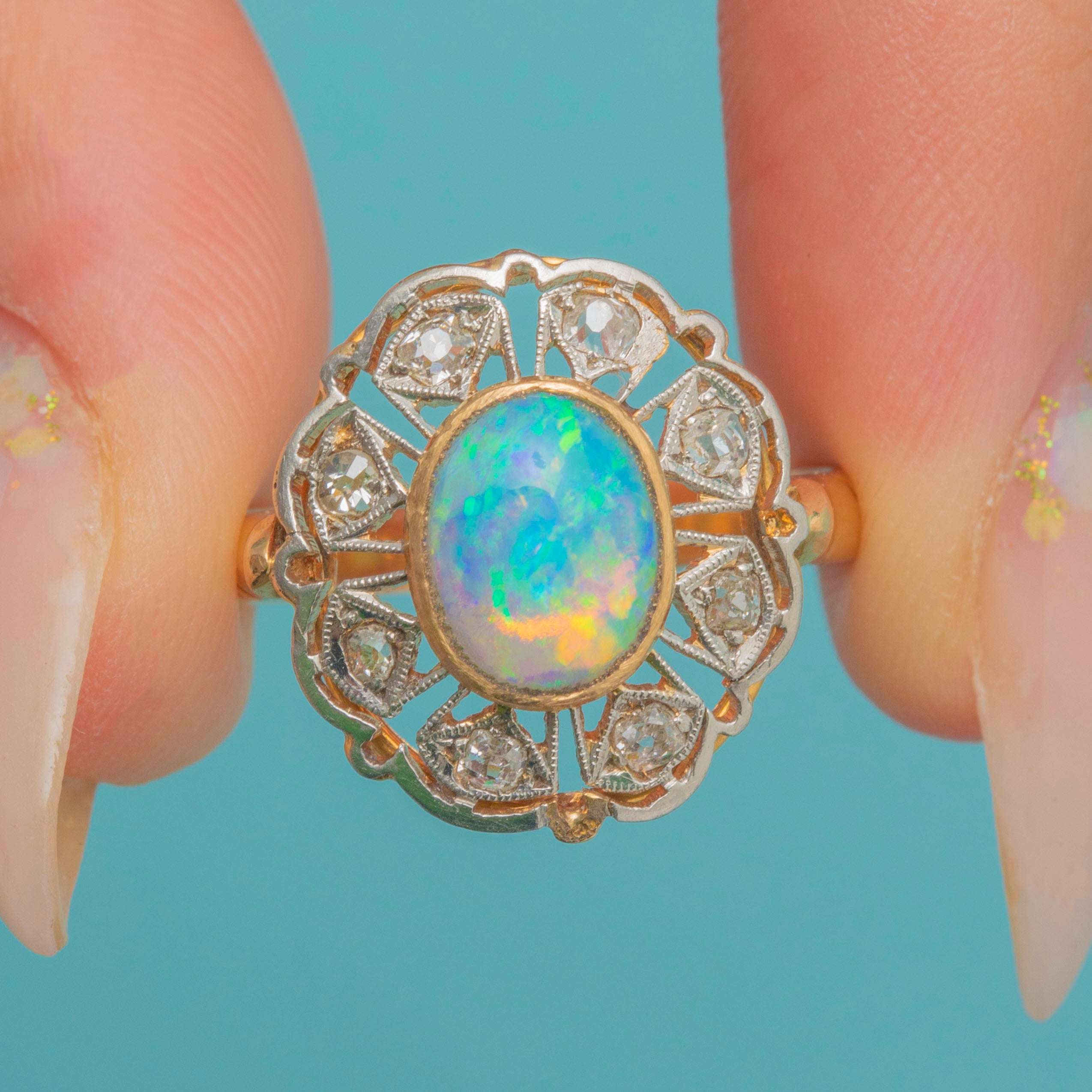 This exquisite Art Deco cluster ring is crafted in 18ct Gold and set with a luminous Opal surrounded by a halo of glittering old mine cut Diamonds. The Opal cabochon glows with shifting flashes of colour, beautifully complemented by the sparkle of eight lively Diamonds.