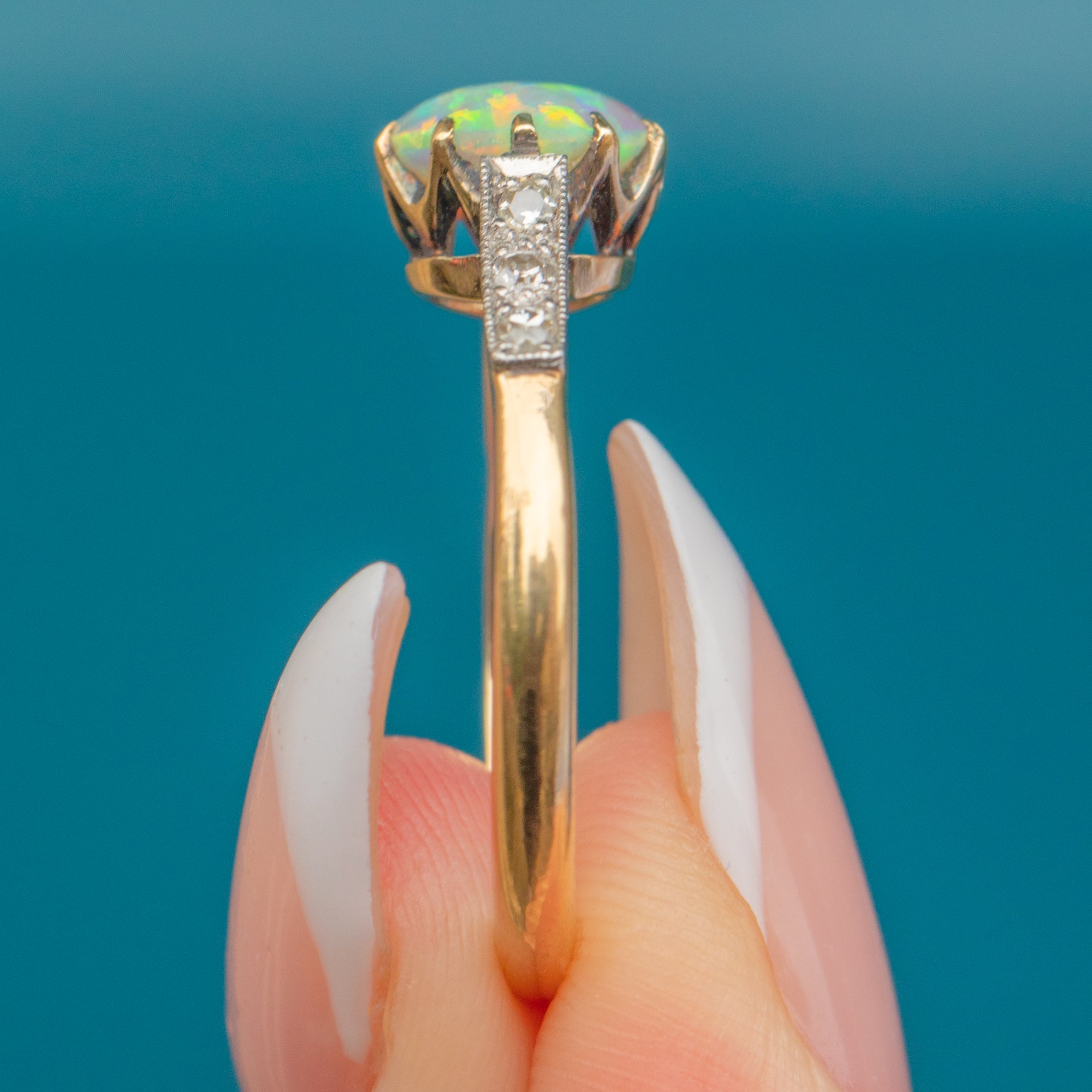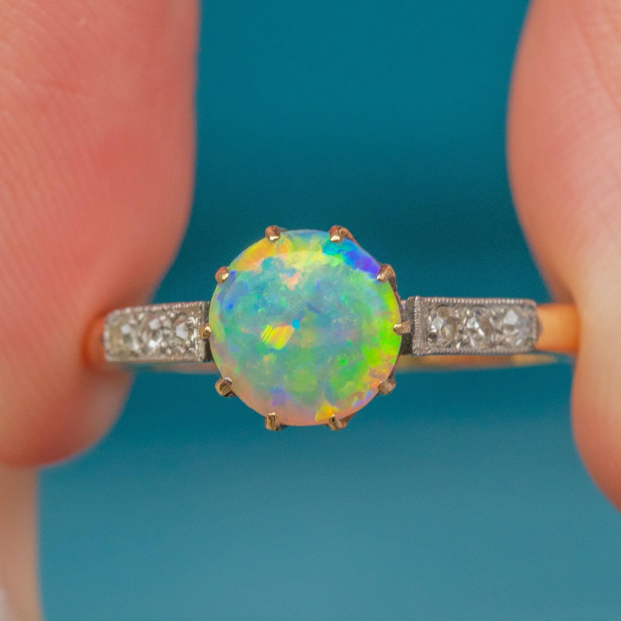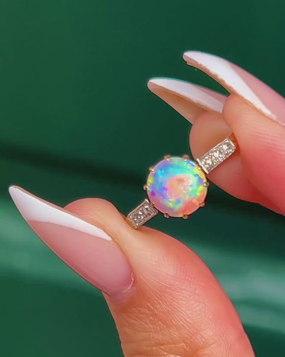 This striking Art Deco ring is crafted in 18ct Gold with Platinum-tipped settings and features a luminous Opal at its centre. The Opal measures 7.5mm across and displays a vibrant rainbow play of colour, alive with flashes of green, orange, and blue. It is framed by sparkling Diamond shoulders that add sophistication and light, making this ring a perfect blend of elegance and drama.
