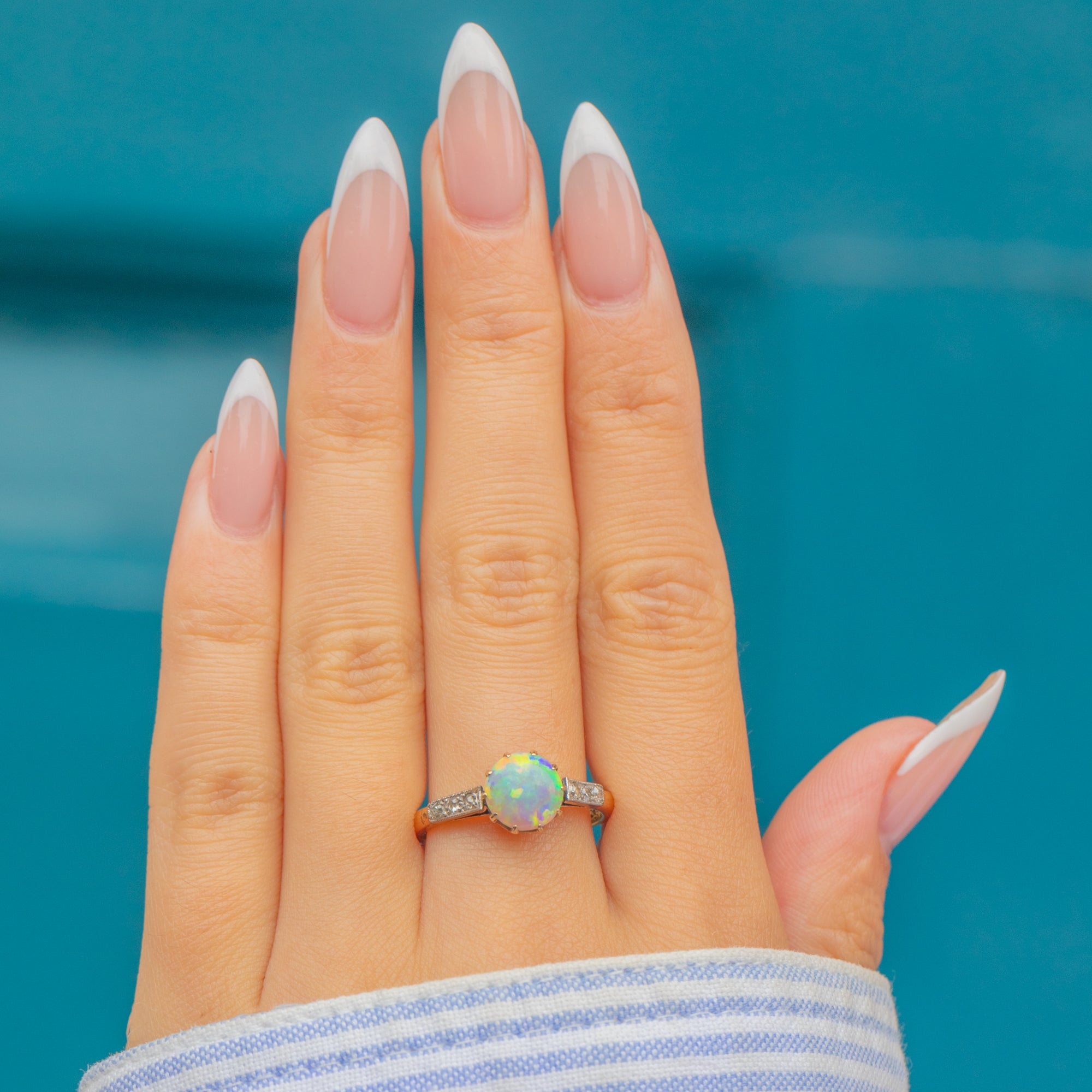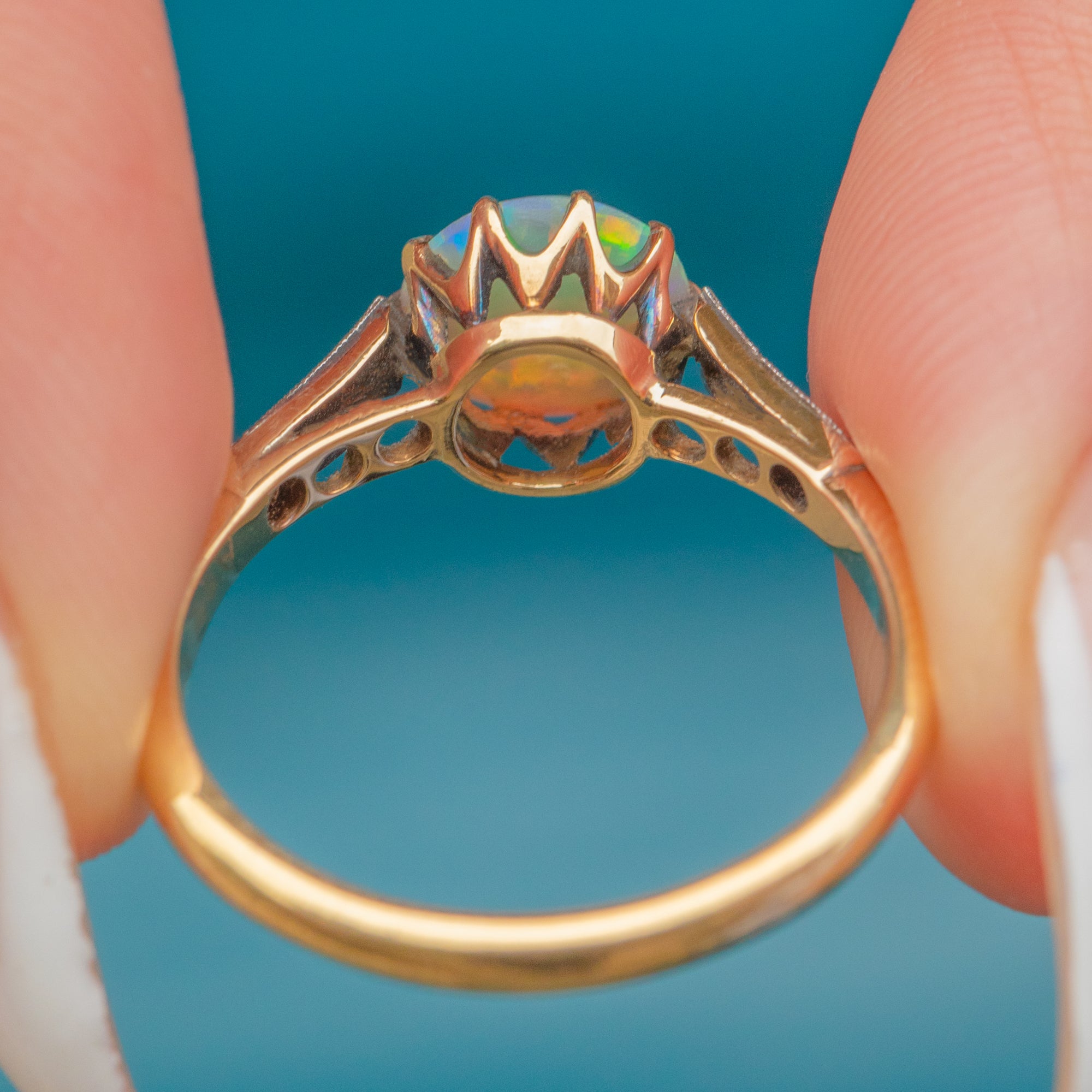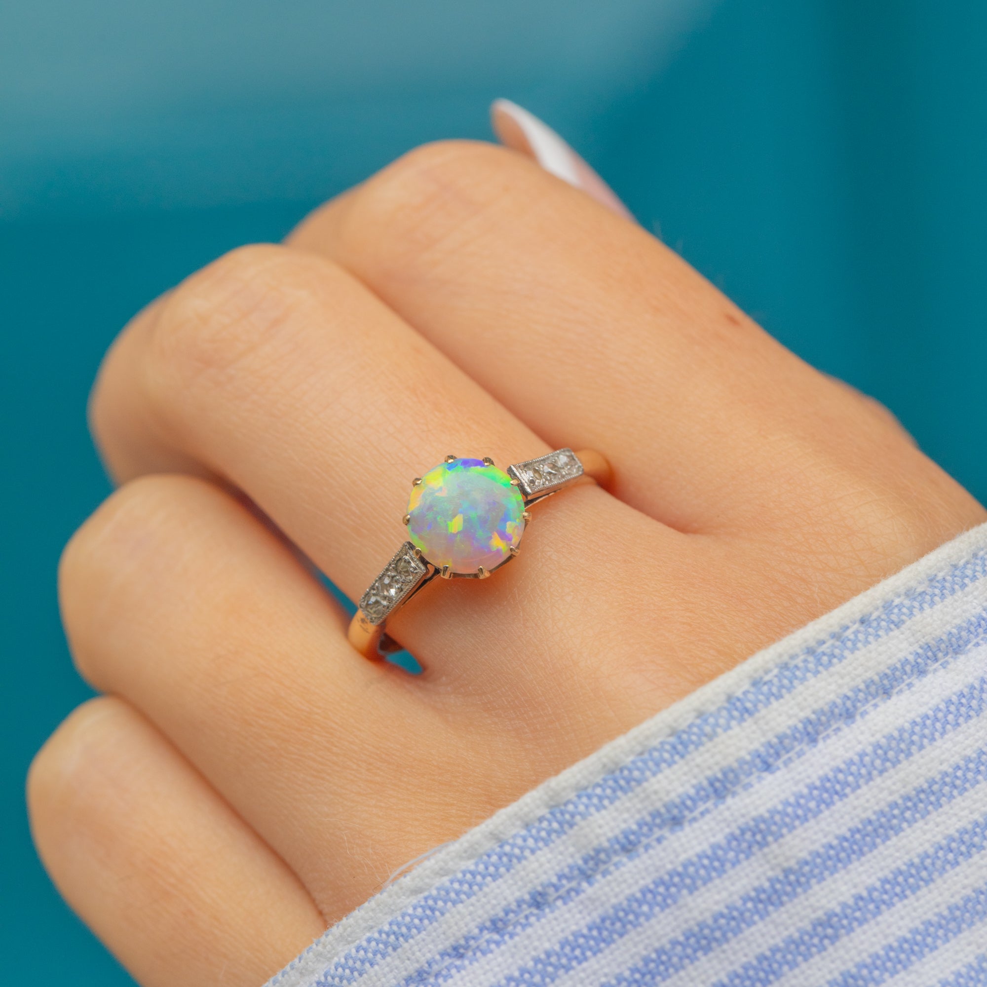 This striking Art Deco ring is crafted in 18ct Gold with Platinum-tipped settings and features a luminous Opal at its centre. The Opal measures 7.5mm across and displays a vibrant rainbow play of colour, alive with flashes of green, orange, and blue. It is framed by sparkling Diamond shoulders that add sophistication and light, making this ring a perfect blend of elegance and drama.