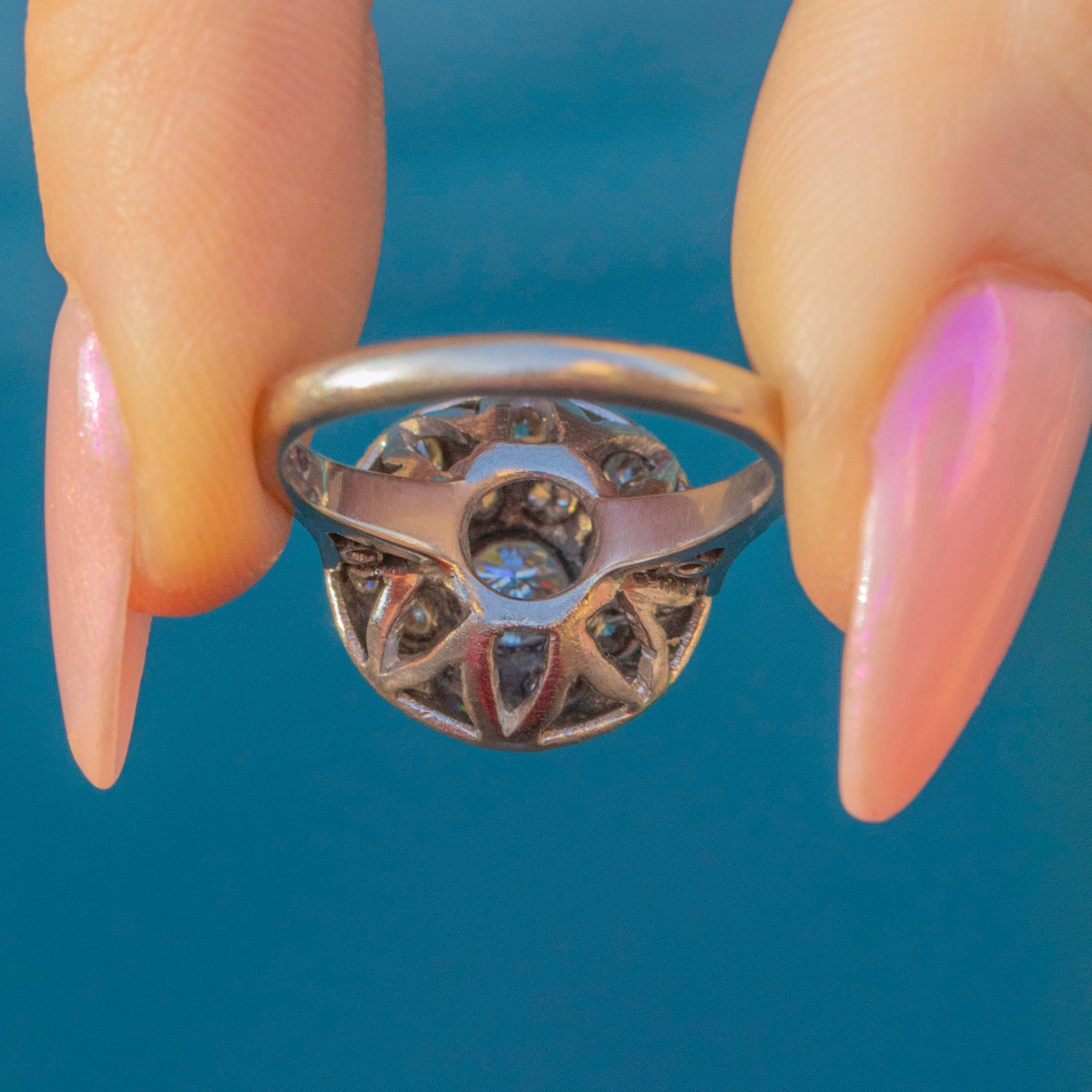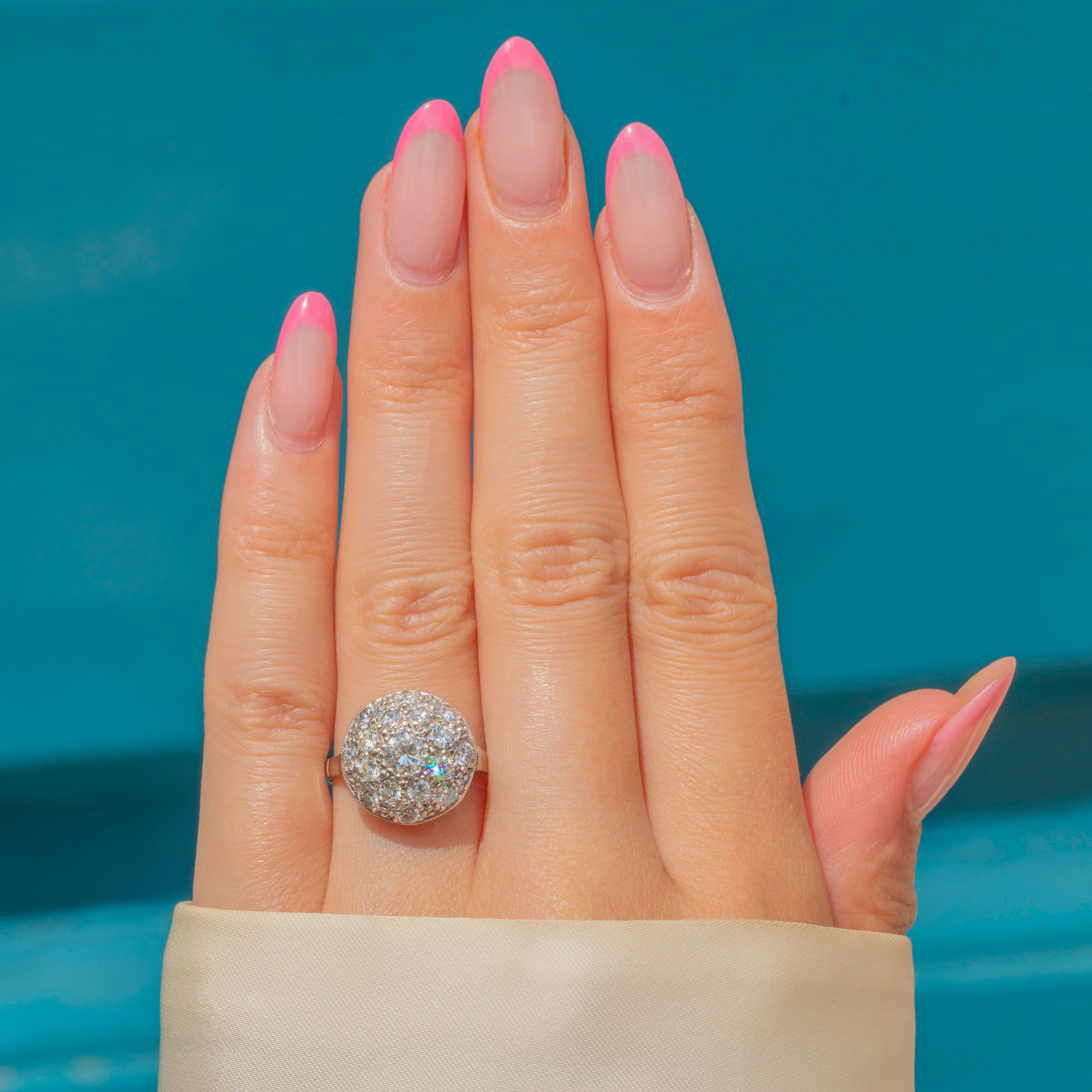 This Art Deco 18ct Gold & Platinum Diamond bombe cluster ring will bring the wow factor to any ensemble! Inlaid with a generous sprinkling of Diamonds, with a combined weight of 1.16ct, set in Platinum illusion settings, this antique ring is a sensational piece.