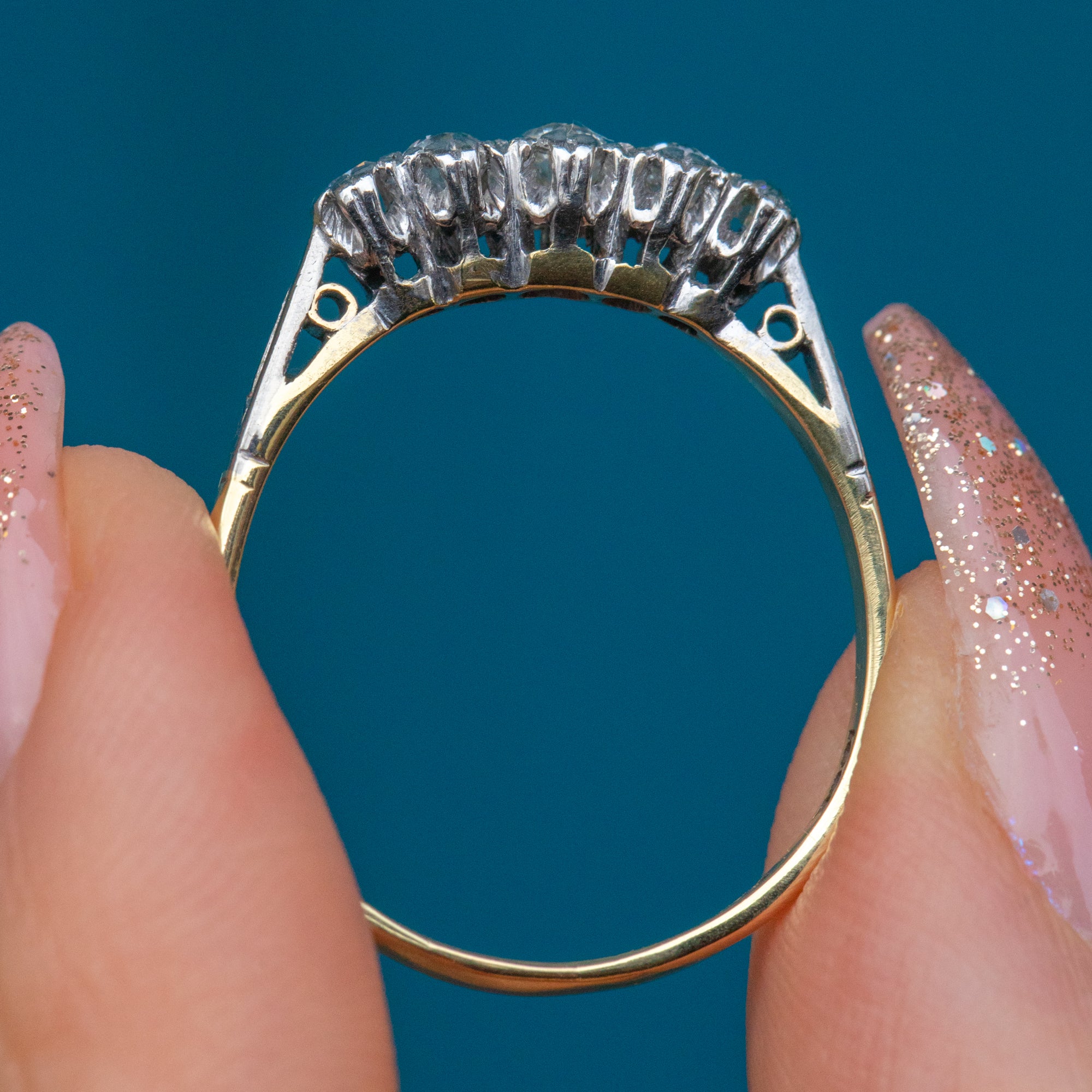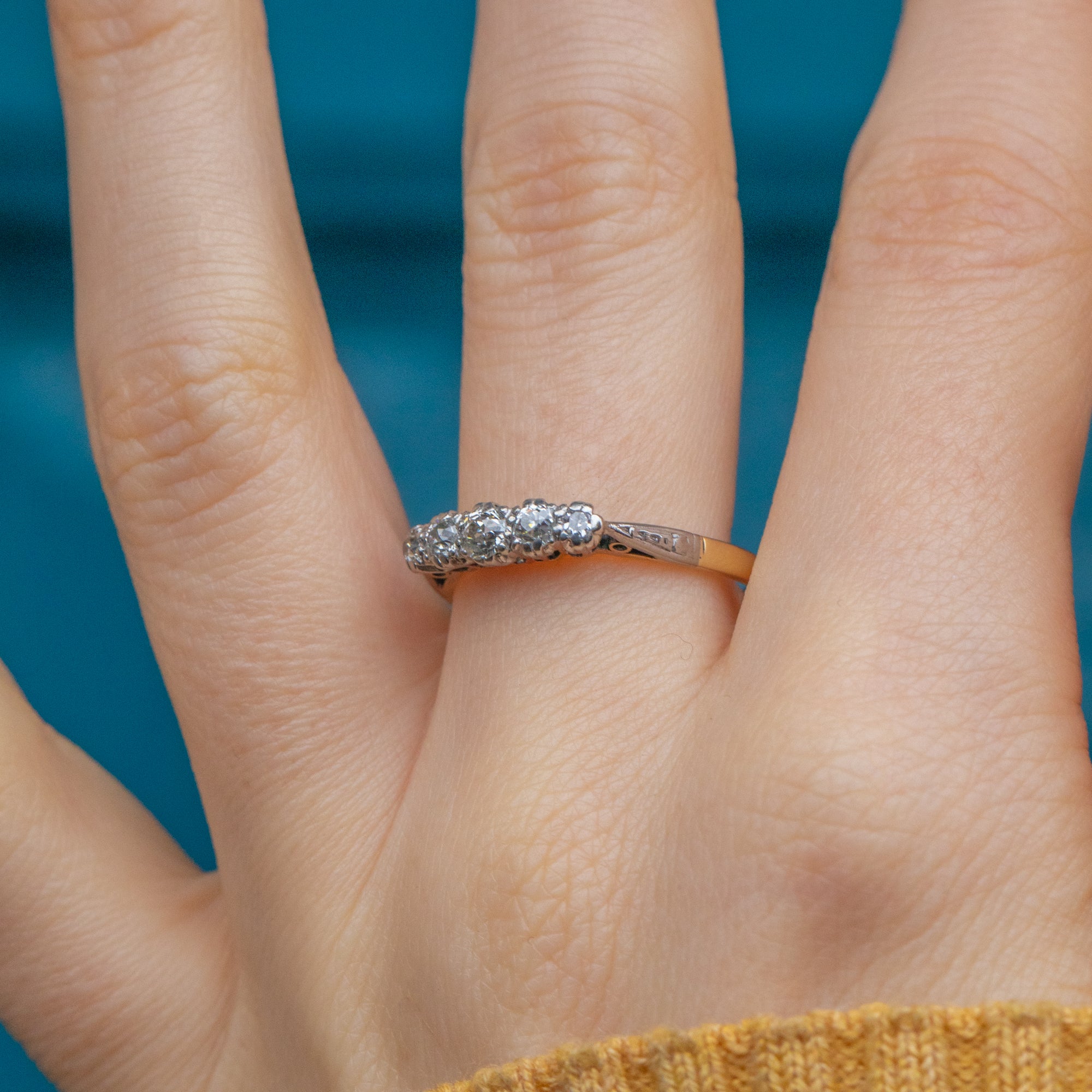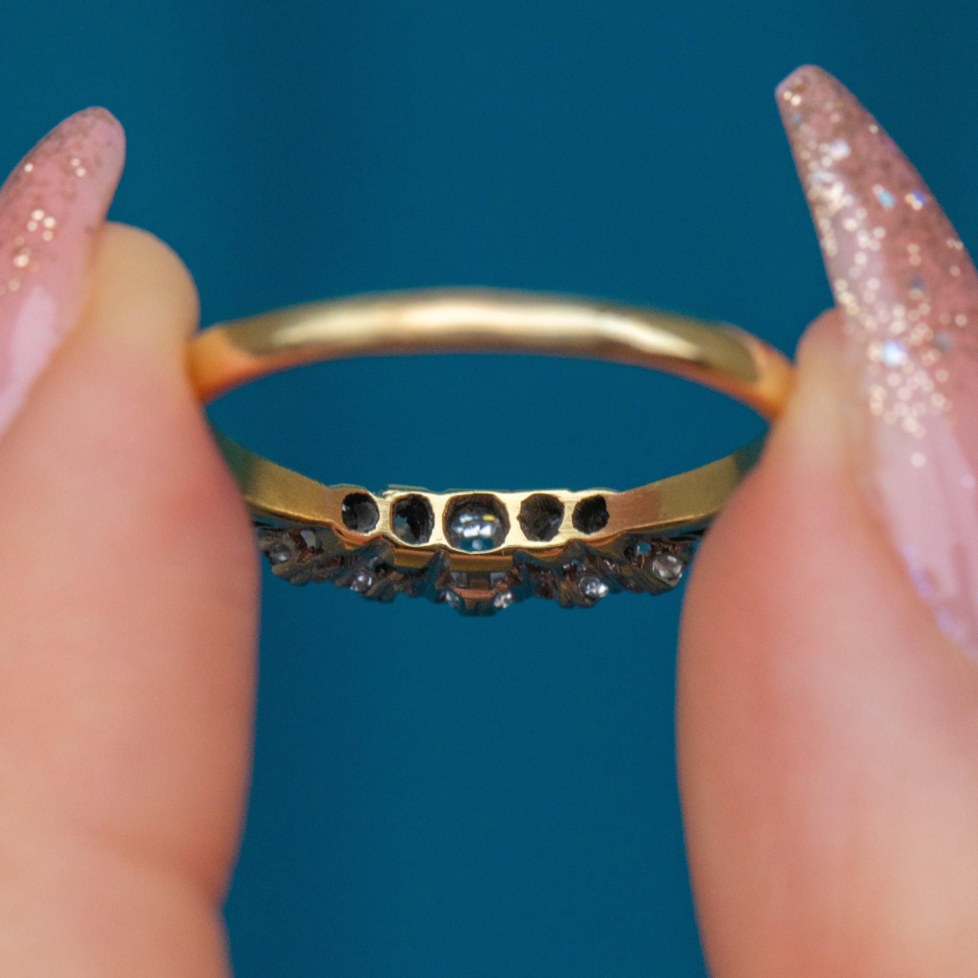 Five twinkling Diamonds sit on an 18ct Gold band, oozing glamour and sophistication as she sits on your finger. With a combined carat weight of 0.25ct, each Old-European cut Diamond scintillates in the light and sits comfortably within lustrous Platinum settings, flaunting a 4.5mm profile with her gorgeous gallery.