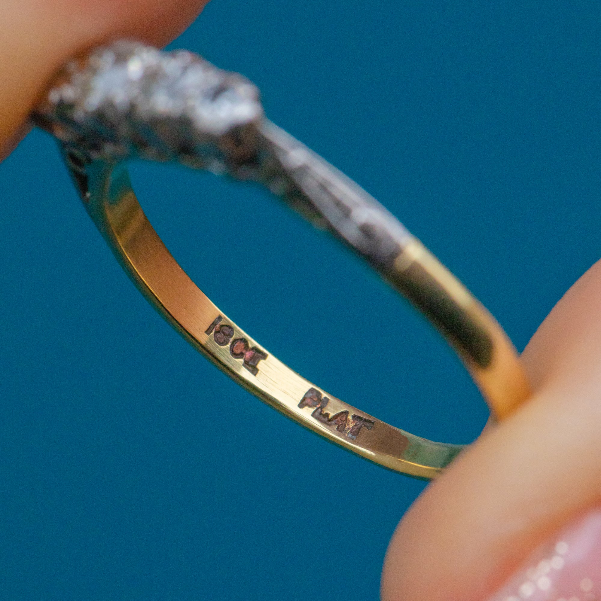 EXCELLENT: This Art Deco 18ct Gold and Platinum Diamond ring is in excellent condition. Each of her Diamond are free from any scuffs or scratches and sit comfortably within their Platinum settings. With little else to note, she is a must-have.