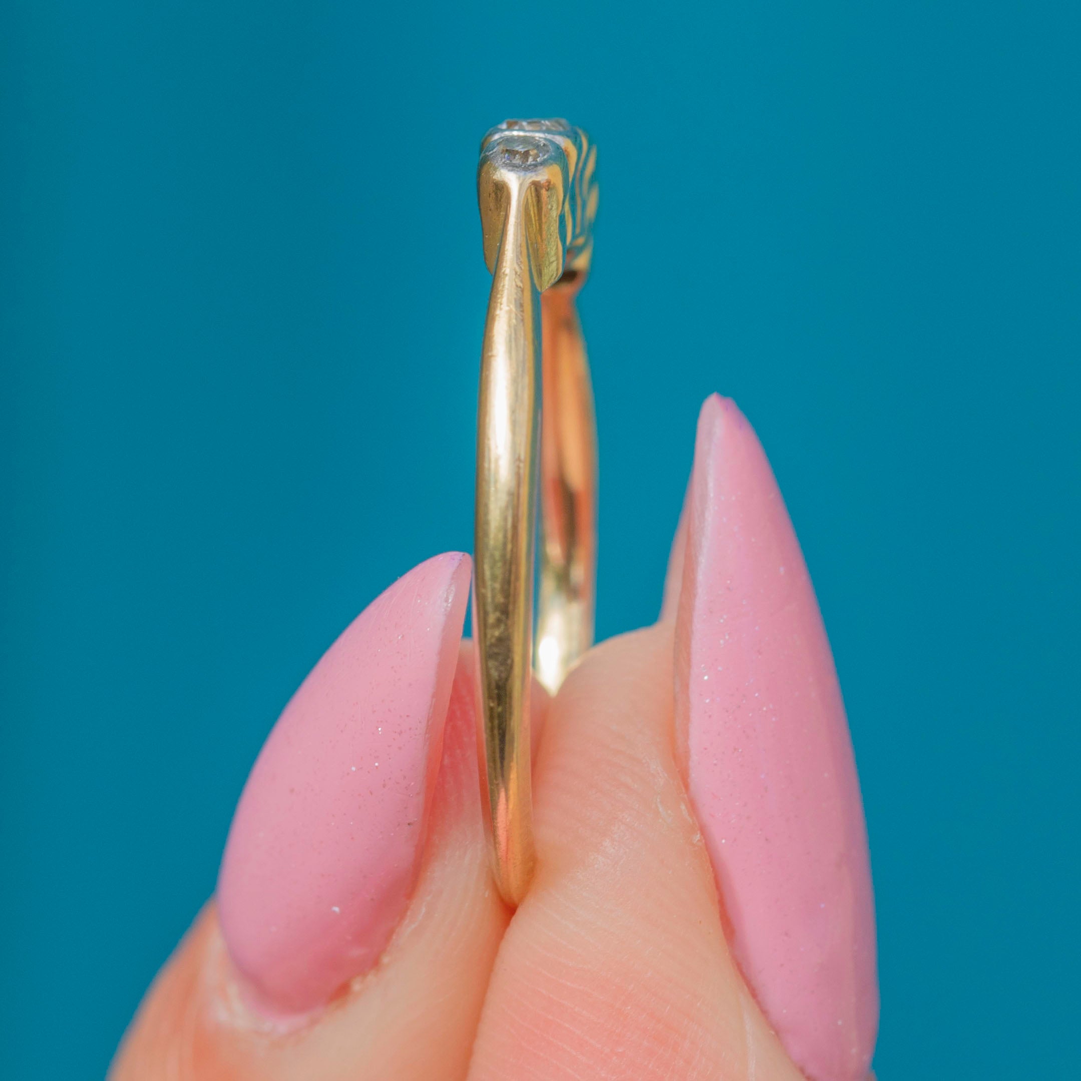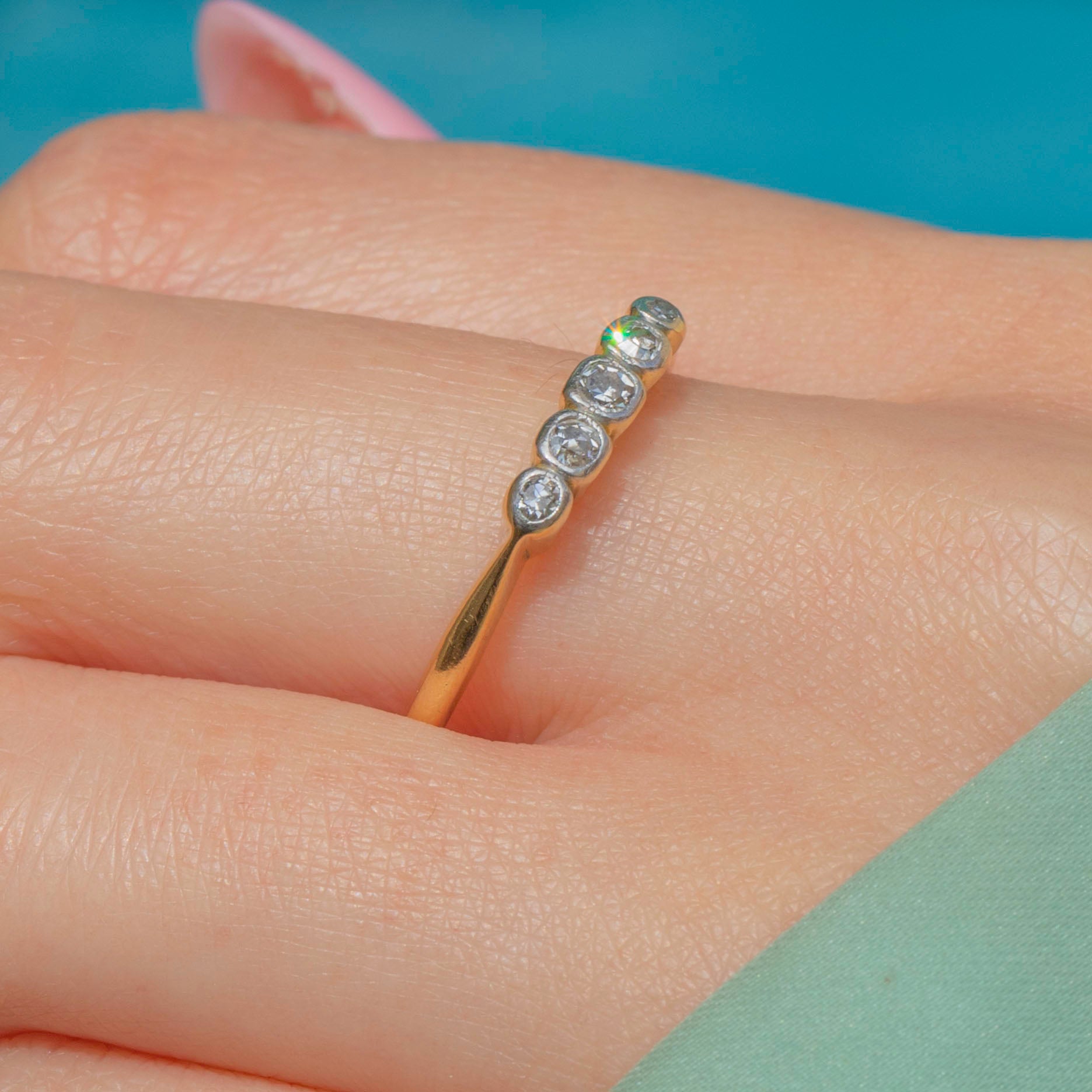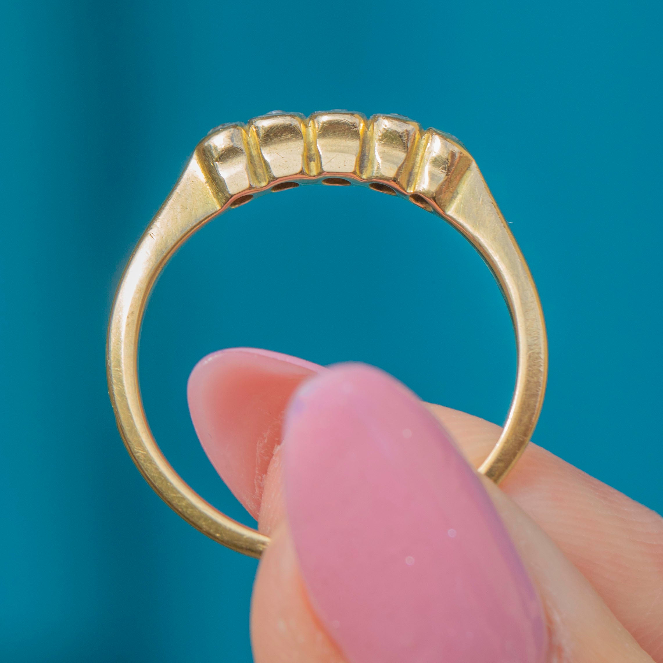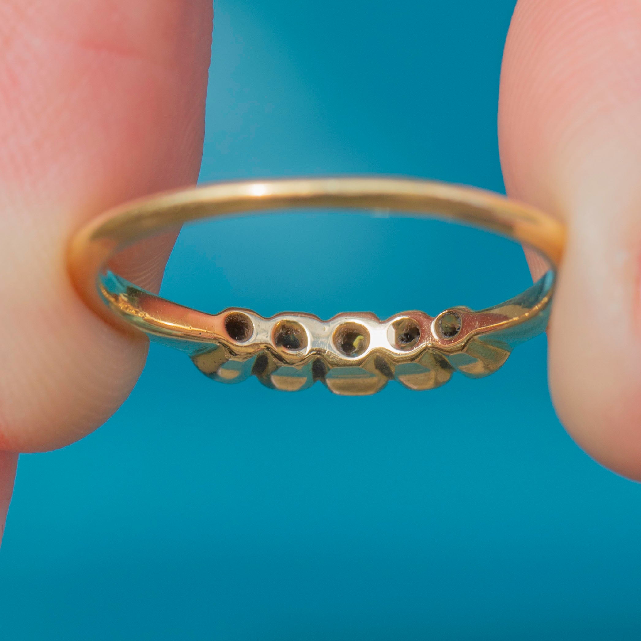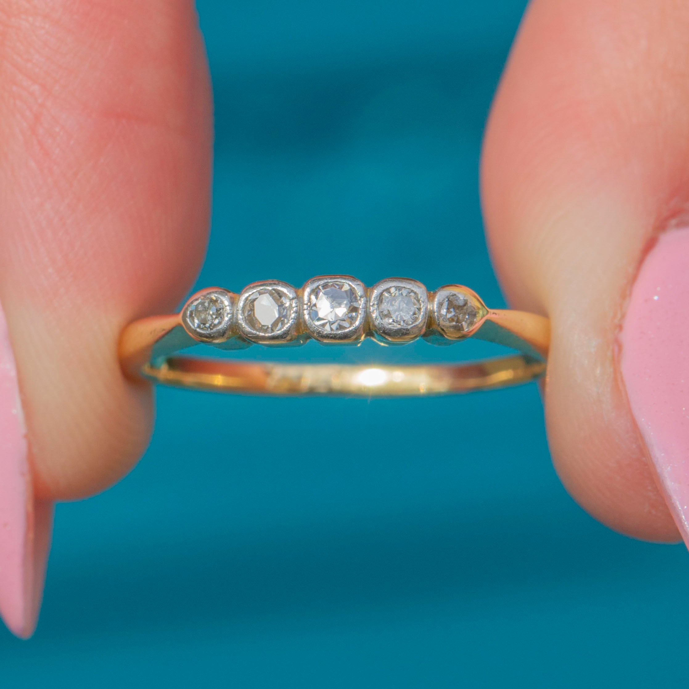 Featuring five graduating glittering Diamonds, this antique ring stuns from every angle! Each Diamond is set within glossy White Gold settings and sit on a buttery 18ct Gold band.