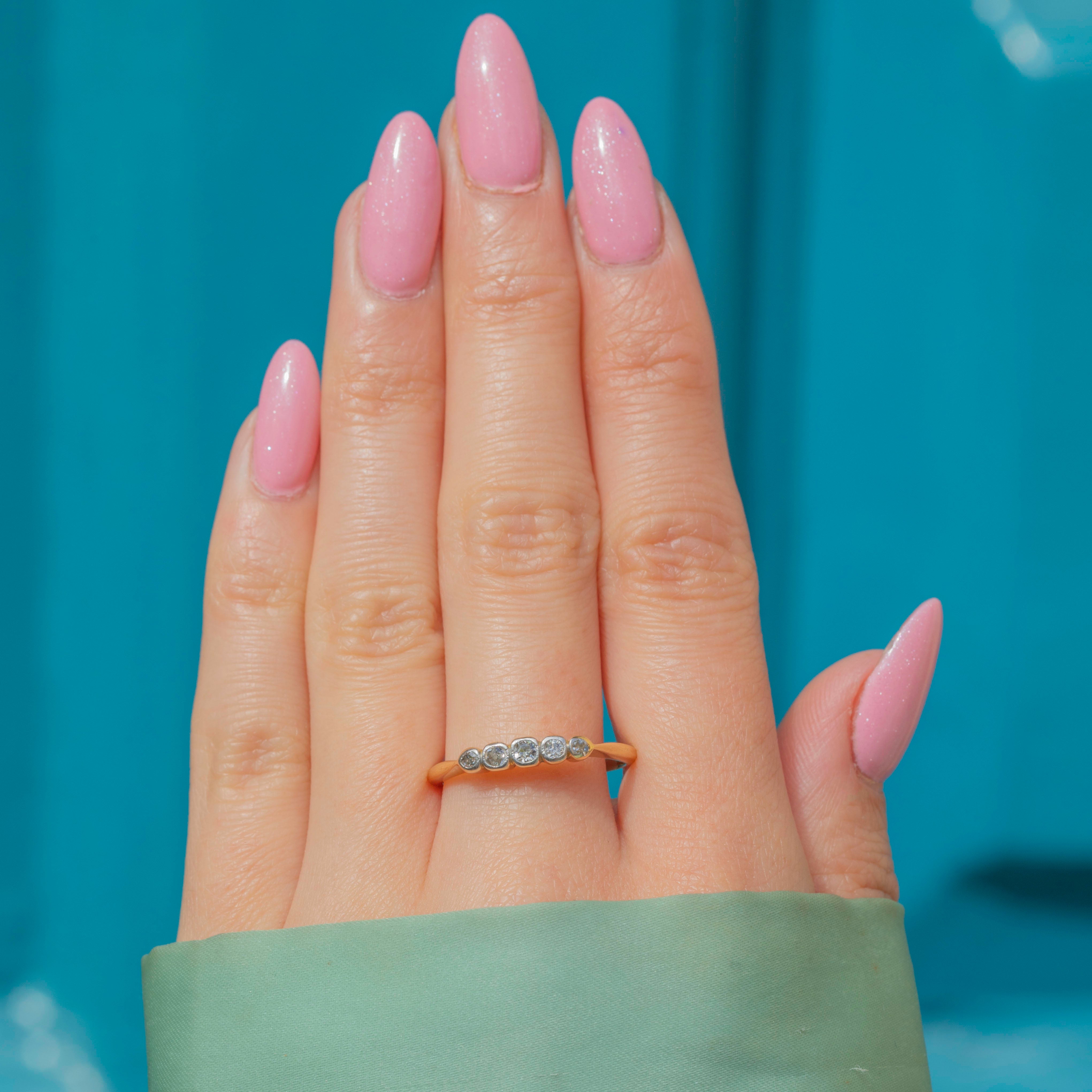 VERY GOOD-EXCELLENT: This Art Deco 18ct Gold and Platinum five stone ring is in very good to excellent condition. Each of the Diamonds are radiant and securely set within their White Gold settings. There is some minor surface wear commensurate with age but with little else to note, she is a must-have!