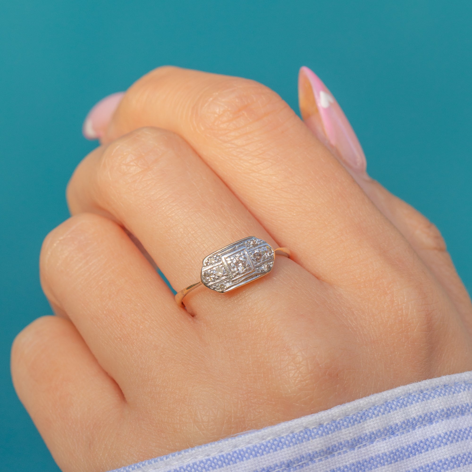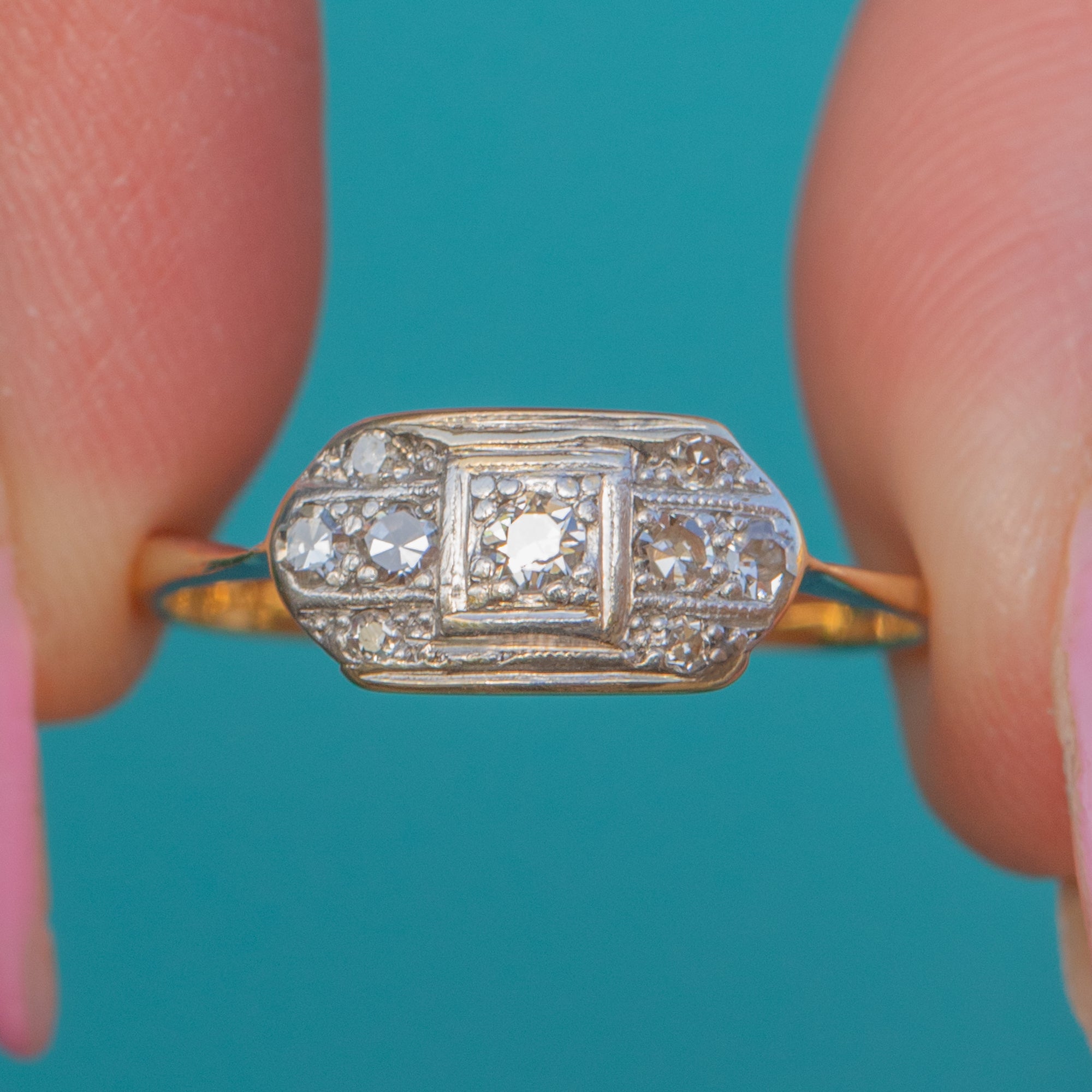 This elegant Art Deco ring showcases a refined geometric panel design, set with sparkling Diamonds in Platinum over an 18ct Gold band. The contrasting metals highlight the clean symmetry and precision craftsmanship so characteristic of the 1920s and 1930s.