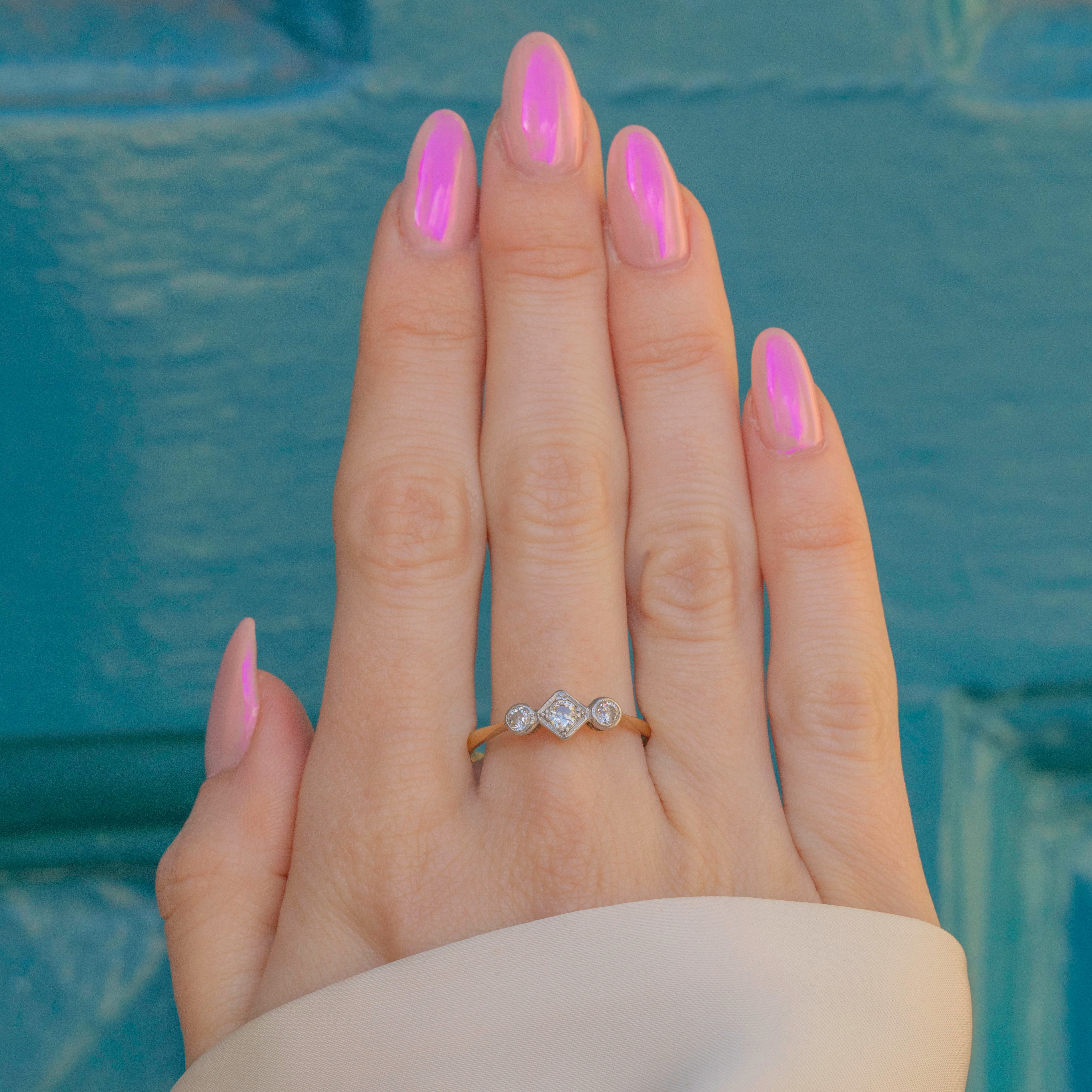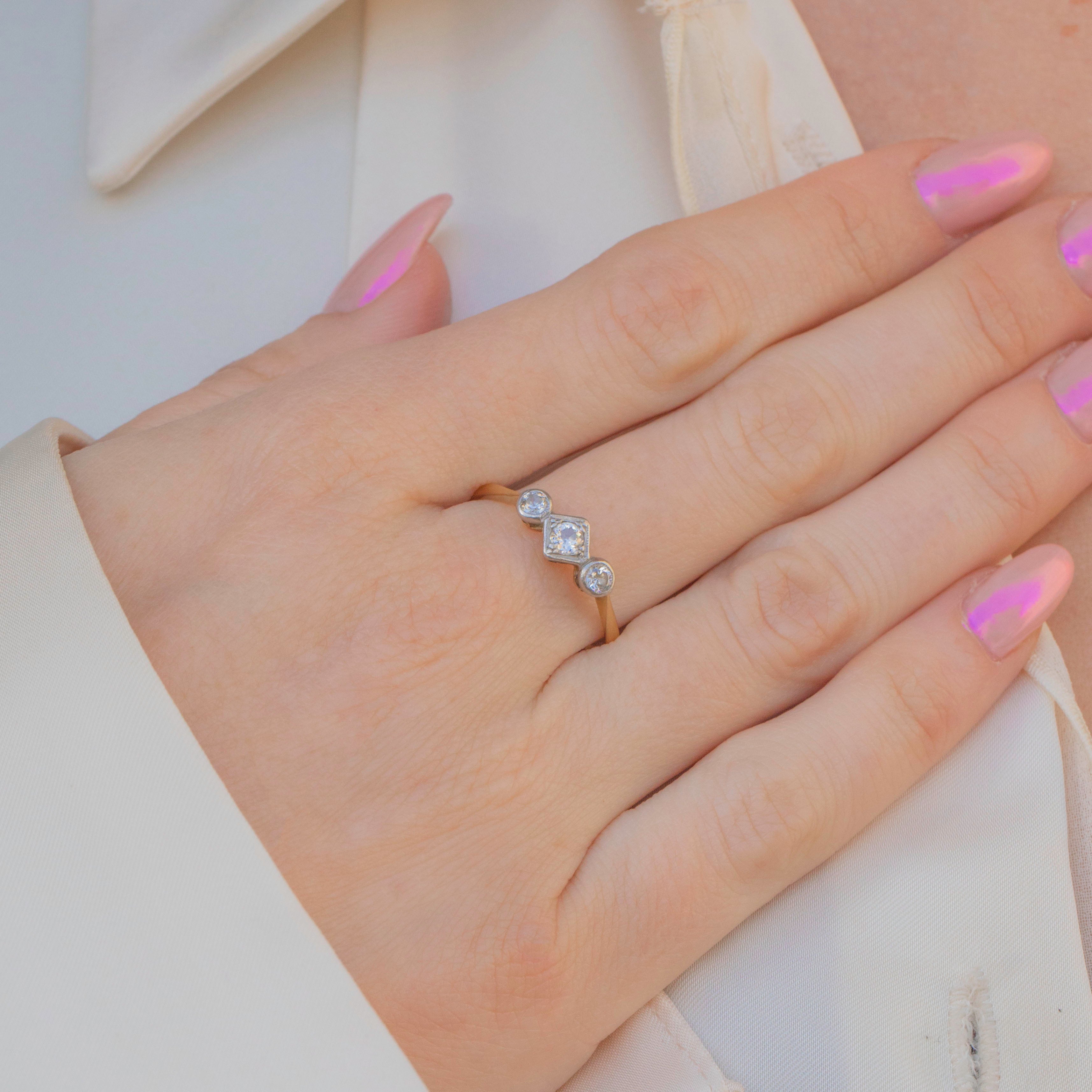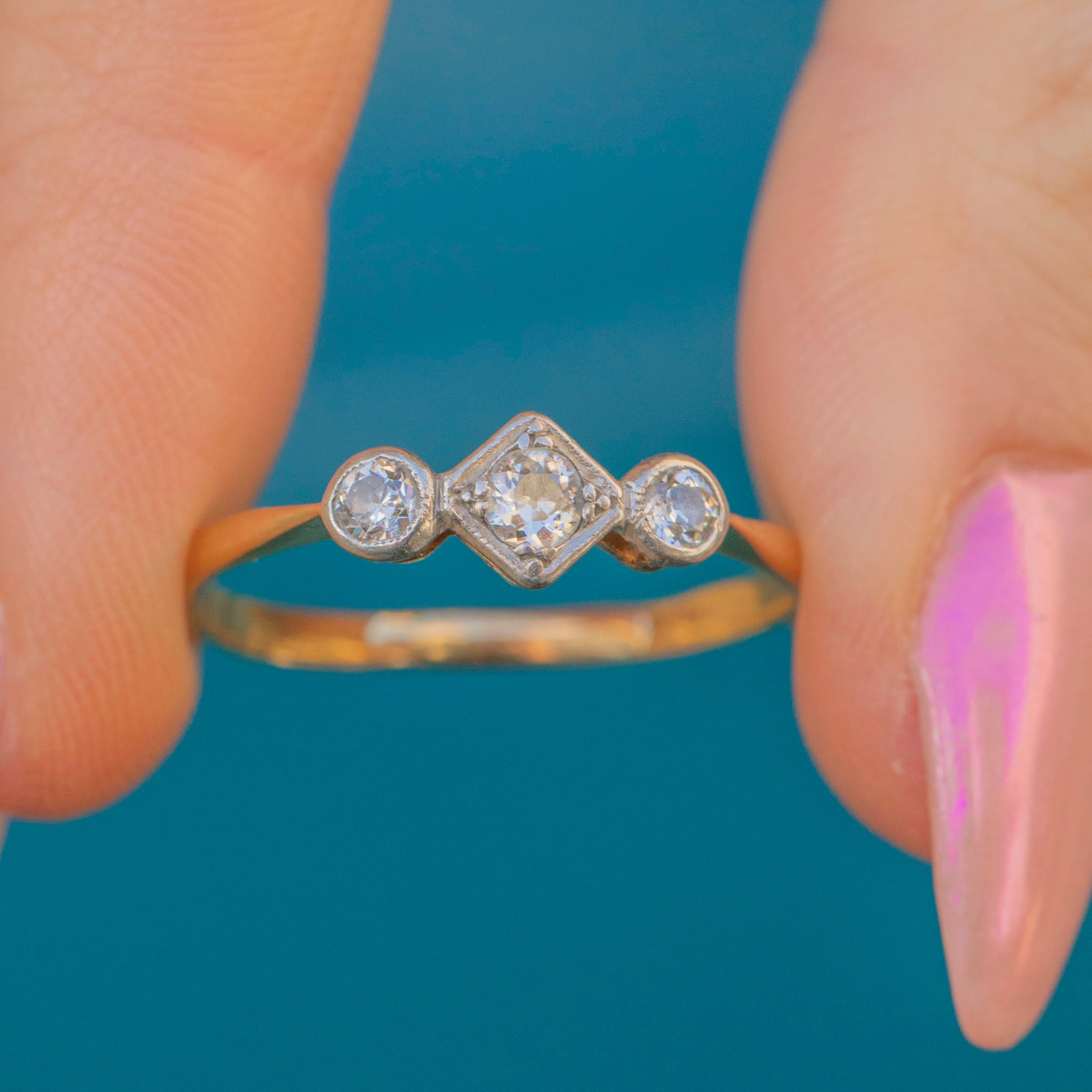 This Art Deco 18ct Gold & Platinum Diamond three stone ring is stylish and sophisticated, and would make the most wonderful choice for a unique engagement ring!