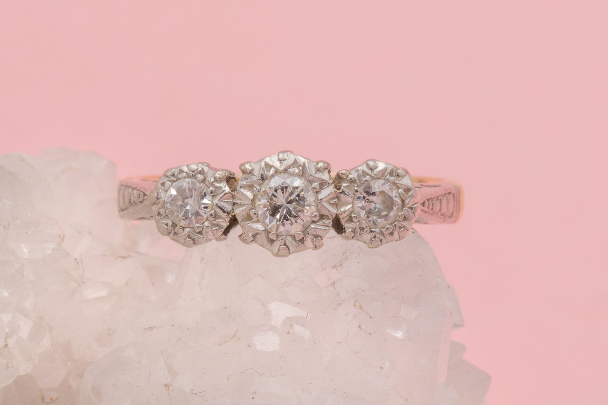 This Art Deco 18ct Gold & Platinum Diamond trilogy engagement ring is a real beauty. Crafted from robust, buttery 18ct Gold and complete with Platinum settings, this piece is delightful in its entirety!