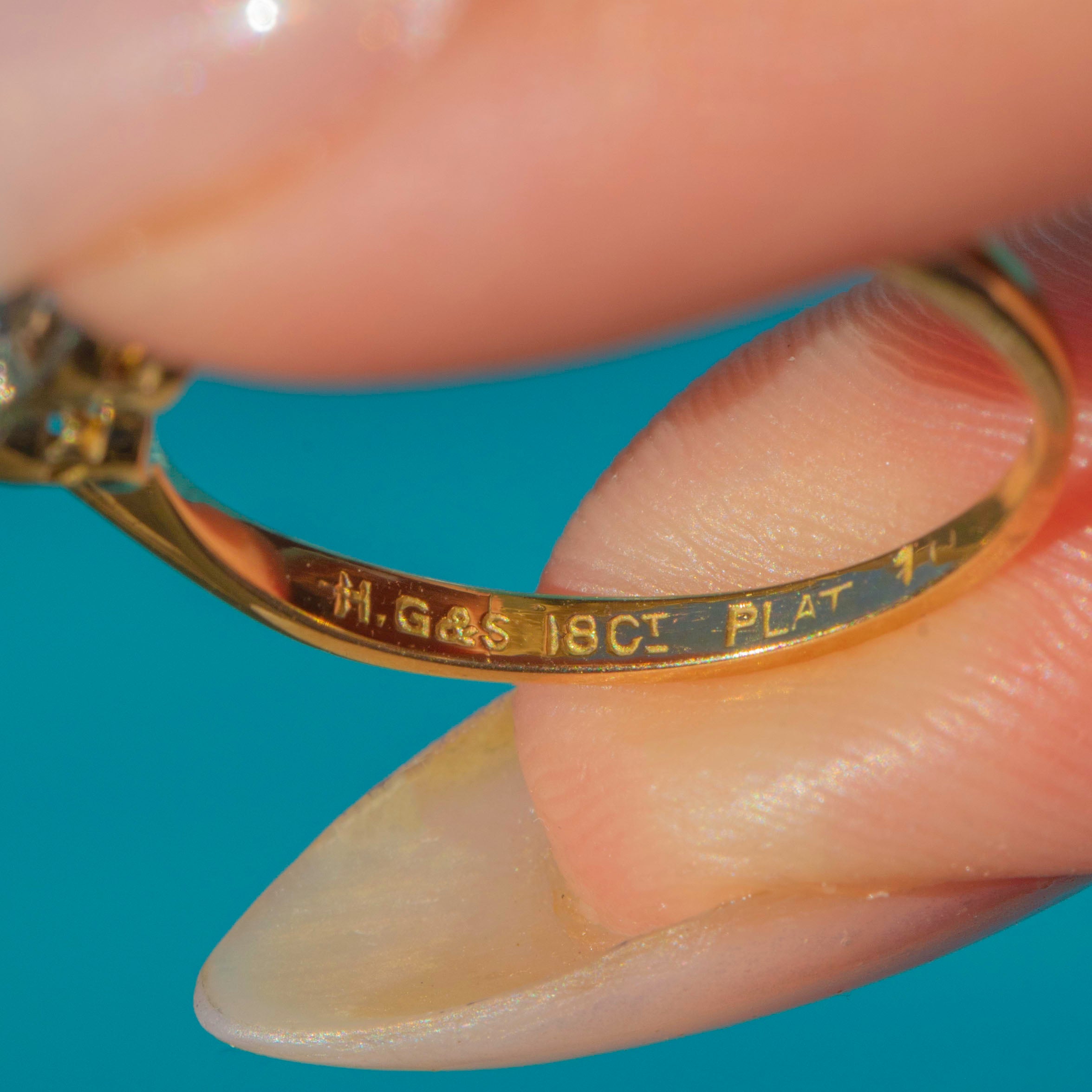 EXCELLENT: The Diamonds are bright with no chips, scuffs or abrasions. Bezel settings are smooth and secure. Band shows no resizing marks and is suitable for future resizing if required. Clear antique hallmarks for “H.G. & S”, “18CT” and “PLAT” remain inside the shank.