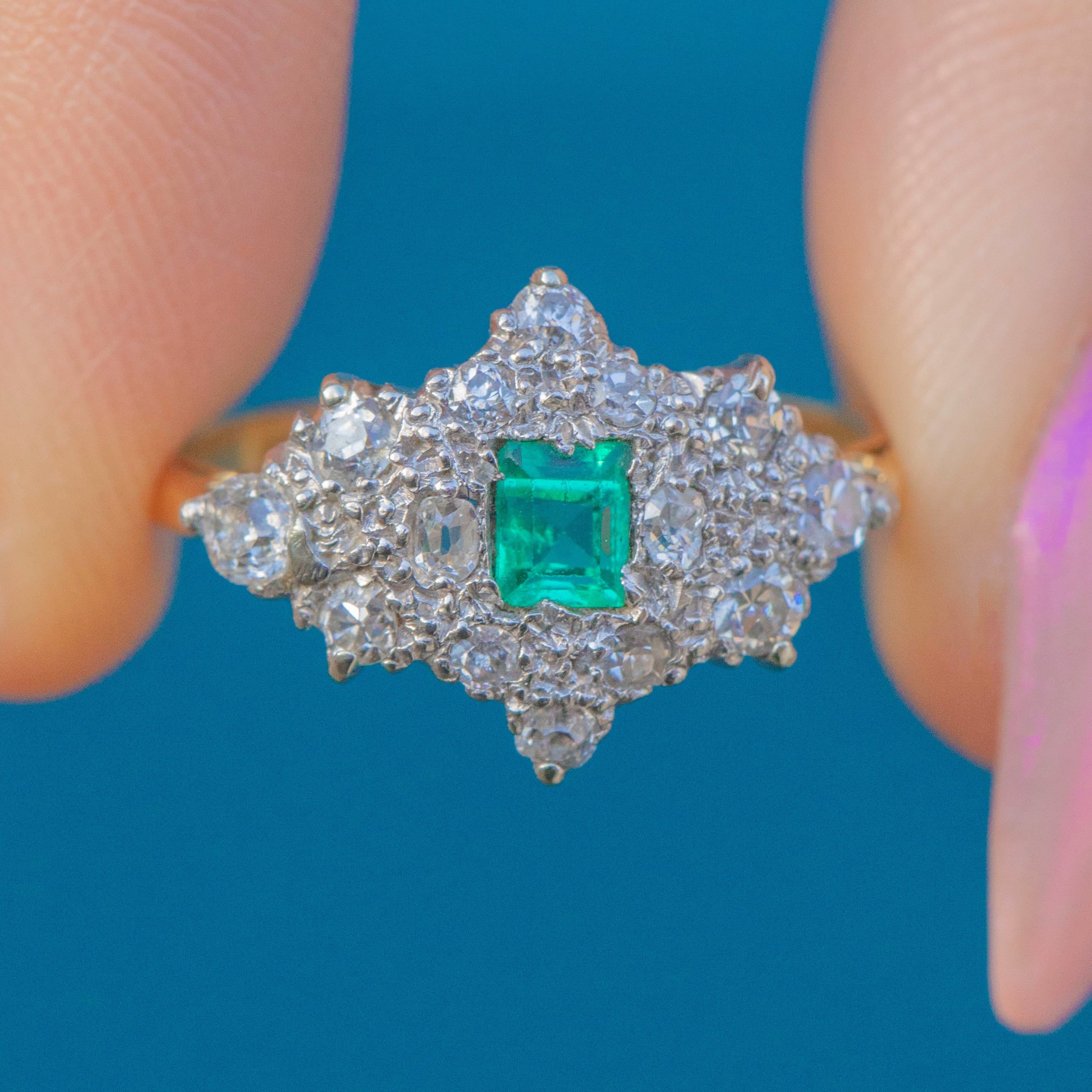 We adore this Art Deco 18ct Gold & Platinum Emerald Diamond cluster ring! This captivating ring, circa 1940, has been crafted from a combination of luxurious 18ct yellow and Platinum and is set with a vivid evergreen Emerald and haloed by an extravagant cluster of Diamonds.