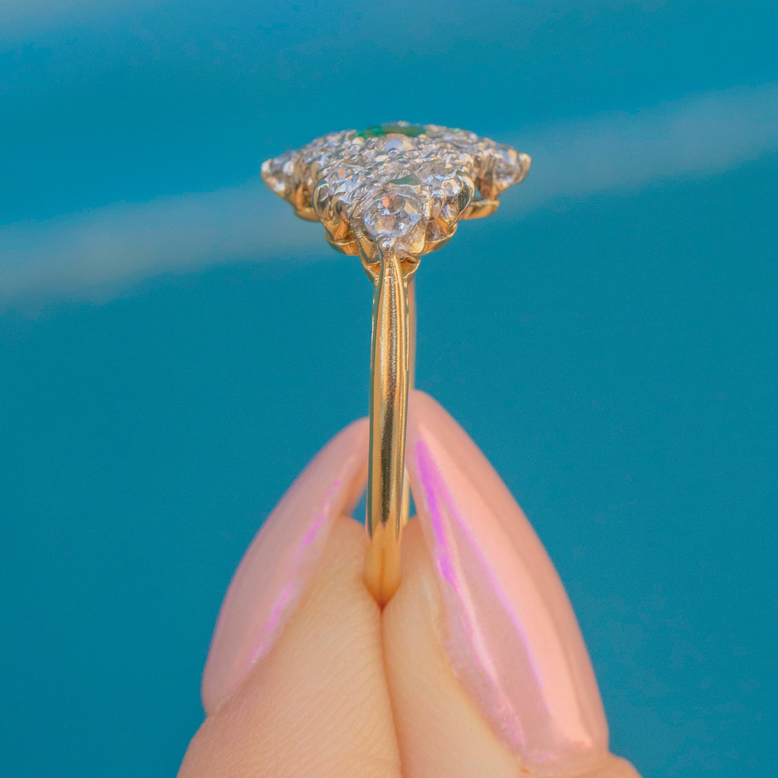 VERY GOOD. This Art Deco 18ct Gold & Platinum Emerald Diamond cluster ring is presented in very good condition. All her gemstones are present and securely set in their Platinum settings. Although there is a scratch on the front of the Emerald, as well as a few scuffs on the back, this is only truly visible under close inspection and hardly affects the overall image of the ring. Put this ring on, and you truly won't want to take her off!