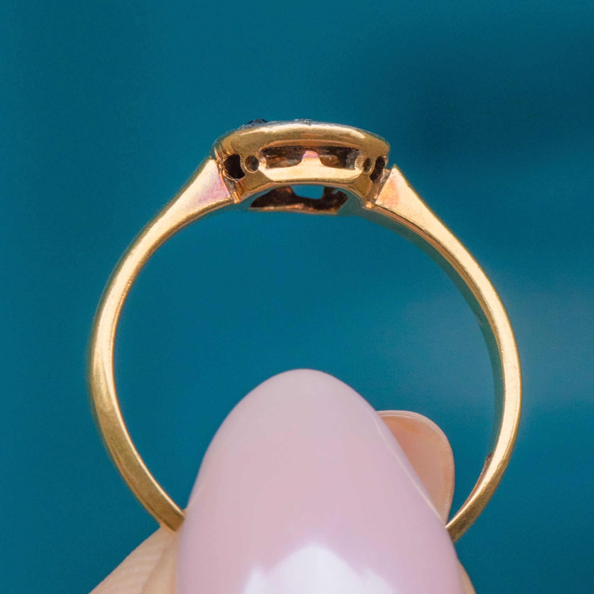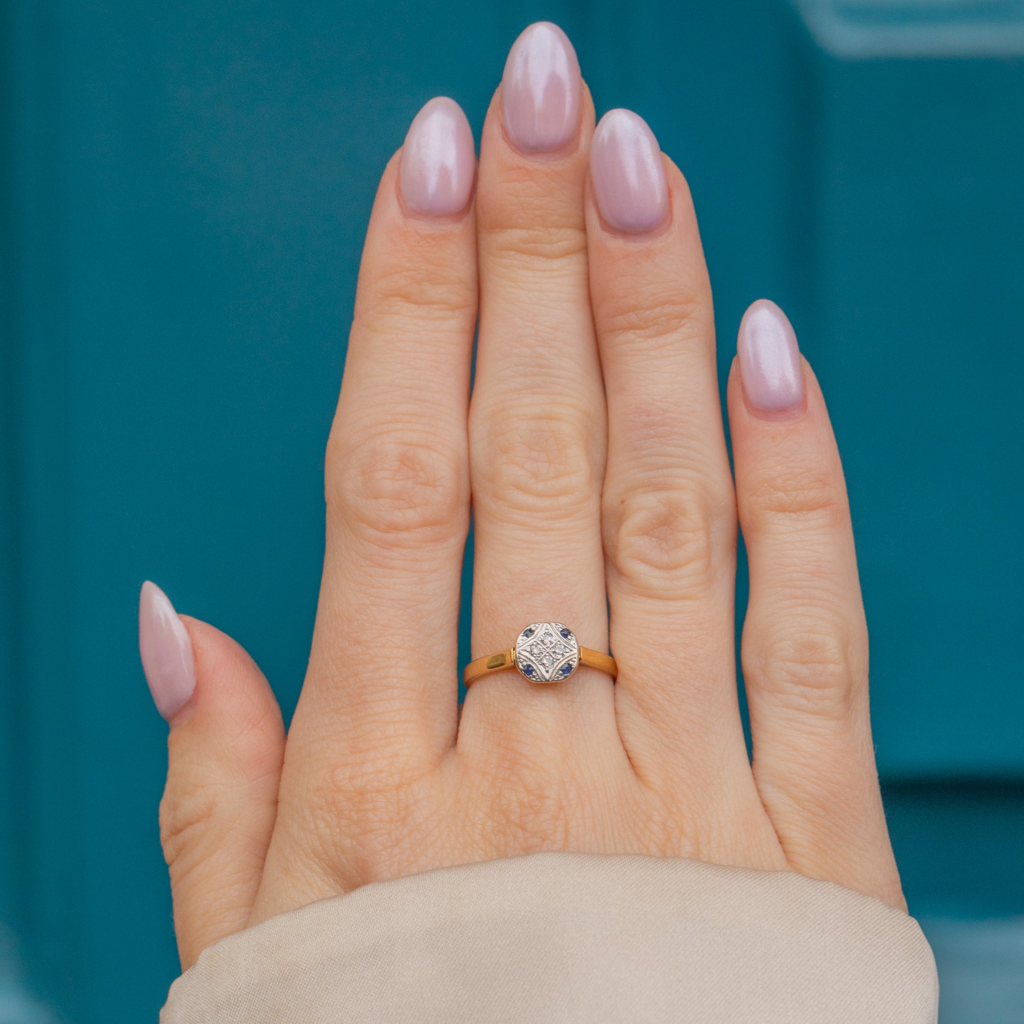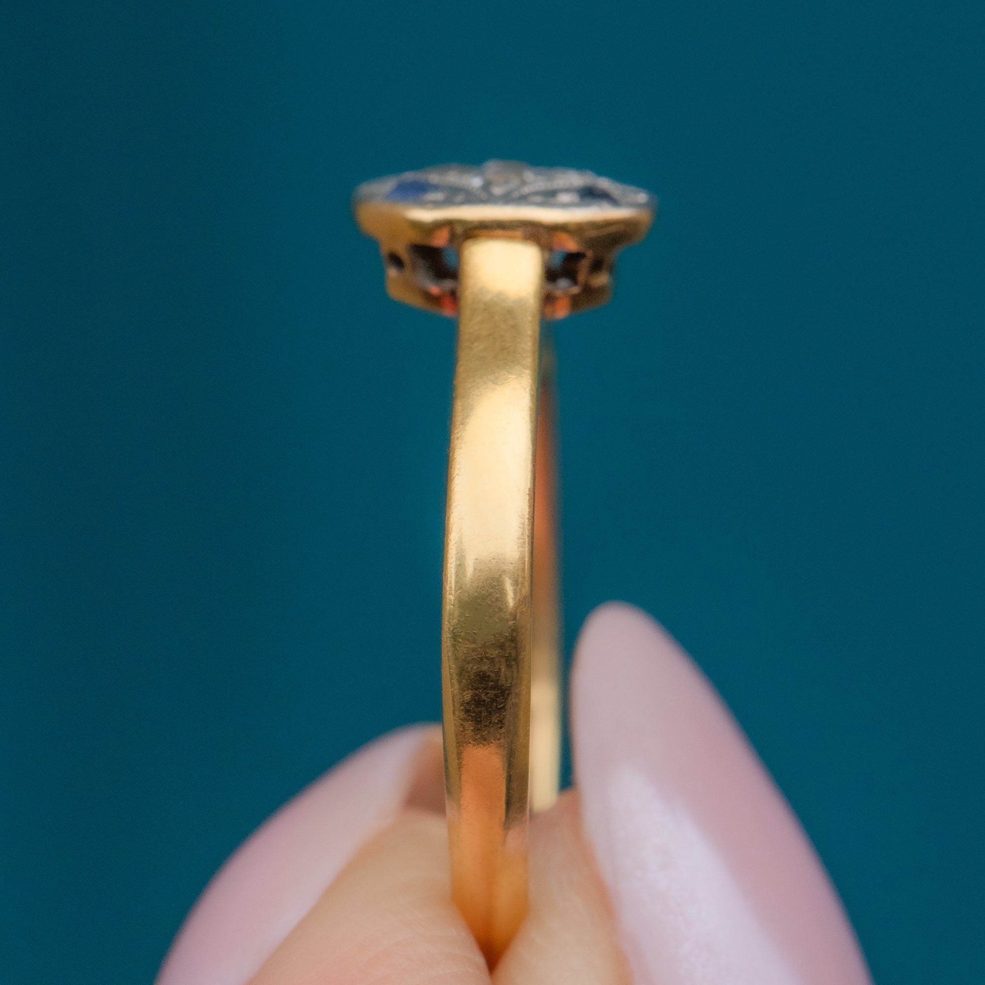 This Art Deco 18ct Gold and Platinum Sapphire Diamond ring will make an elegant addition to any ring stack. Flaunting midnight blue Sapphires and scintillating Diamonds set into lustrous Platinum, this antique Diamond ring is giving splendour.