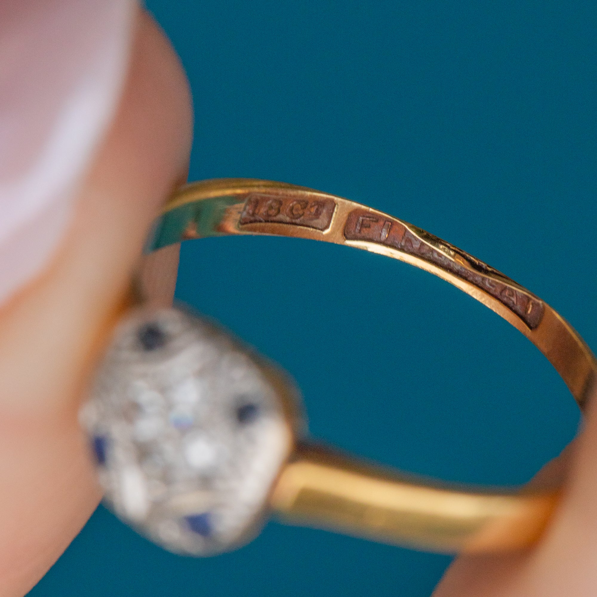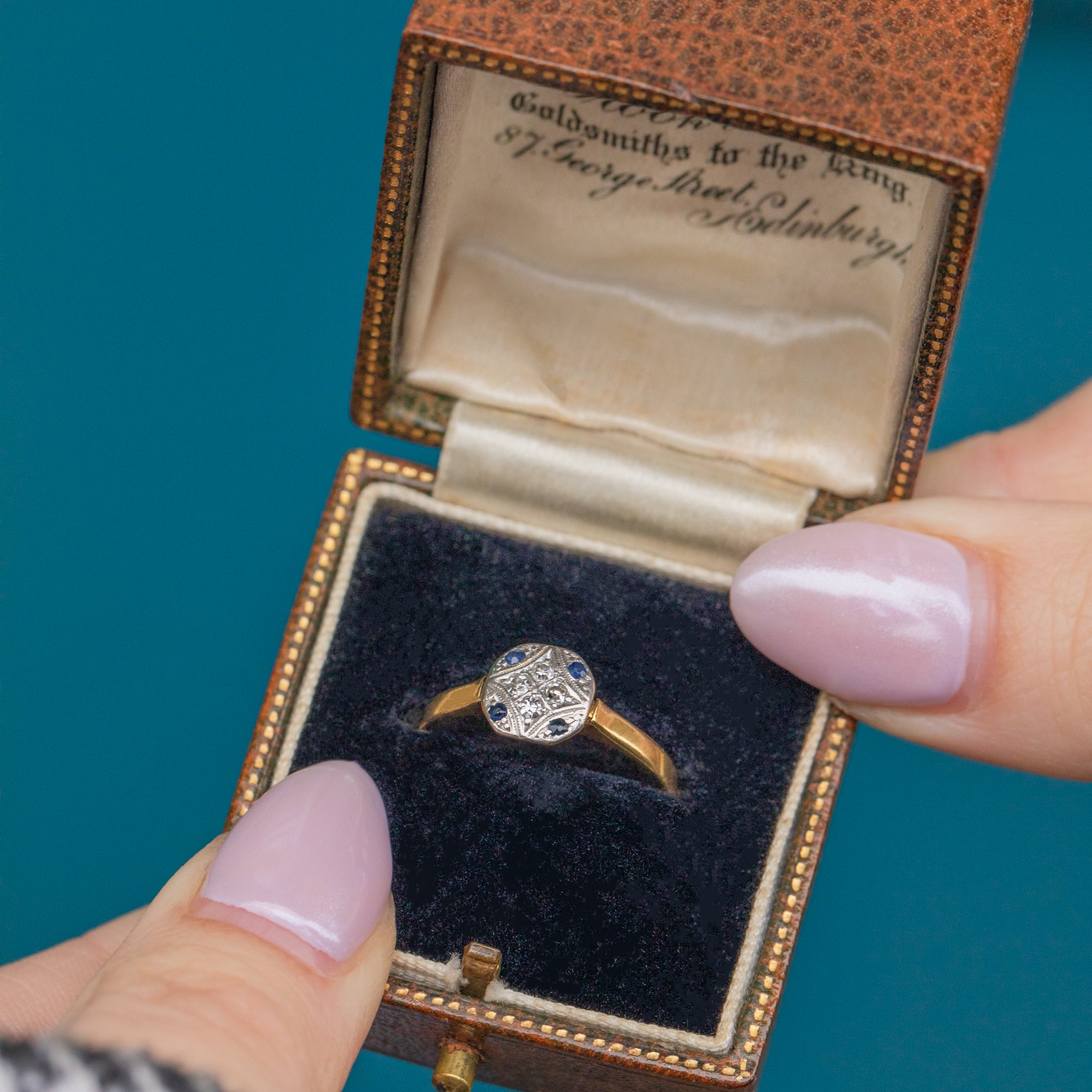 VERY GOOD. This Art Deco 18ct Gold and Platinum Sapphire Diamond ring is in very good condition! The Diamonds and Sapphires are secure within their illusion settings, with millgrain detailing for a classic early 20th century touch. The back of the ring band has some damage and is slightly misshapen, but rest assured she sits comfortably as she adorns your hand. With a thick 18ct Gold shank that hugs your finger, you can wear this Art Deco Diamond ring with confidence!