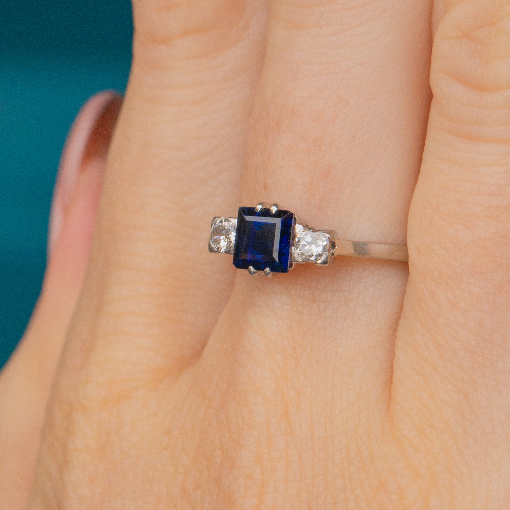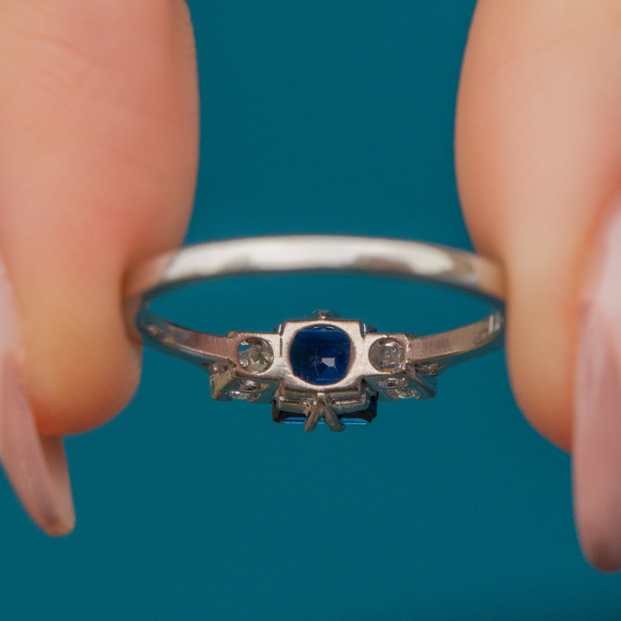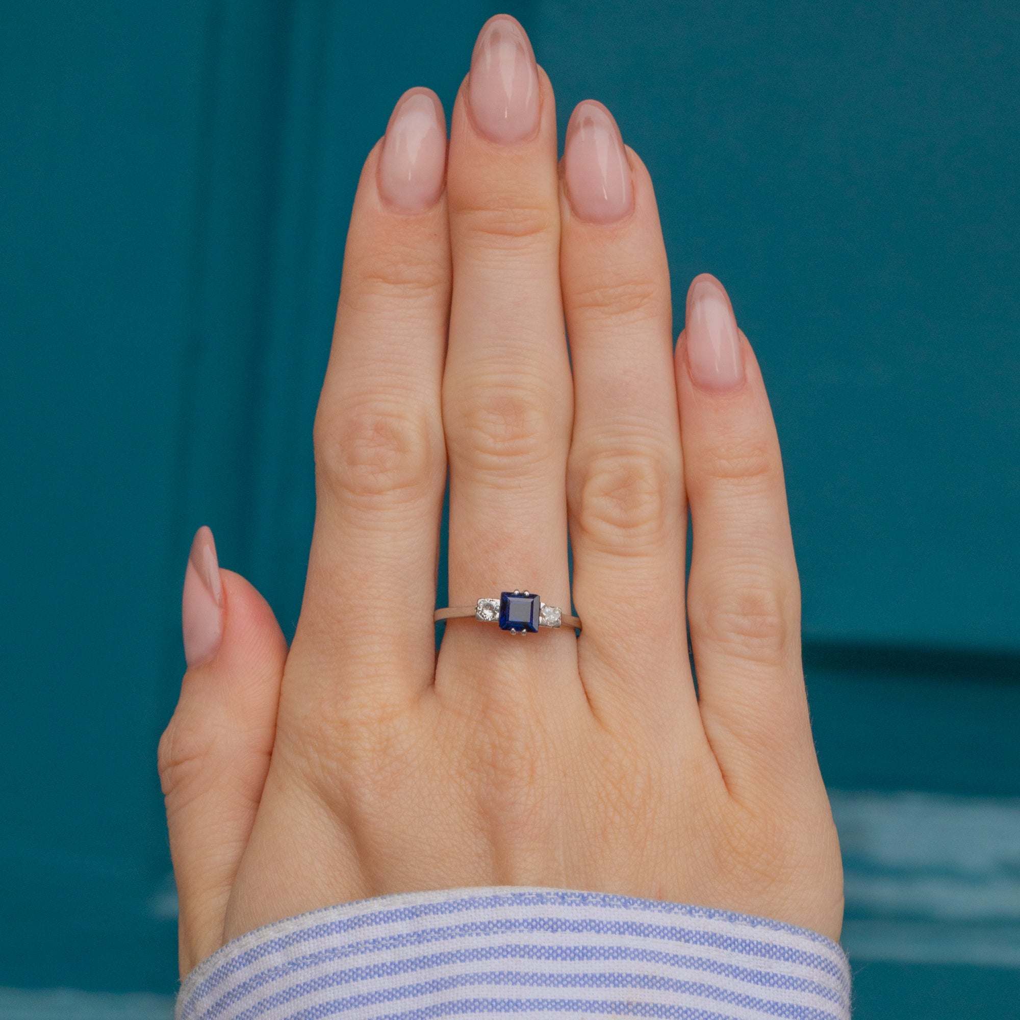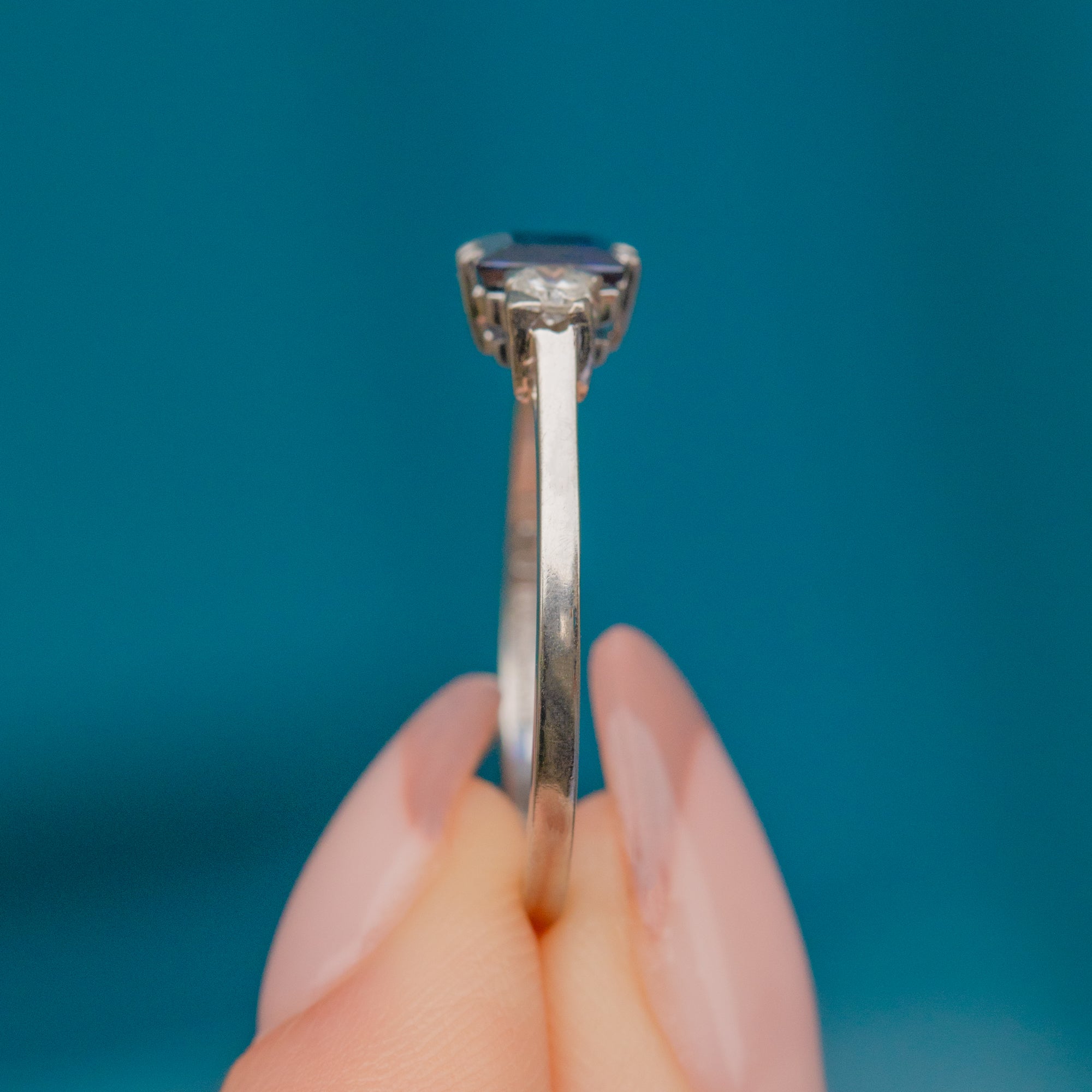 This ring may be subtle, but she is certainly sparkly! The 18ct White Gold has a fabulous highly reflective polish, and the midnight blue Sapphire will set off shooting stars in your heart. You will also love the unique addition of the square-cut Sapphire held firm by the Platinum settings.