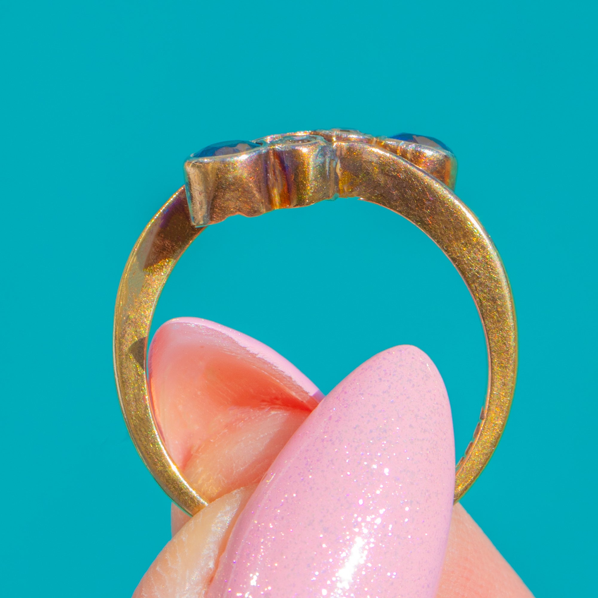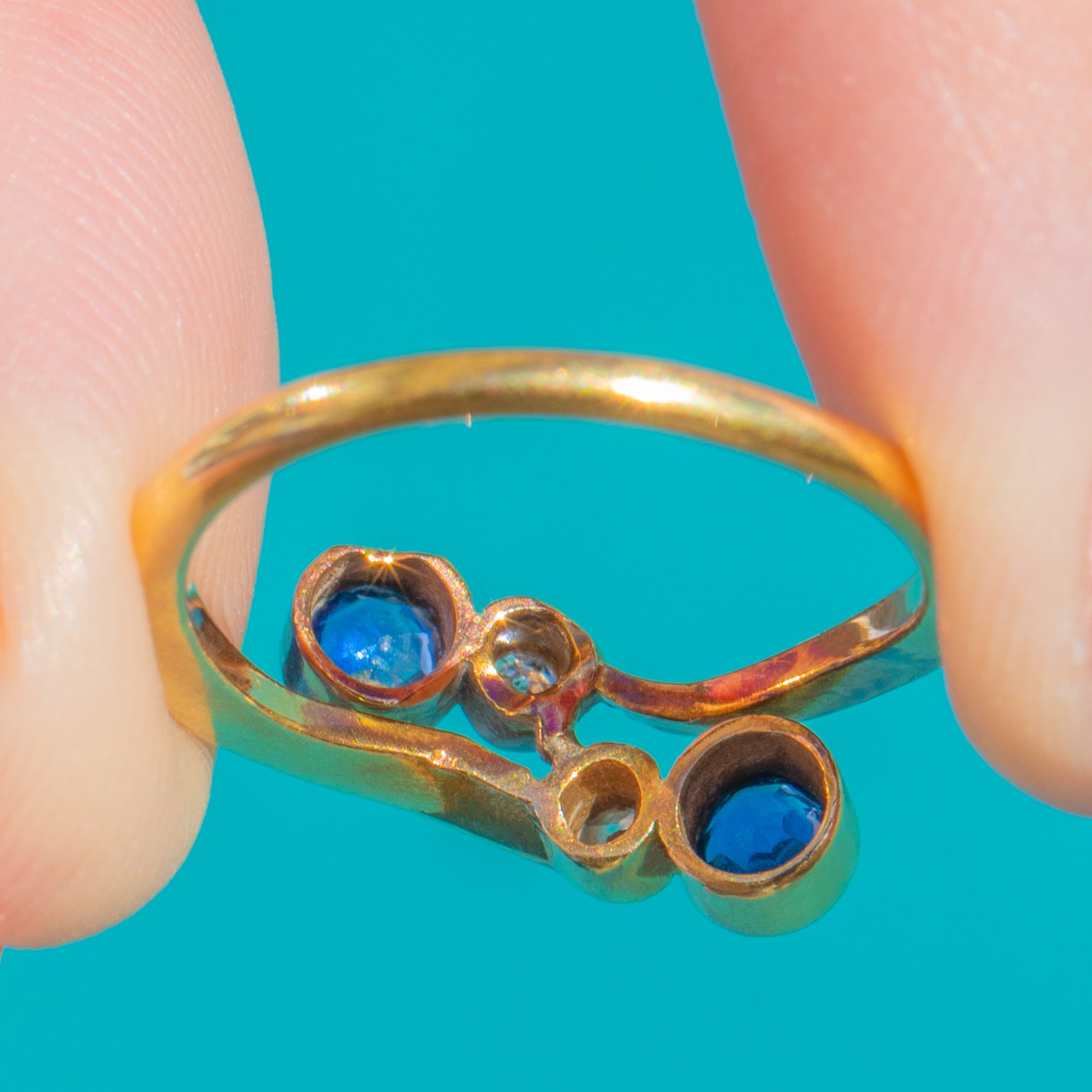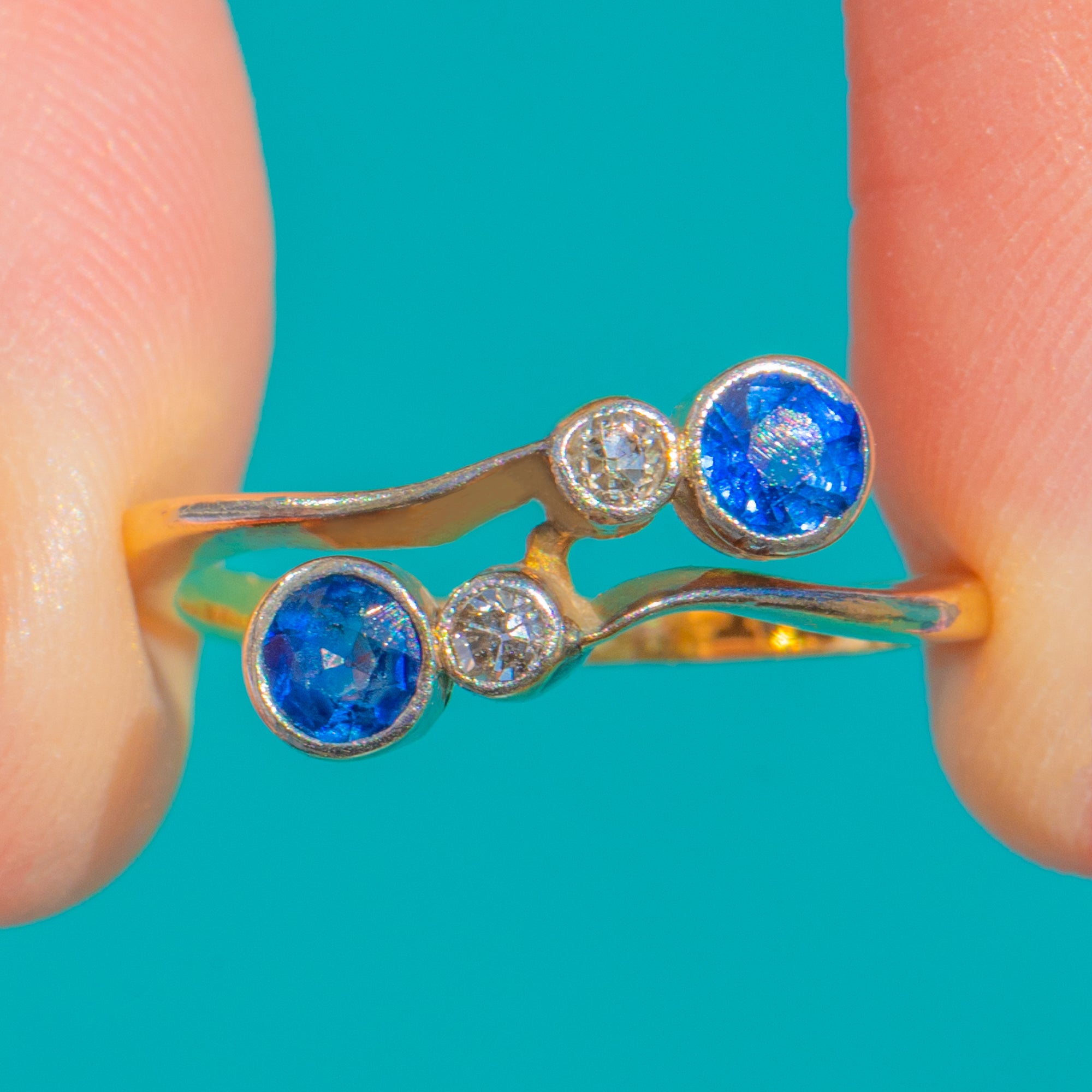 A classic Art Deco twist ring that marries warm 18ct Gold with cool Platinum for timeless contrast. Two round, velvety-blue Sapphires are set in low Platinum bezels and accented by petite Diamonds, forming an elegant, linear twist that glides across the finger.