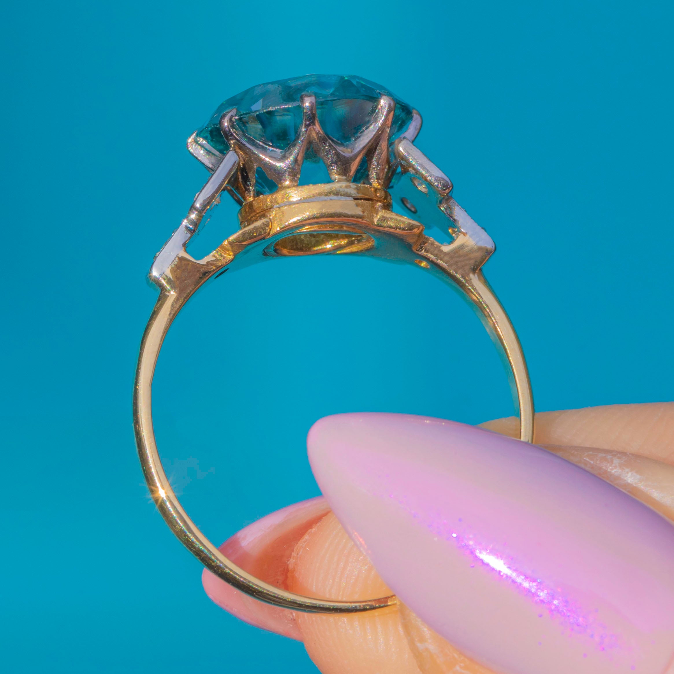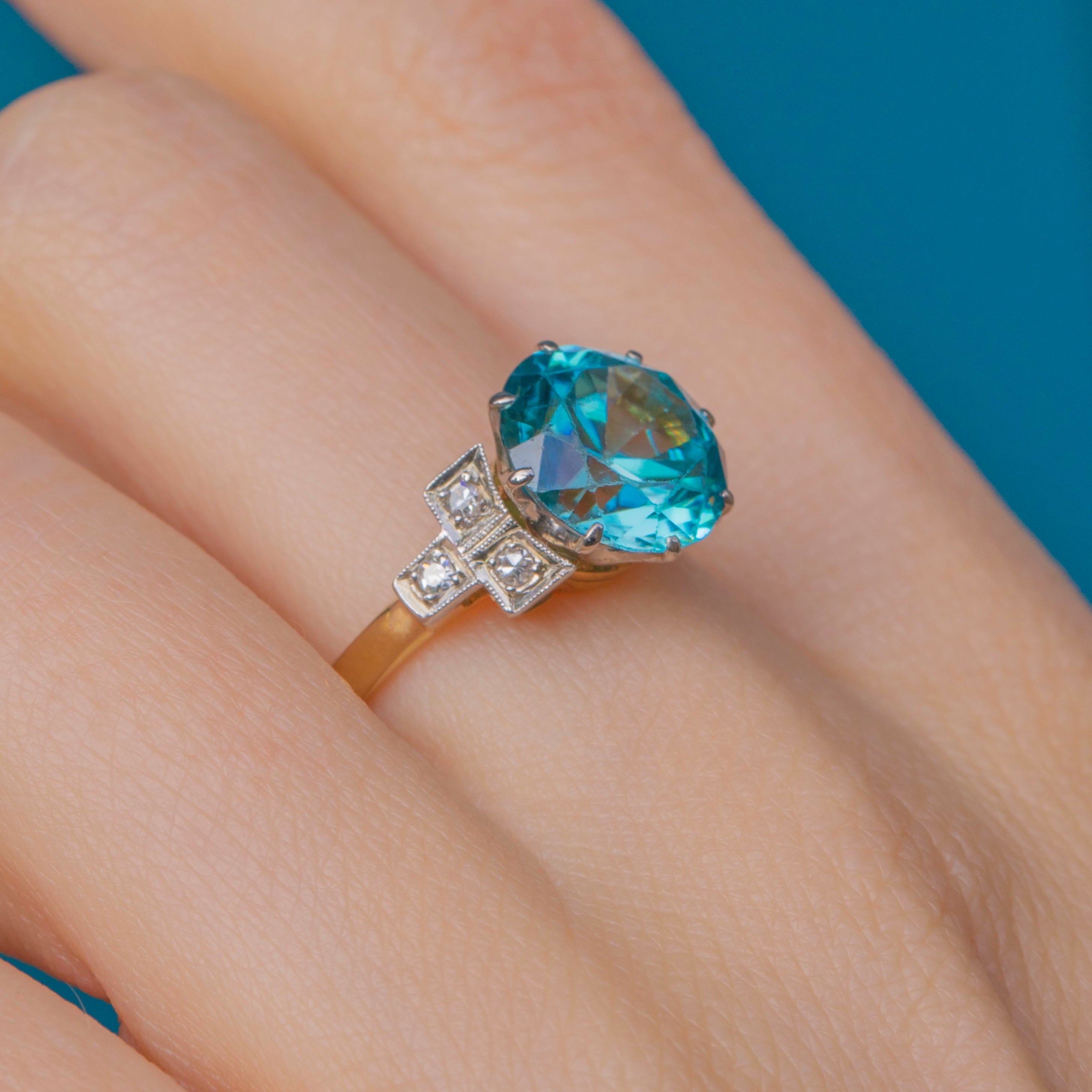 An impressive Art Deco cocktail ring showcasing a vibrant natural 5.00ct Zircon of exceptional colour and brilliance. The striking “Starlite” blue Zircon displays the vivid fire and sparkle that make this gemstone so prized. It’s beautifully framed by structured step shoulders set with three tiny Diamonds on each side, a hallmark of 1920s design.